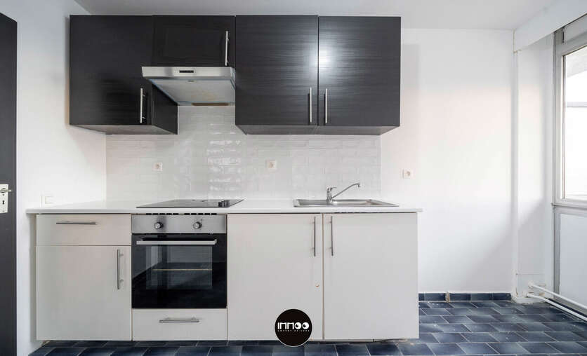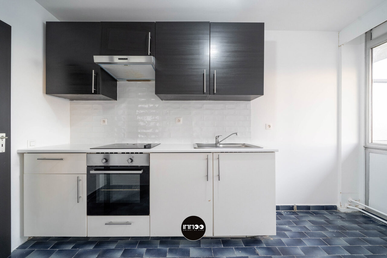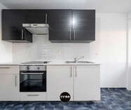 De ruime, open leefruimte baadt in het licht en vormt het hart van het appartement. Aansluitend bevindt zich de aparte, volledig uitgeruste keuken, stijlvol afgescheiden en afgewerkt met een karaktervolle blauwe tegel die zorgt voor een unieke en hedendaagse uitstraling.