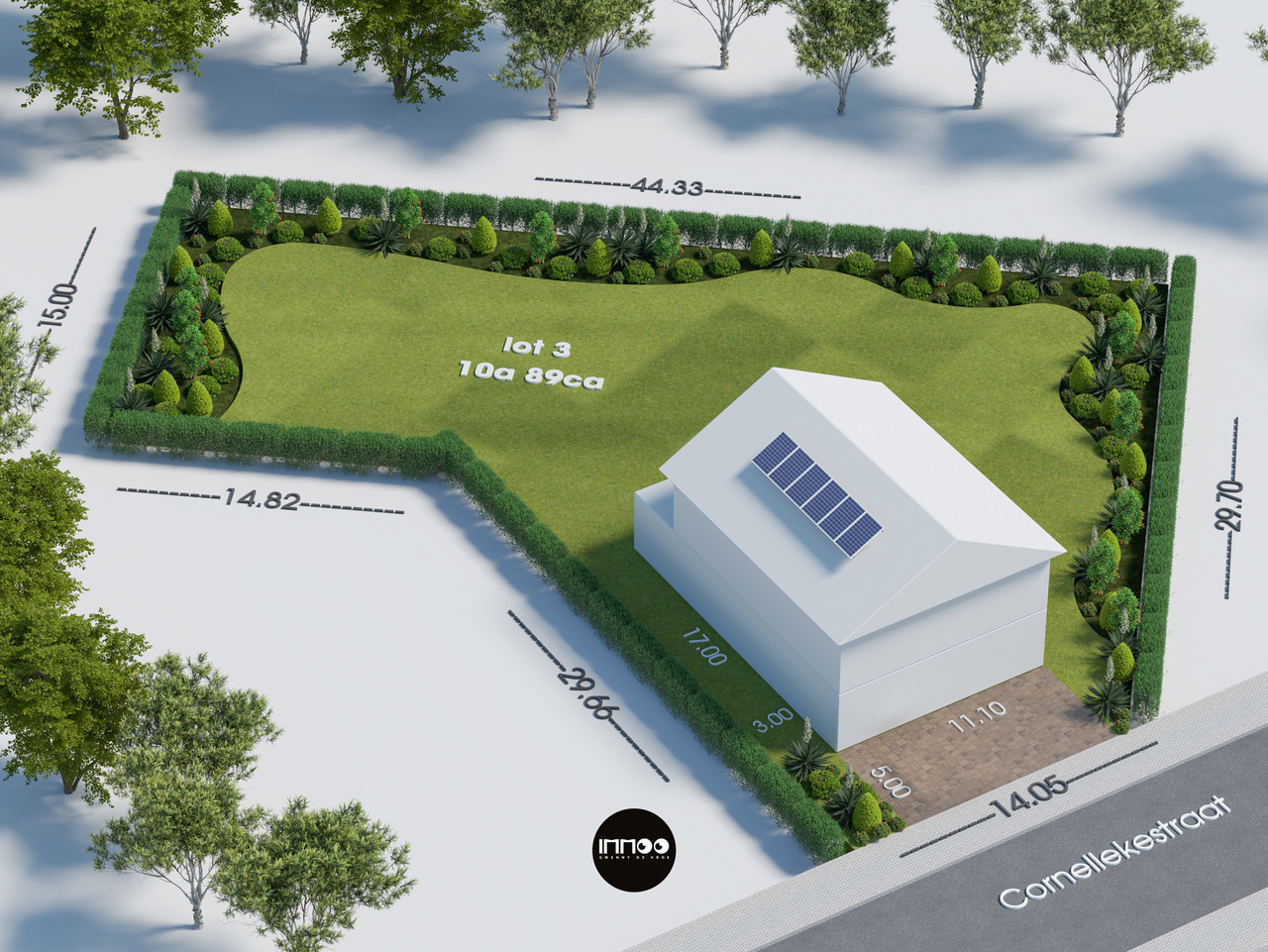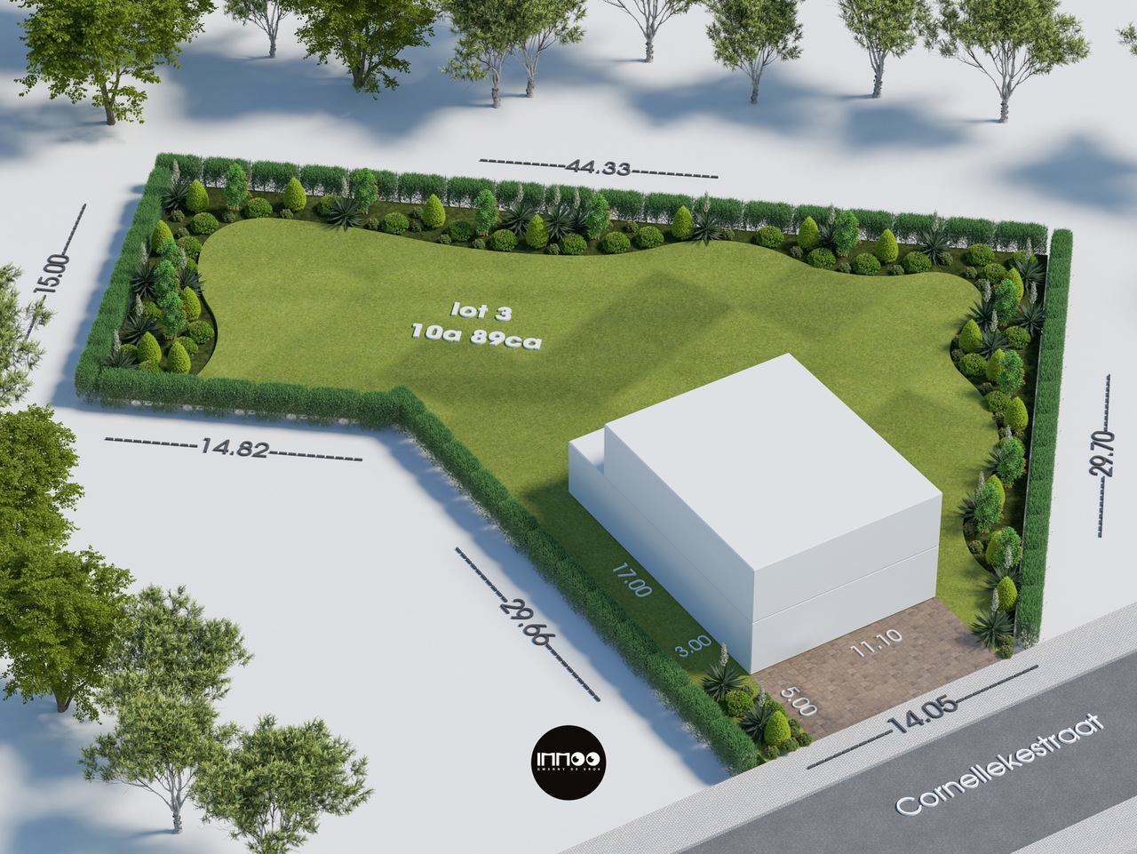 Het perceel is bestemd voor het oprichten van een eengezinswoning in open bebouwing, met een maximale bruto vloeroppervlakte van 200 m². De bouwzone heeft een rechthoekig grondplan van 11,10 m breed en 17 m diep. De voorziene inplanting bevindt zich op 5 m van de Cornellekestraat en op 3 m van de zijdelingse perceelsgrenzen.