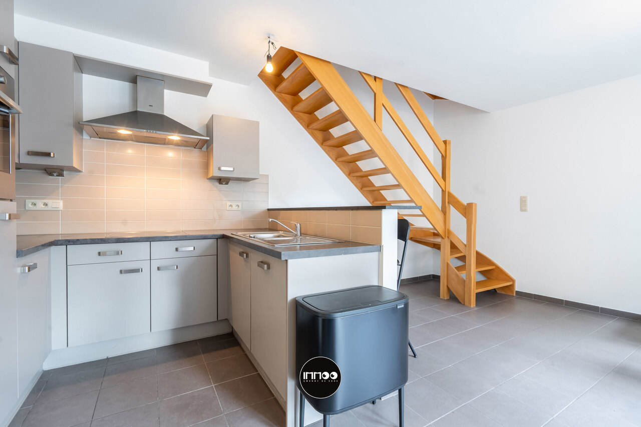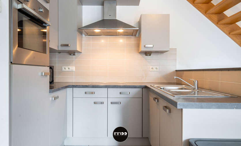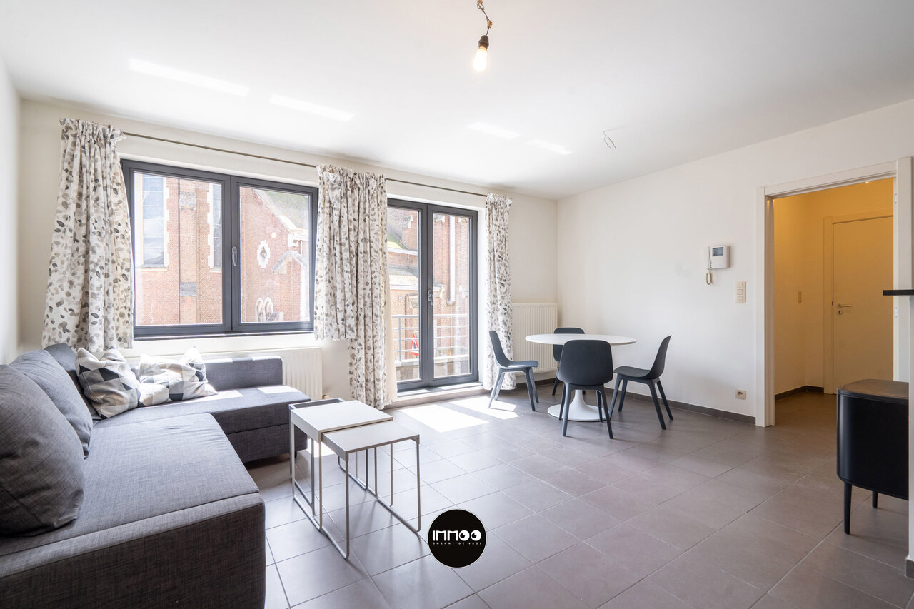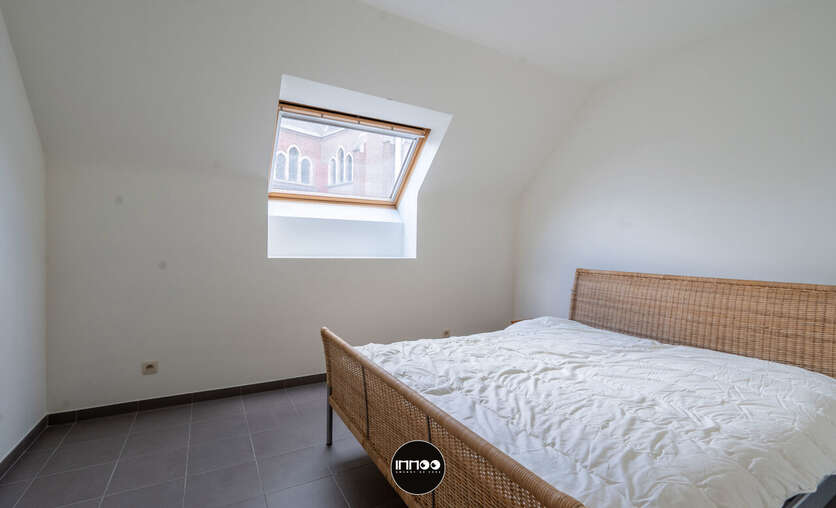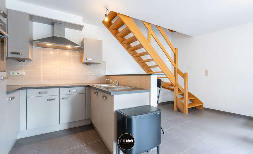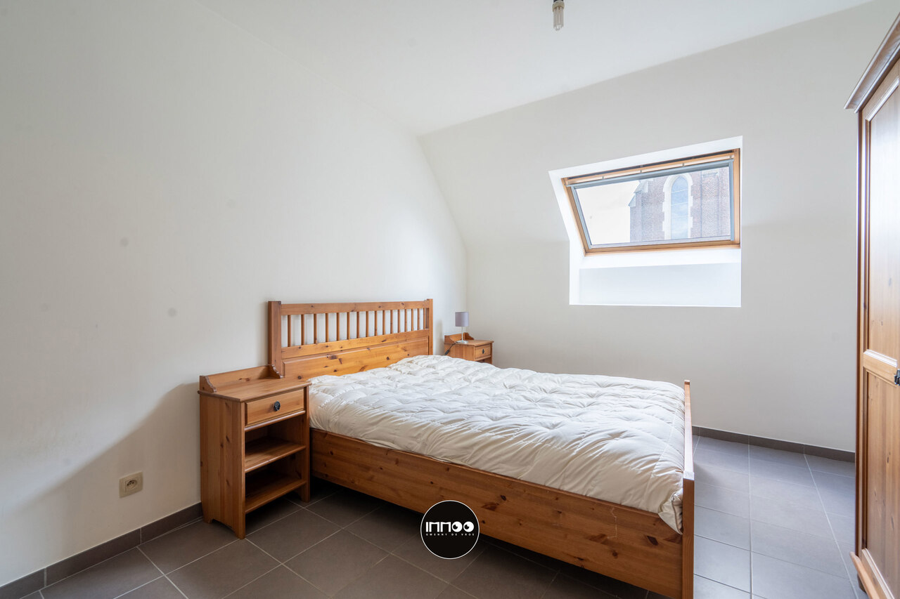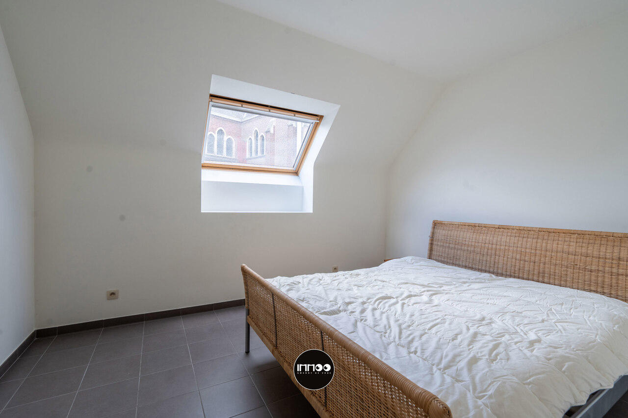 Via de inkomhal op het eerste verdiep bereik je eerst een technische ruimte en een apart toilet, alvorens de open leefruimte te betreden. Hier bevindt zich de volledig uitgeruste keuken met oven, keramische kookplaat en lavabo, en is er ruimte voor het salon en de eethoek. Het grote schuifraam laat natuurlijk licht binnen en geeft toegang tot het balkon waar u zicht heeft op de centraal gelegen kerk en prachtig gerenoveerde pastorij van Kampenhout.