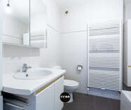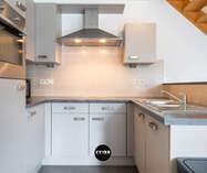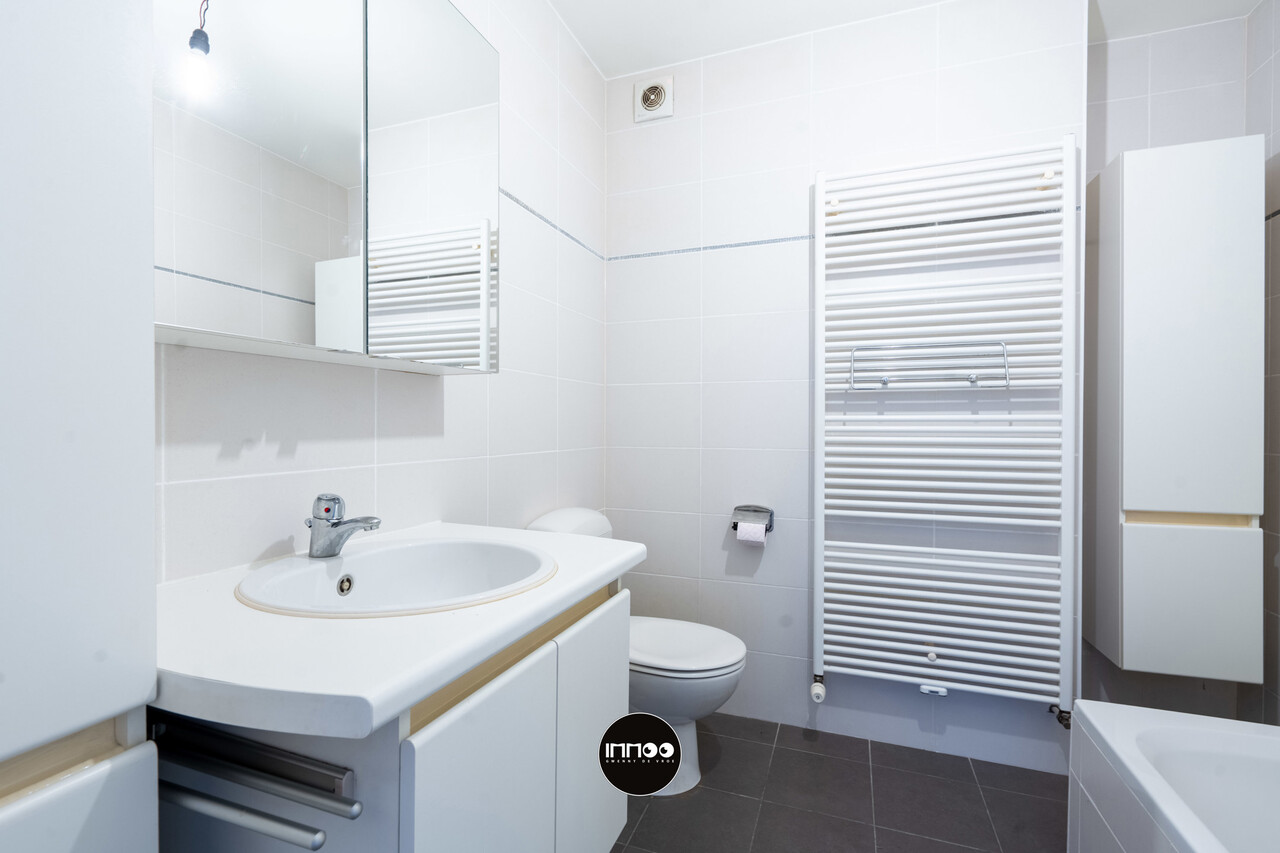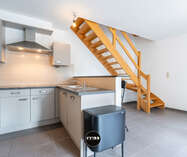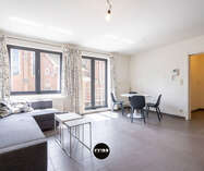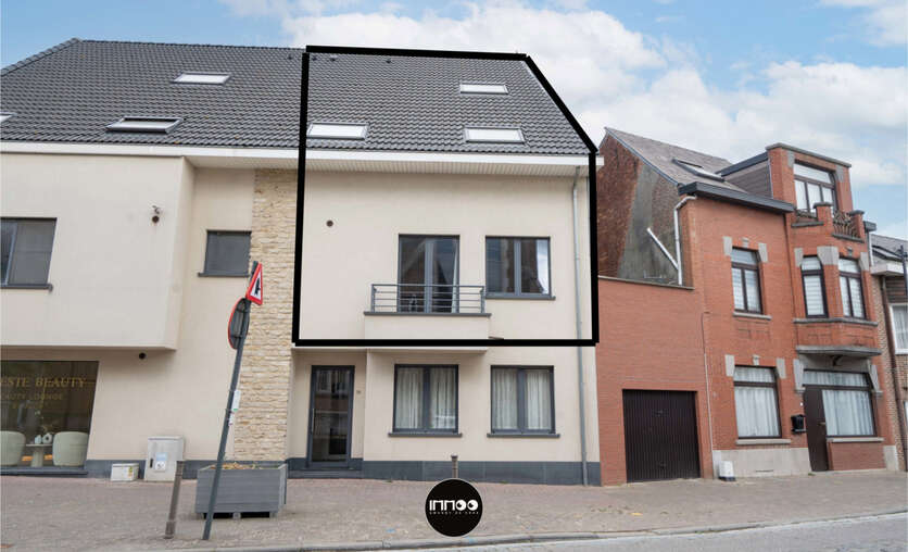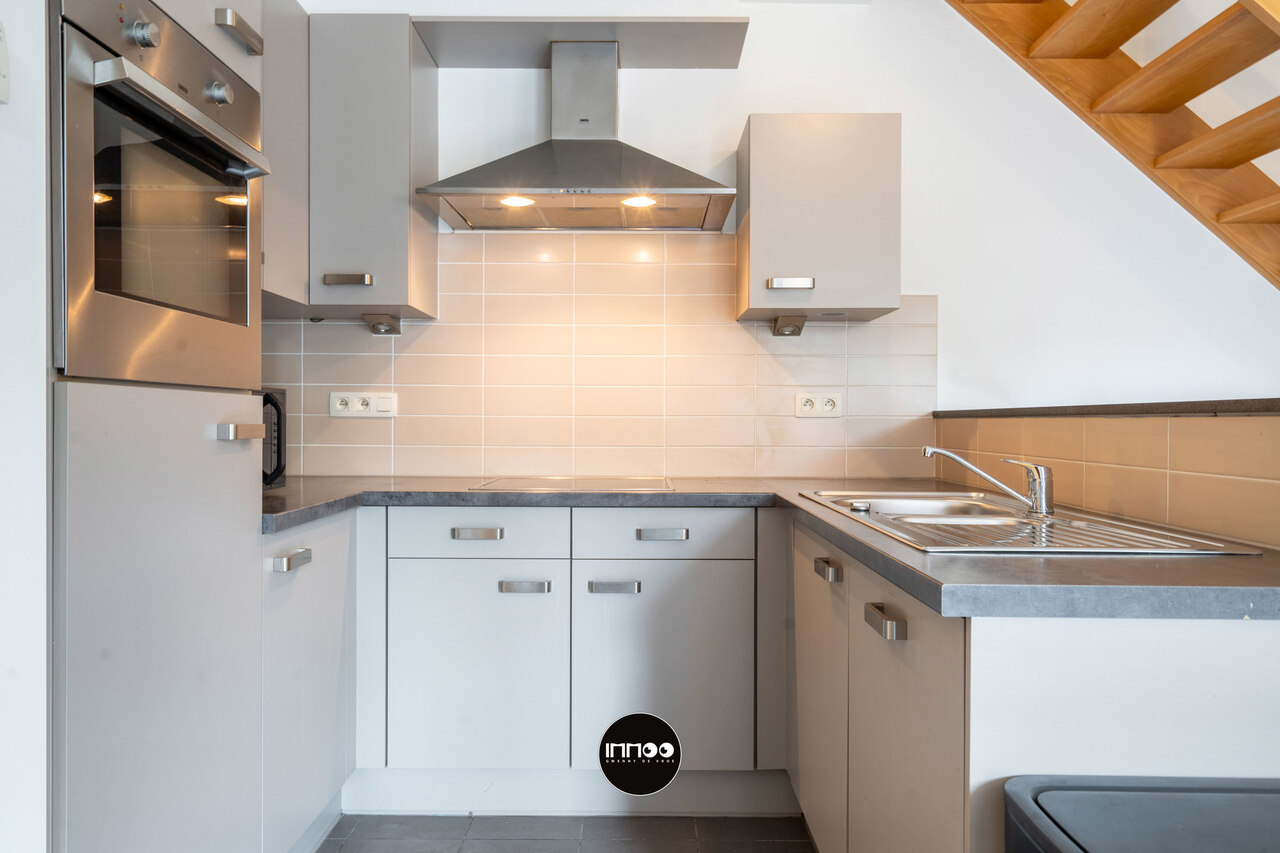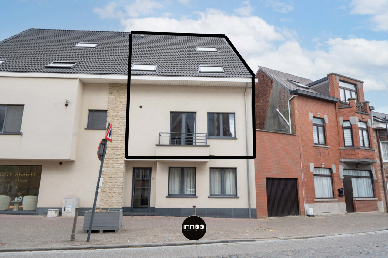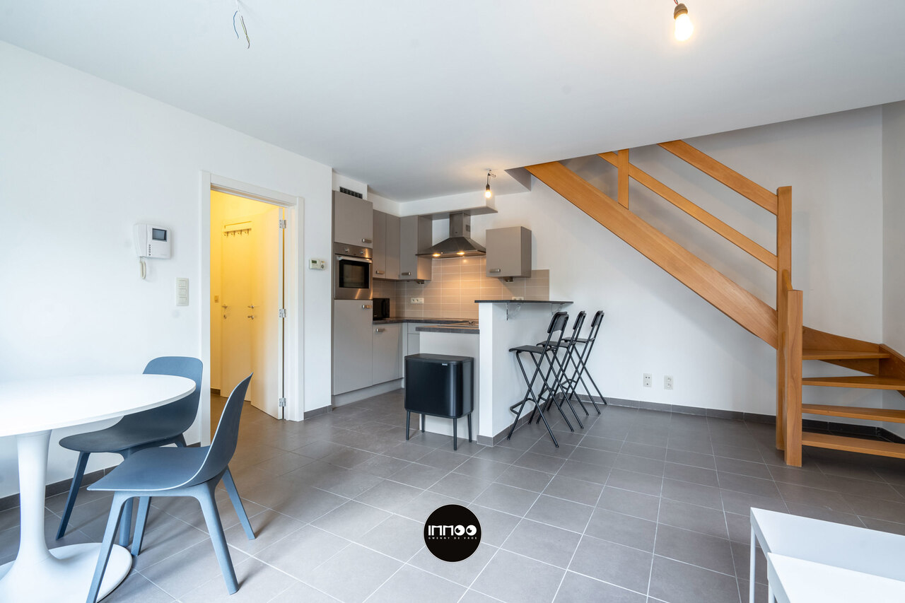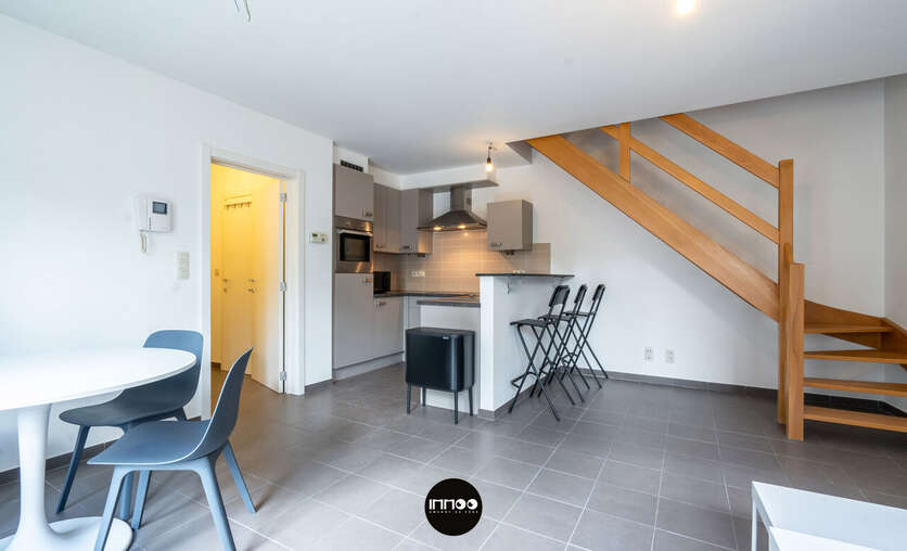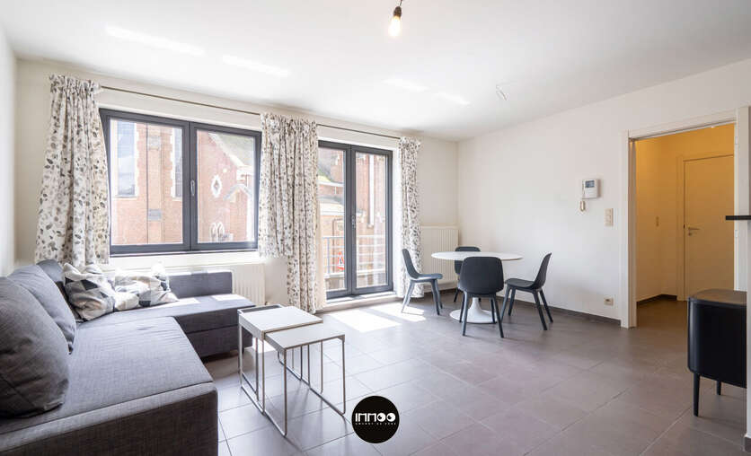 Via de inkomhal op het eerste verdiep bereik je eerst een technische ruimte en een apart toilet, alvorens de open leefruimte te betreden. Hier bevindt zich de volledig uitgeruste keuken met oven, keramische kookplaat en lavabo, en is er ruimte voor het salon en de eethoek. Het grote schuifraam laat natuurlijk licht binnen en geeft toegang tot het balkon waar u zicht heeft op de centraal gelegen kerk en prachtig gerenoveerde pastorij van Kampenhout.