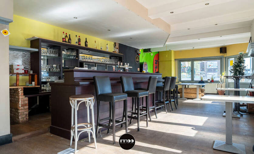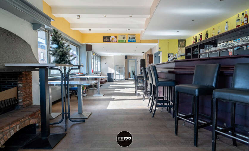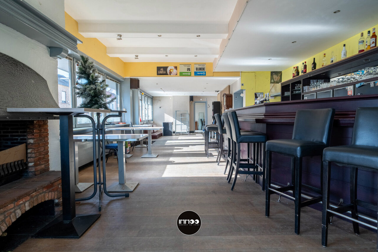 Bij het binnenkomen betreedt u het ruime café-gedeelte, waar de karakteristieke toog meteen in het oog springt. De gezellige open haard zorgt voor extra sfeer, terwijl de vele ramen zorgen voor een aangename lichtinval en een open gevoel in de ruimte. Verder beschikt het handelsgedeelte over aparte dames- en herentoiletten.