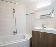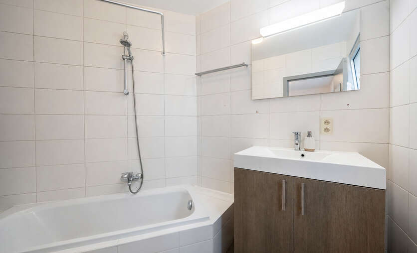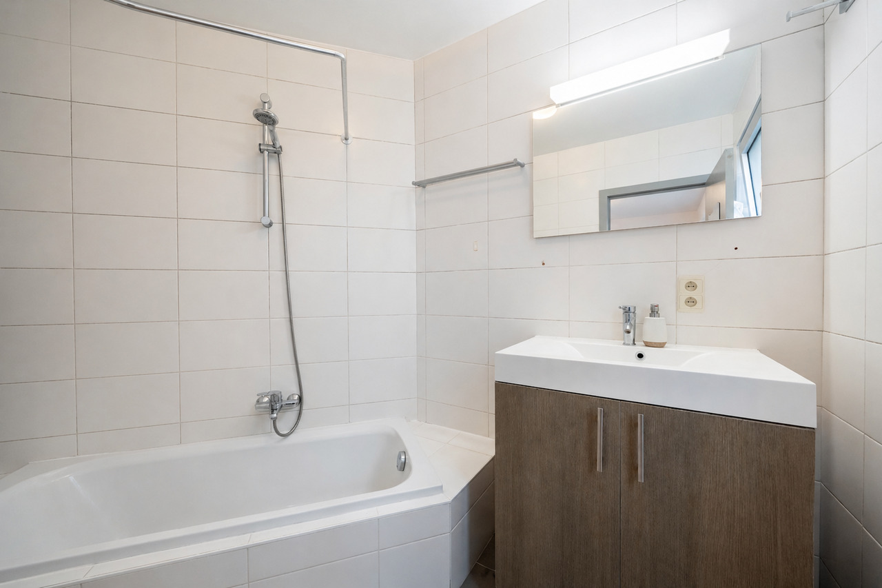 Dit verzorgd gelijkvloersappartement biedt een ideale combinatie van comfort, ruimte en een uitstekende bereikbaarheid. Bij het betreden van het appartement komt u in de inkomhal met vestiaire, die toegang geeft tot een apart gastentoilet. De ruime slaapkamer sluit aan op de badkamer, uitgerust met een bad en lavabo.