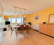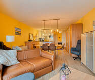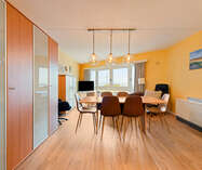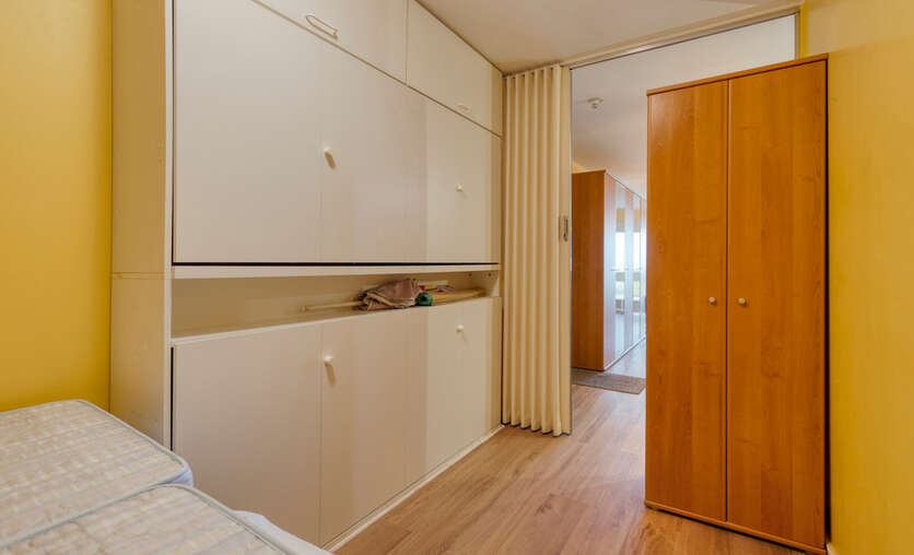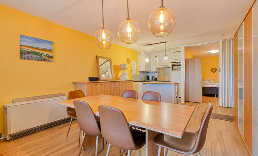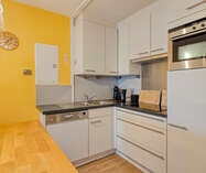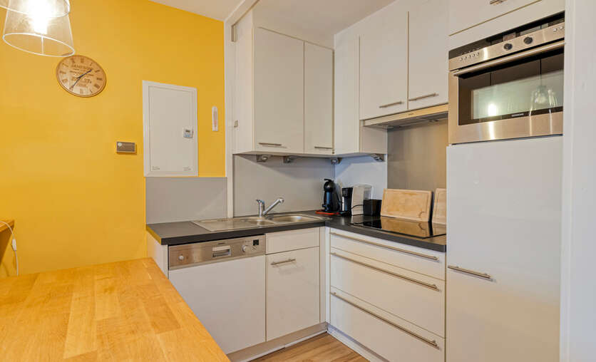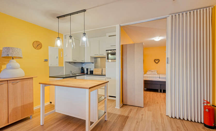 Het appartement beschikt over een lichte leefruimte met een volledig ingerichte keuken, ideaal om te ontspannen of gezellig te tafelen. De slaapruimte is praktisch ingericht met een tweepersoonsbed en een stapelbed.
