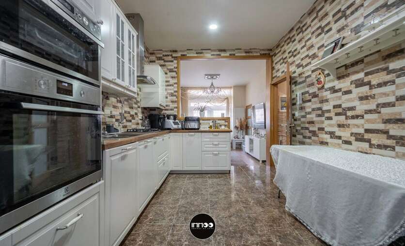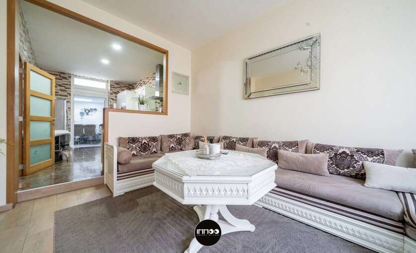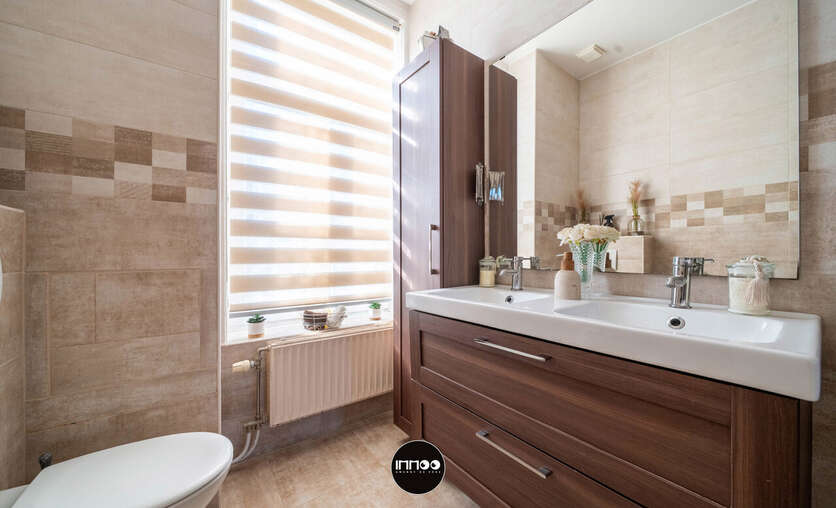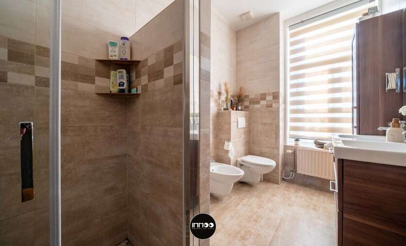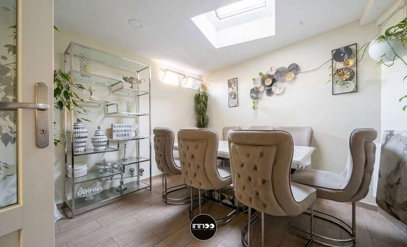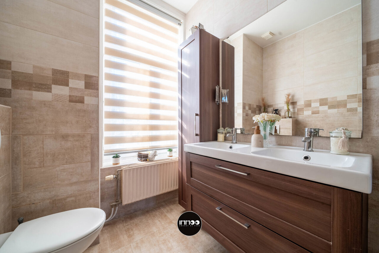 Deze ruime woning verwelkomt u via een inkomhal met hoge plafonds, trappenhuis, vestiaire en een praktische fietsenberging. Rechts bevindt zich de open leefruimte met een gezellig salon, een volledig uitgeruste keuken met gasvuur en een lichtrijke eethoek dankzij de dakkoepel.