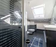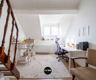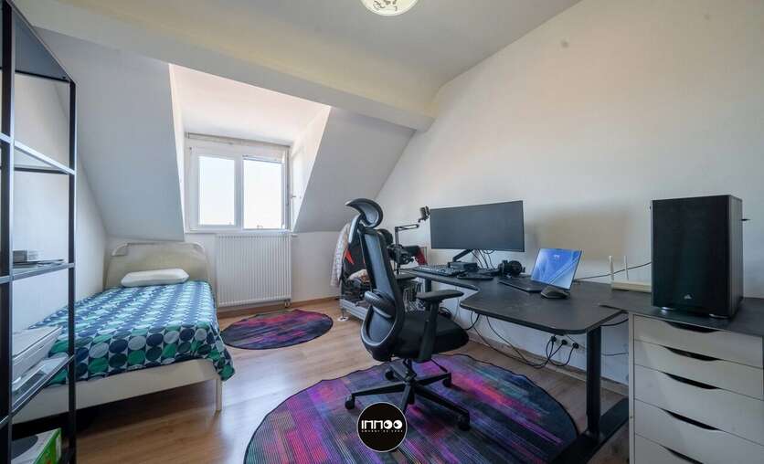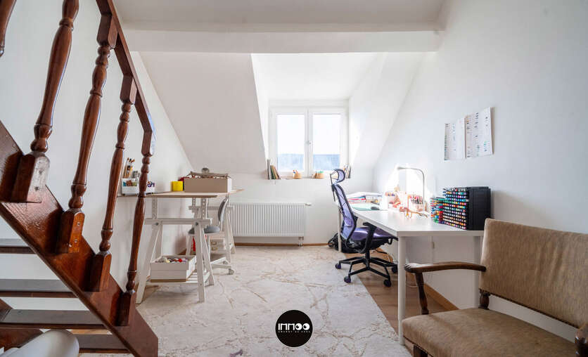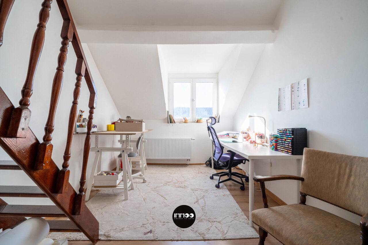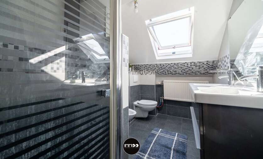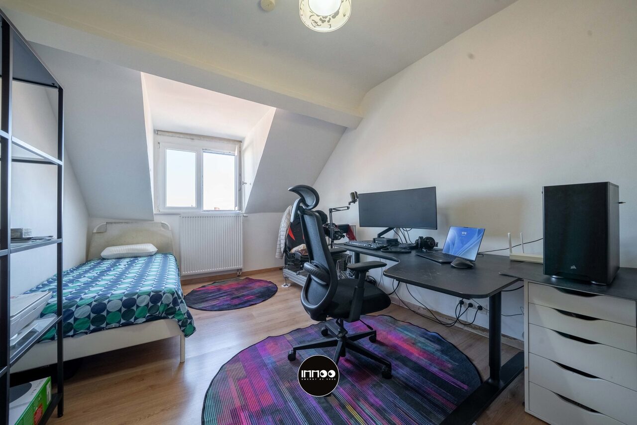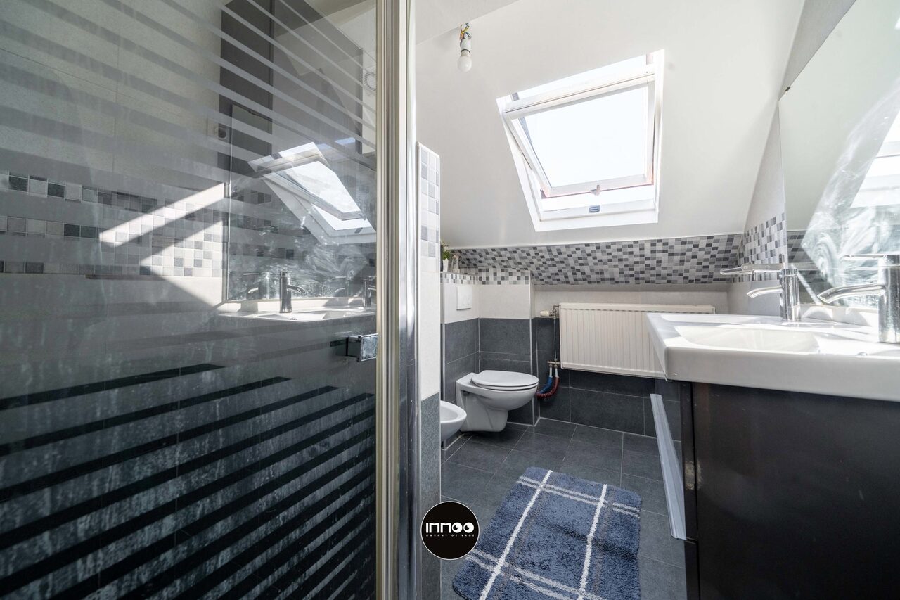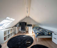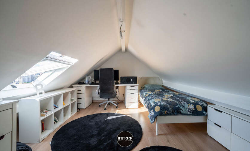 De derde verdieping vervolledigt het geheel met nog twee extra kamers, waaronder één met bureau en een charmante mezzanine in de nok van de woning. Hier bevindt zich ook een tweede badkamer met douche, toilet, bidet en dubbele lavabo.