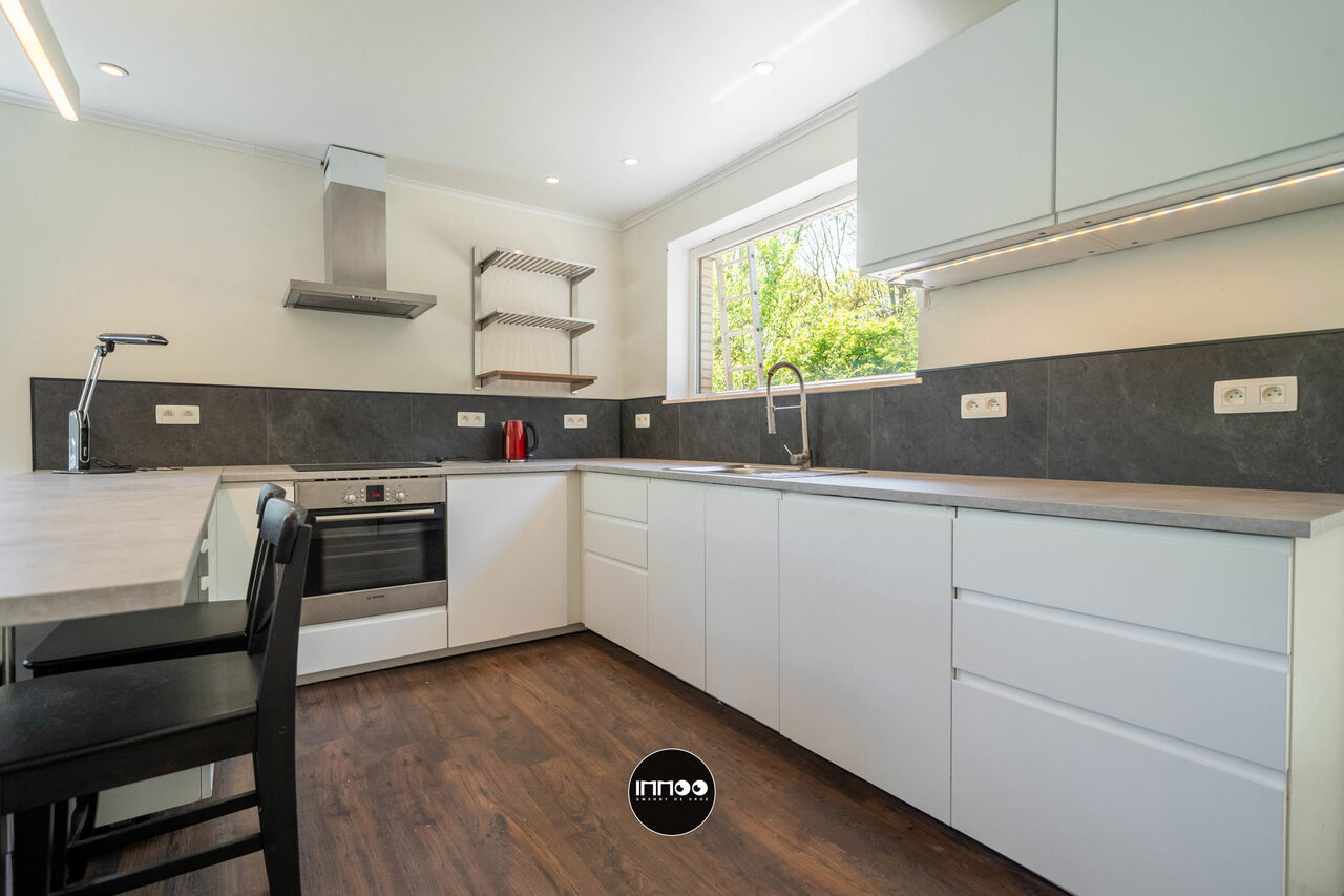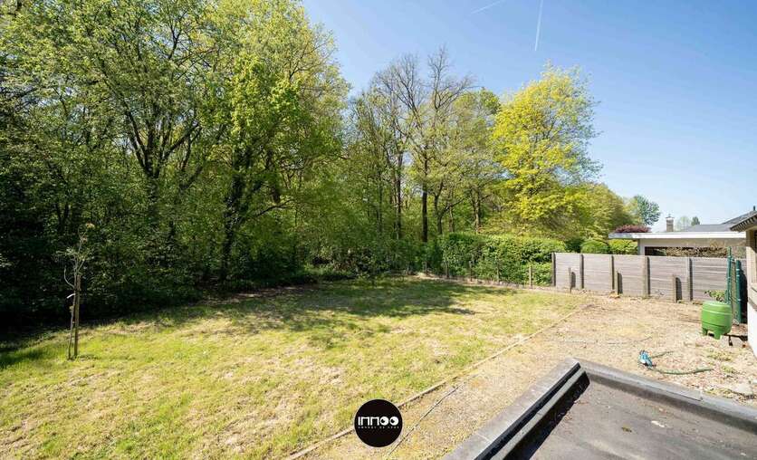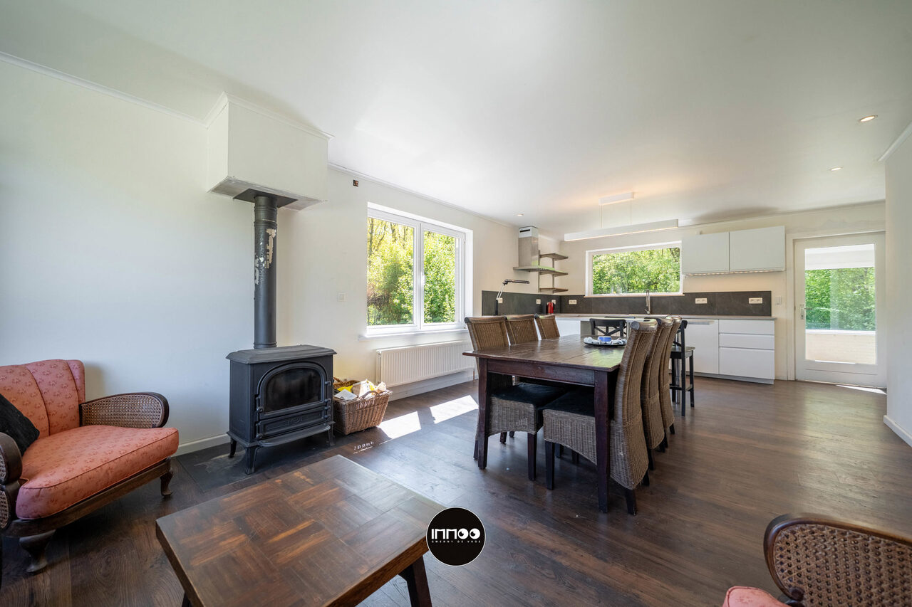 Buiten wacht een ruime, onderhoudsvriendelijke voor- en achtertuin die naadloos overloopt in het aangrenzende bos van circa 10 are, wat deze eigendom een unieke, groene meerwaarde geeft. Daarnaast is er nog een praktische tuinberging aanwezig.