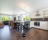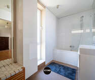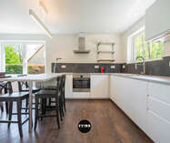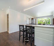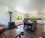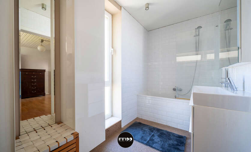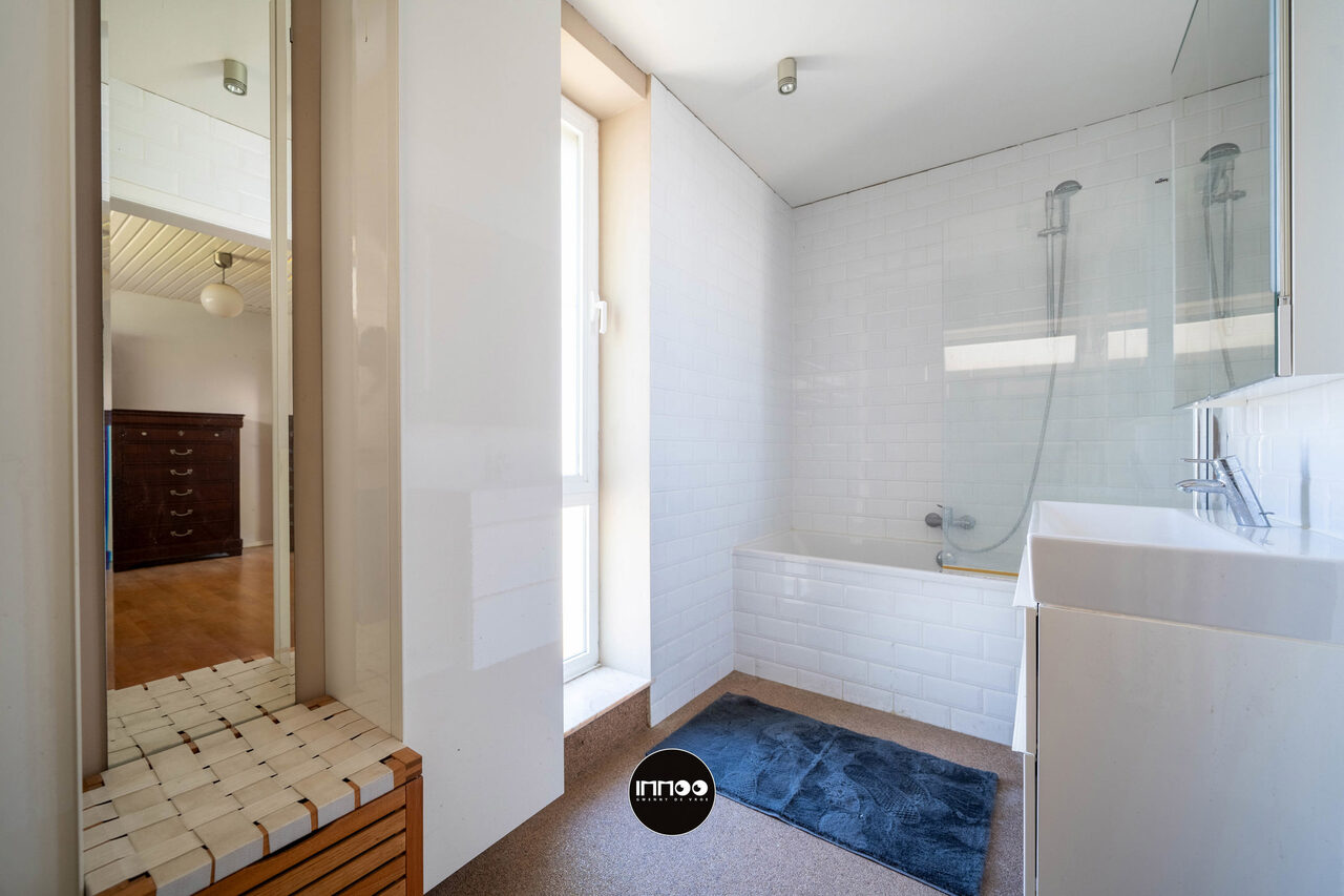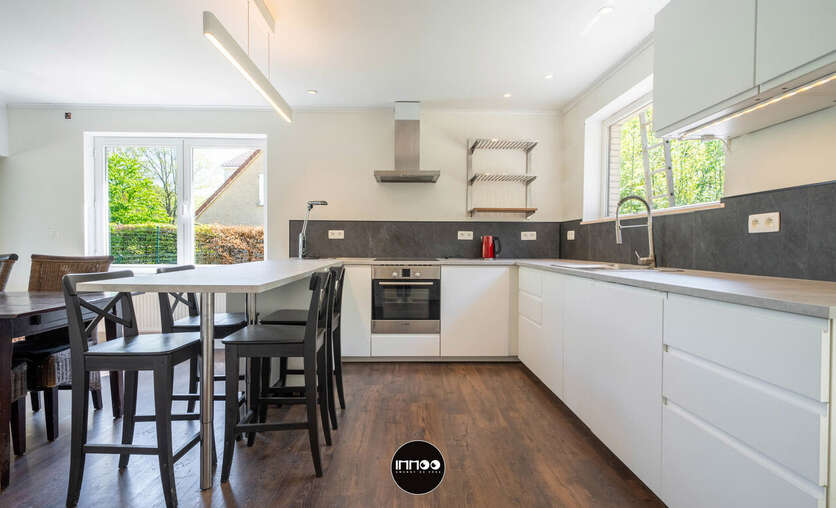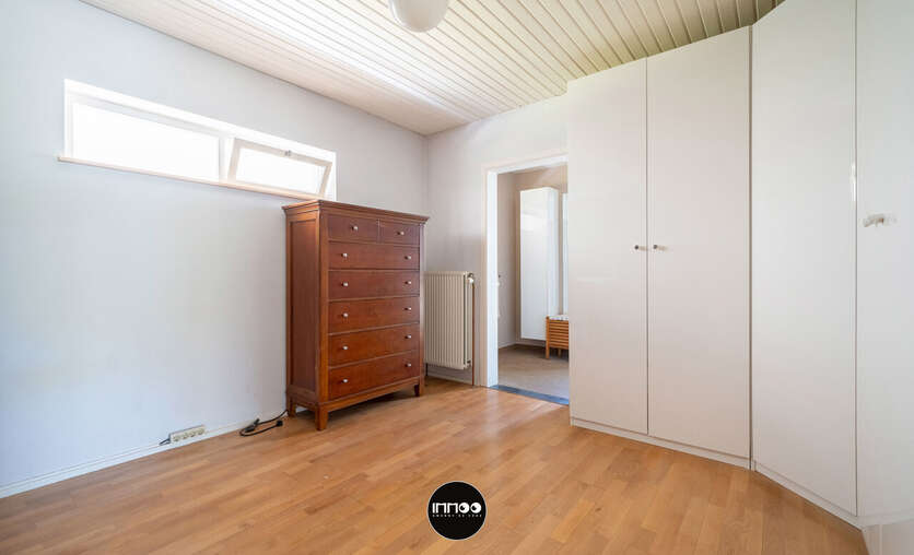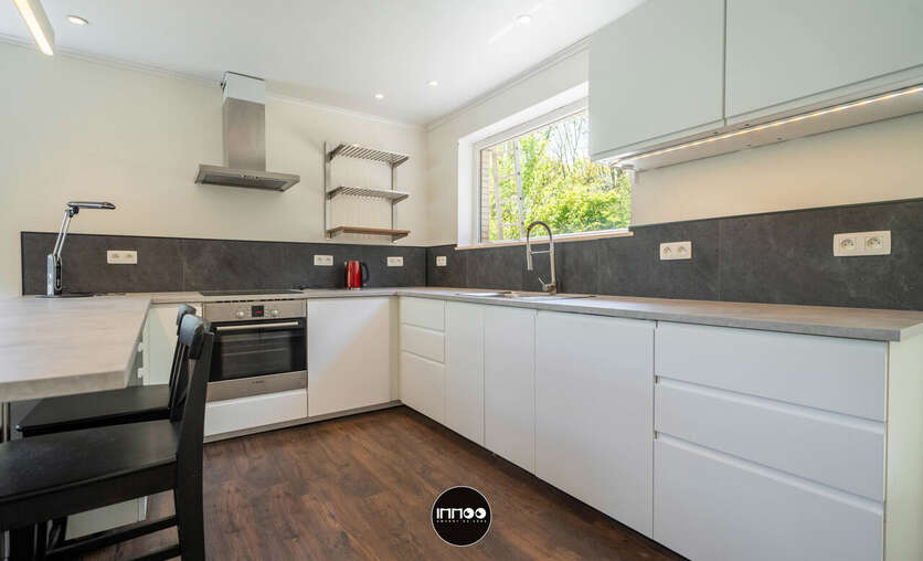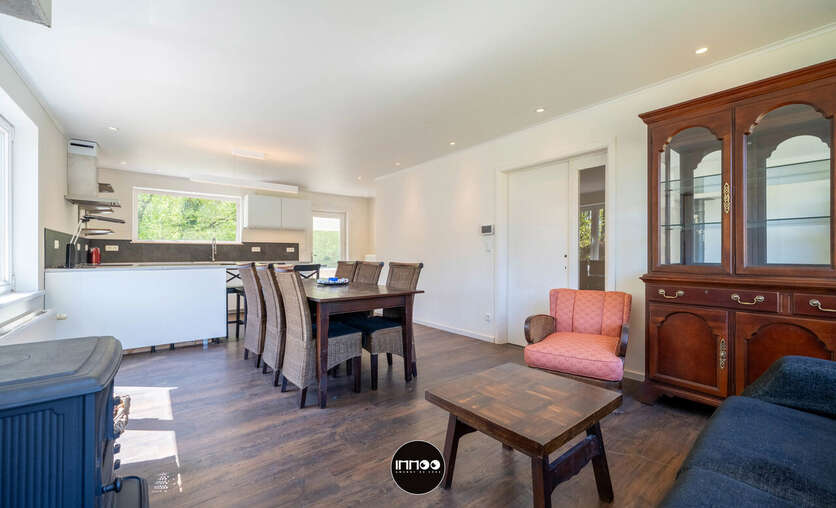 Bij het betreden van de woning komt u in de inkomhal met vestiaire en een apart gastentoilet. Van hieruit bereikt u een eerste slaapkamer met kastenwand (blijft aanwezig), die aansluit op de badkamer uitgerust met een douche in ligbad en een dubbele lavabo. Aan de andere zijde van de inkomhal bevindt zich de lichtrijke, open leefruimte met salon en eethoek, waar een gezellige houtkachel voor extra sfeer zorgt. De volledig ingerichte open keuken met ontbijthoek sluit hier naadloos op aan.