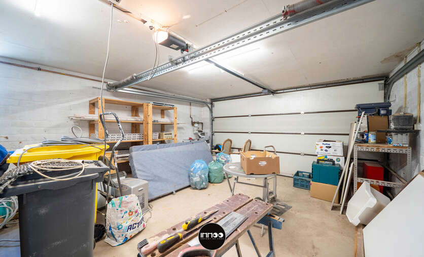De ruime inpandige garage biedt plaats voor een wagen en beschikt over bijkomende opslagruimte. Hier bevinden zich tevens de wasmachine-aansluiting, verwarming, boiler en technieken. Via de garage heeft u toegang tot de kruipkelder, die voor extra bergruimte zorgt.