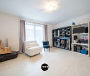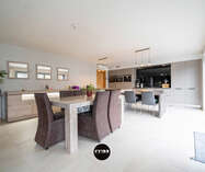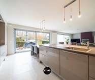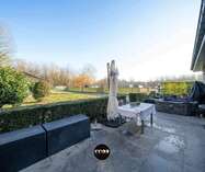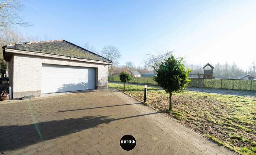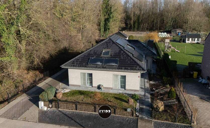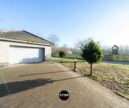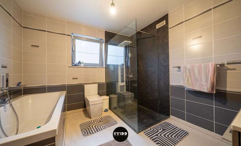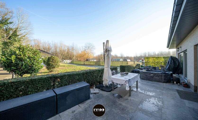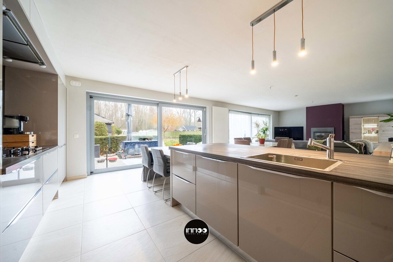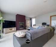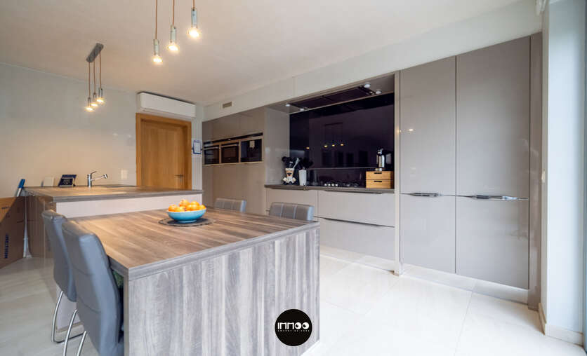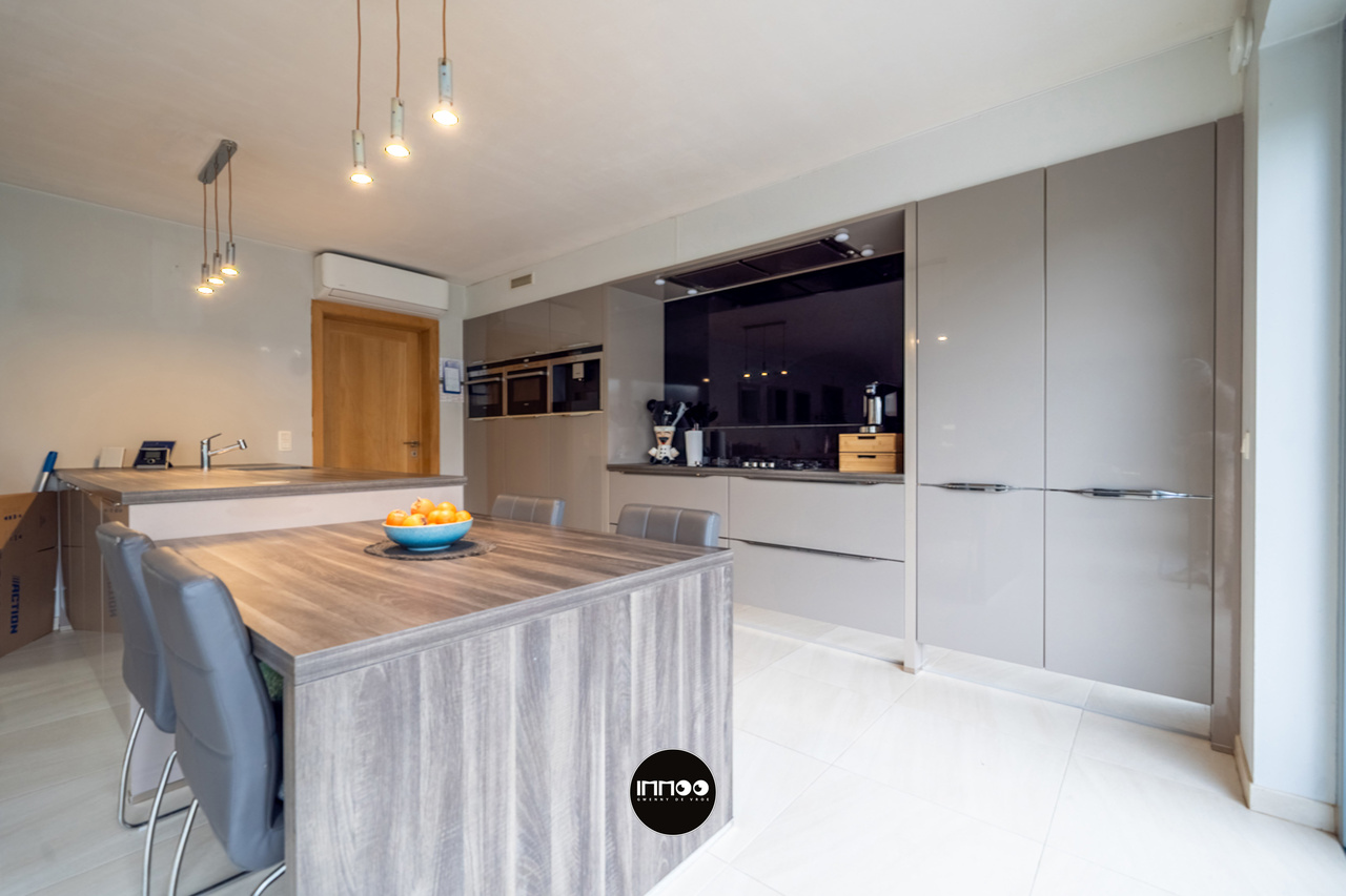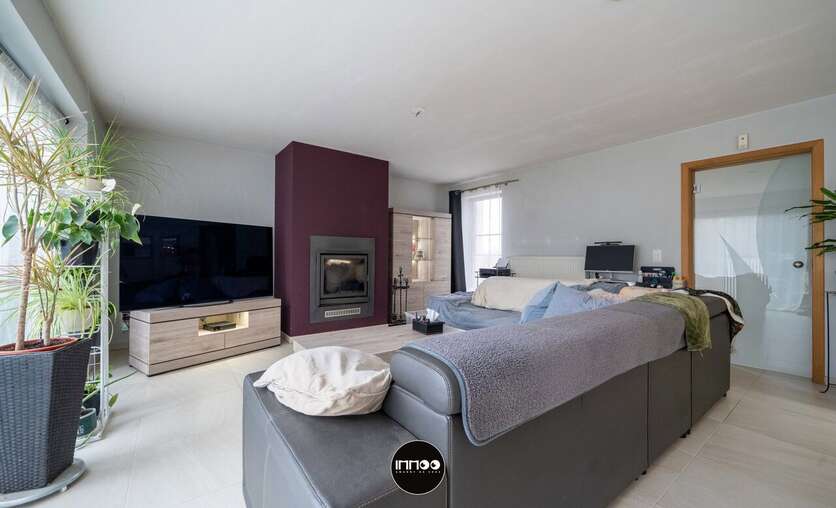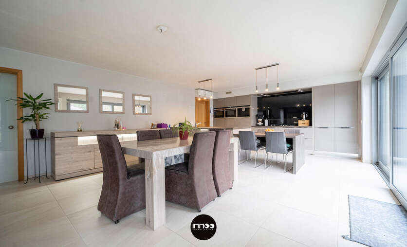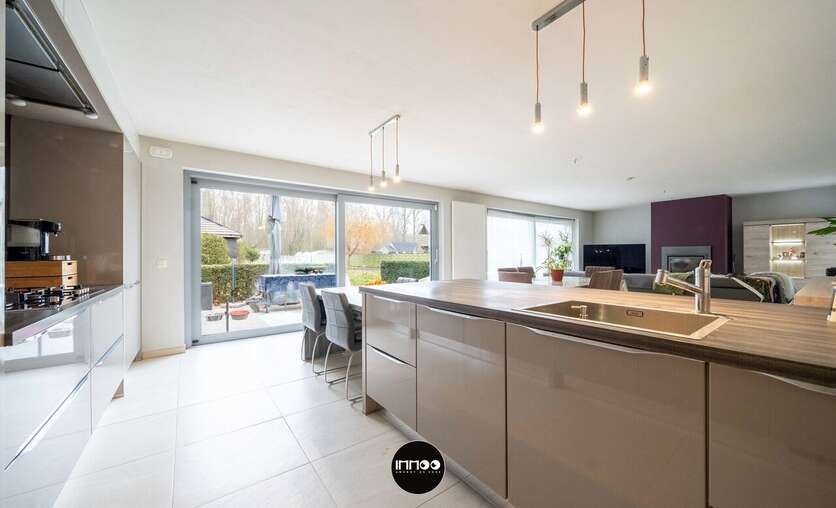 Via de oprit aan de linkerzijde van de woning kom je binnen in de inkomhal, waar zich ook de wasruimte en technische ruimte bevinden. Van hieruit bereik je de open en lichtrijke leefruimte, voorzien van airco en verwarming. De volledig ingerichte Siemens-keuken met gasvuur is ideaal voor kookliefhebbers en sluit mooi aan op de eethoek en het salon met open haard. Het grote schuifraam creëert een aangename verbinding met de tuin en laat overvloedig daglicht binnen.