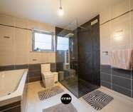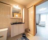Aan de rechterzijde van de woning bevindt zich de gasteninkom met trappenhal die ook toegang geeft tot de leefruimte. Vanuit de hal aan de linkerkant bereik je de badkamer met ligbad, inloopdouche, lavabo en toilet. Verder zijn er twee ruime slaapkamers, waarvan één is uitgerust met airconditioning en de andere beschikt over een ensuite douchekamer. Daarnaast is er een apart toilet.