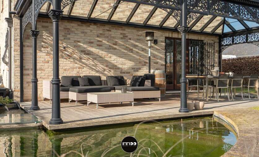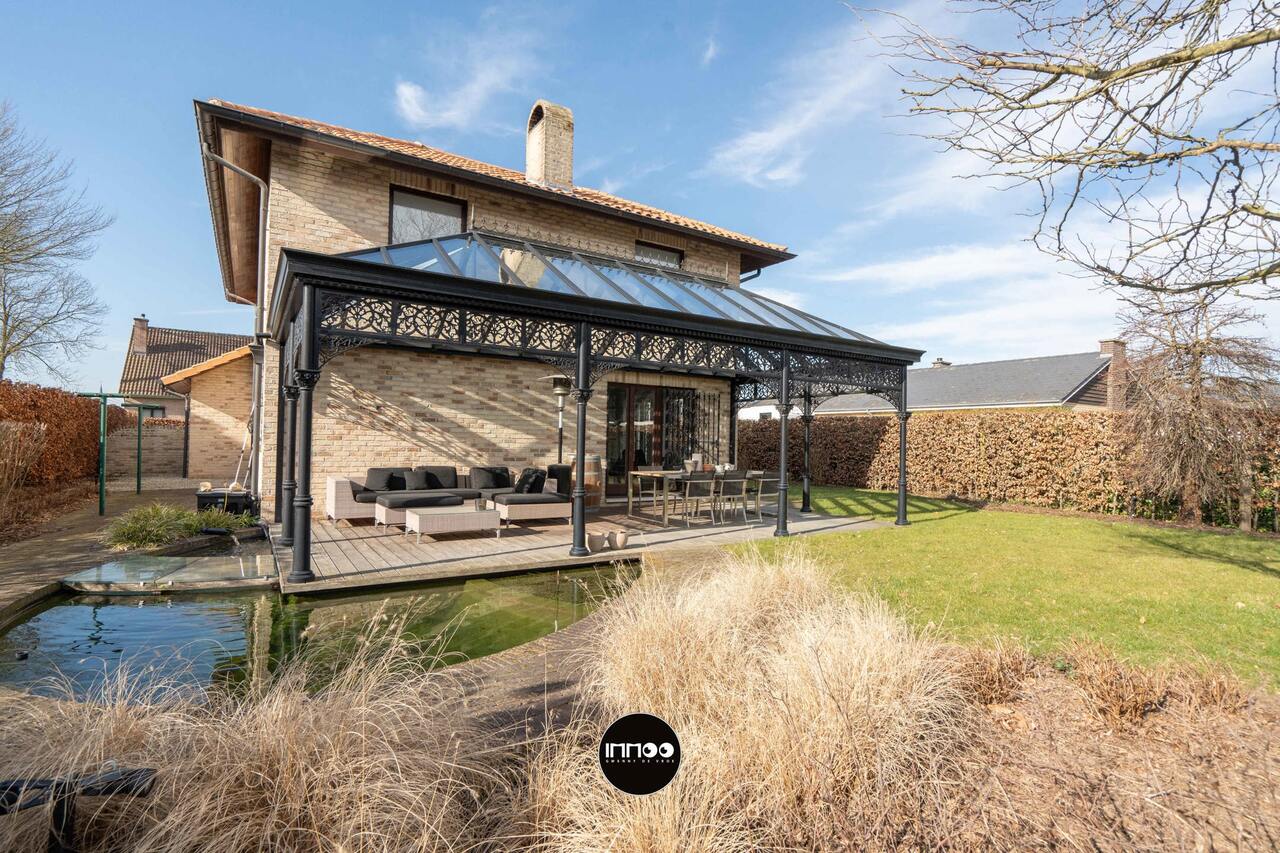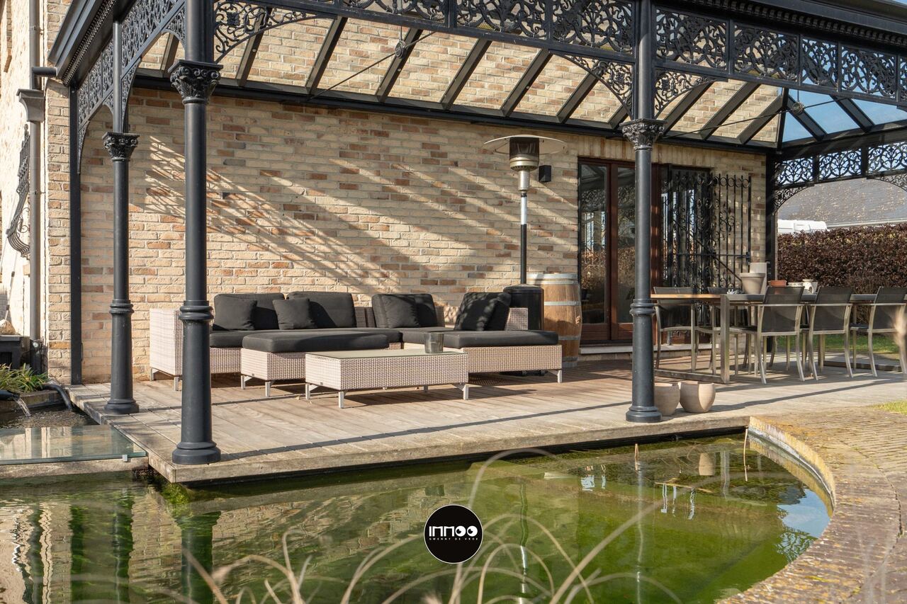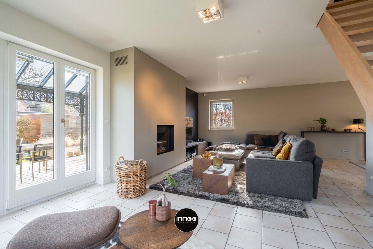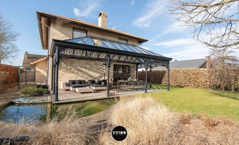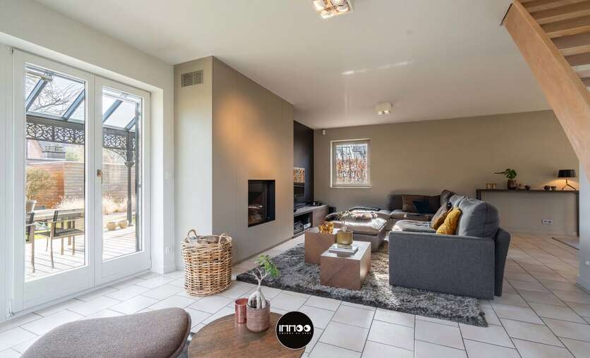 De leefruimte is een oase van gezelligheid, met een sfeervolle haard, een elegante eetplaats en een halfopen keuken die volledig is uitgerust met hoogwaardige toestellen, zoals een Amerikaanse koelkast, een inductievuur en een granieten werkblad. Het aangrenzende terras nodigt je uit om te genieten van zonnige dagen, met als blikvanger een sierlijke pergola en een levendige vijver. Hier kan je heerlijk ontspannen of vrienden en familie ontvangen voor een aperitief.