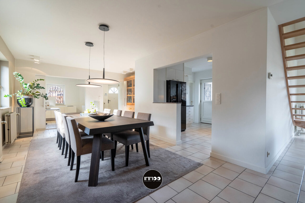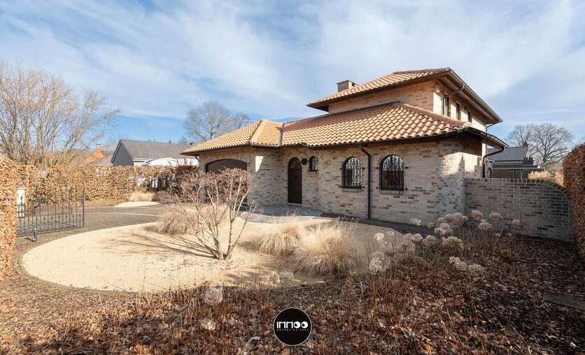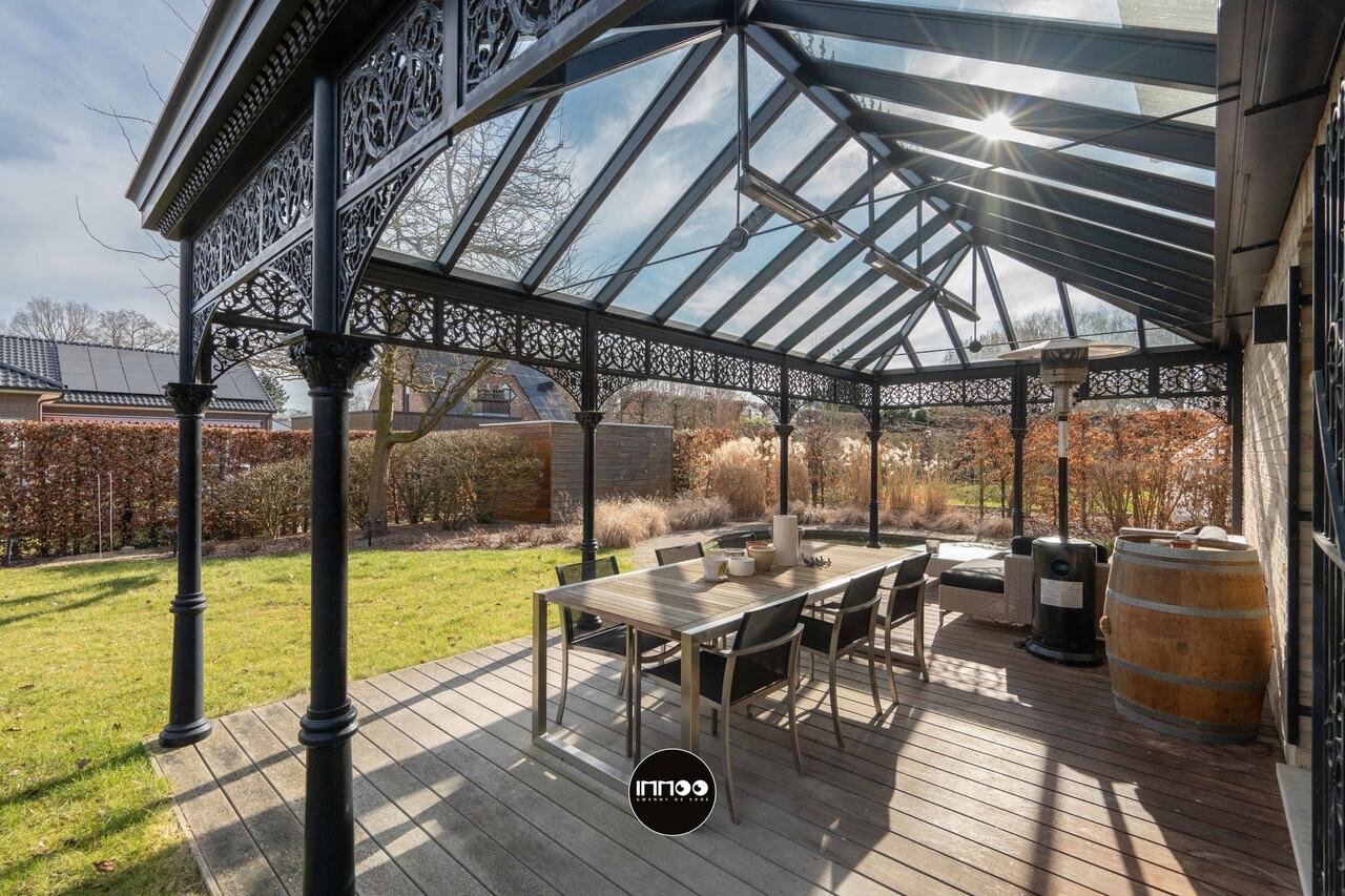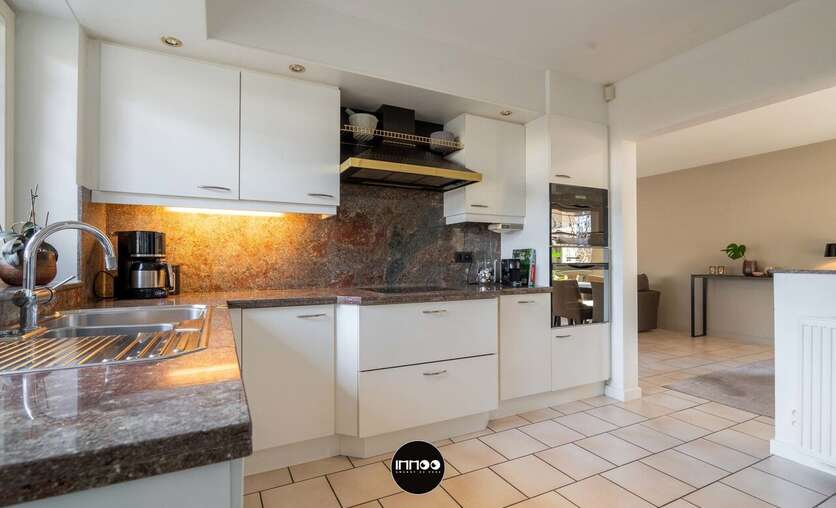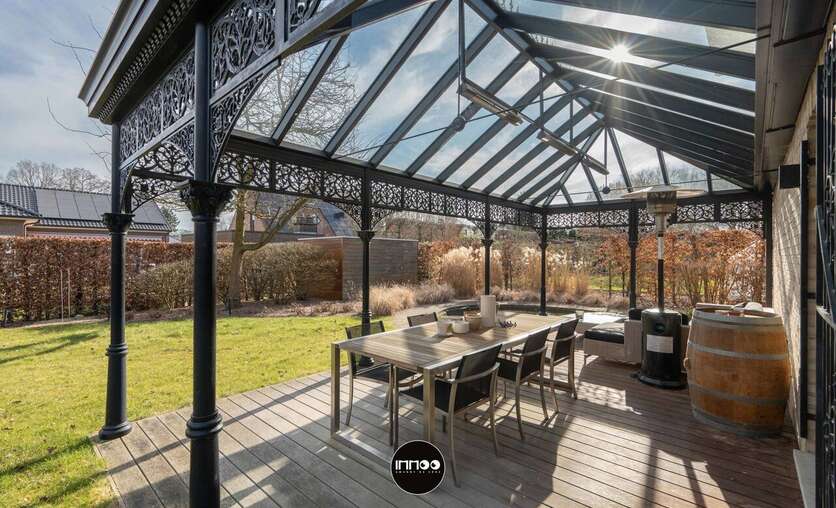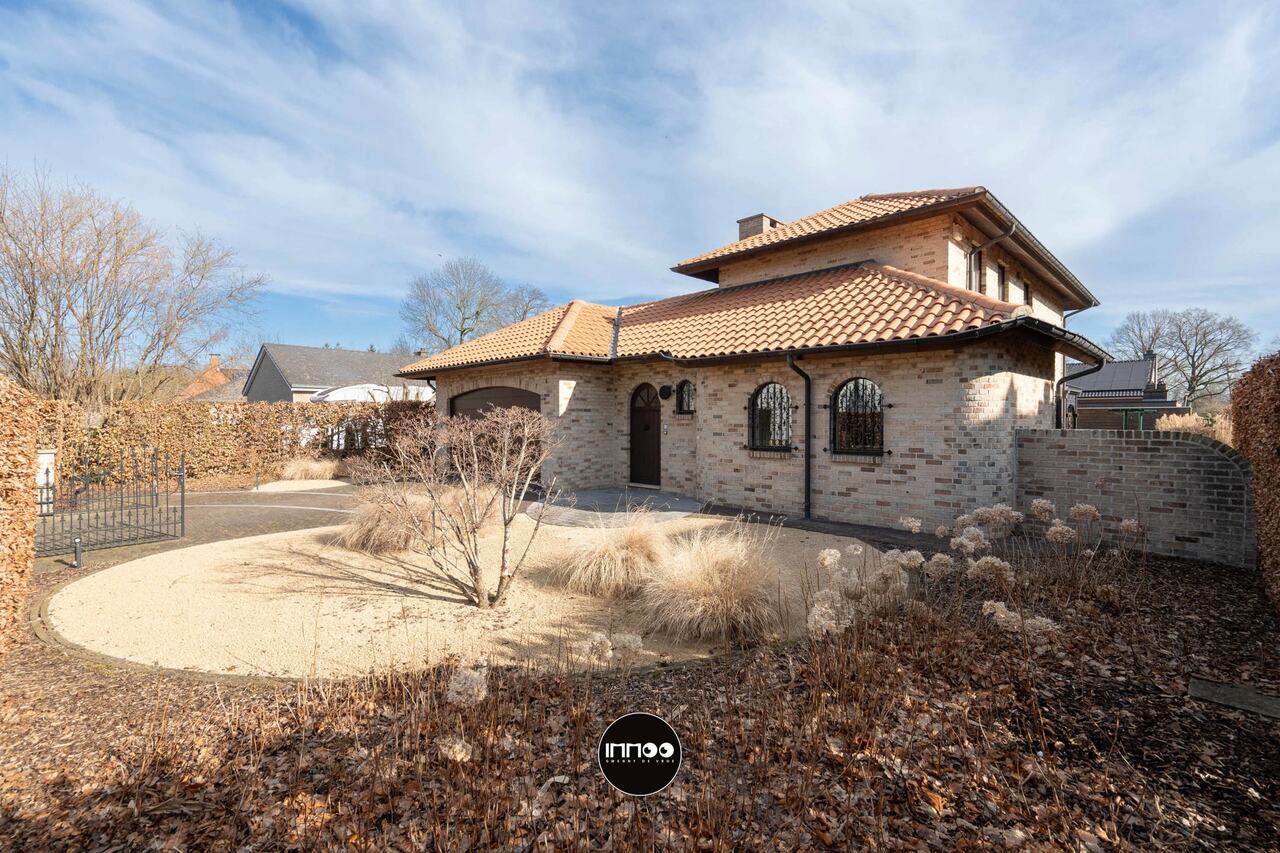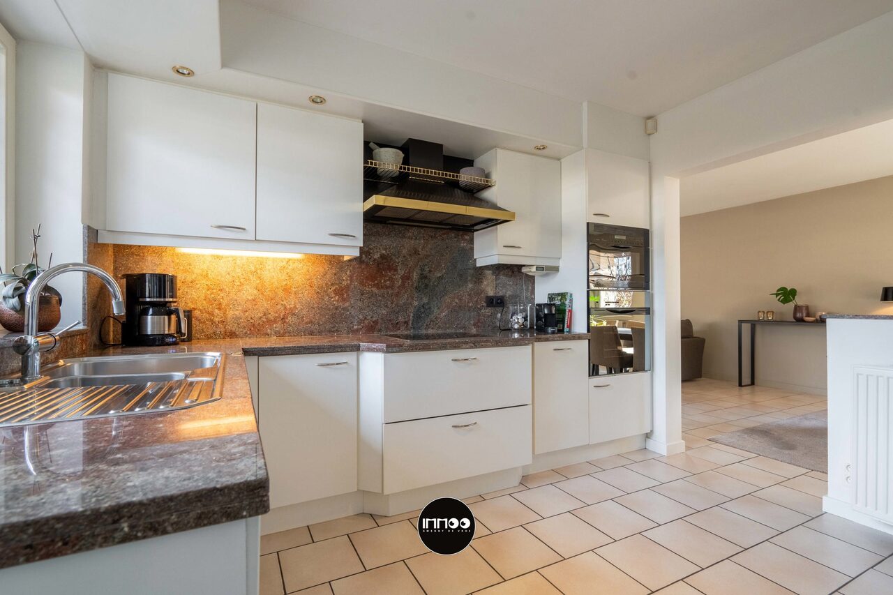 De leefruimte is een oase van gezelligheid, met een sfeervolle haard, een elegante eetplaats en een halfopen keuken die volledig is uitgerust met hoogwaardige toestellen, zoals een Amerikaanse koelkast, een inductievuur en een granieten werkblad. Het aangrenzende terras nodigt je uit om te genieten van zonnige dagen, met als blikvanger een sierlijke pergola en een levendige vijver. Hier kan je heerlijk ontspannen of vrienden en familie ontvangen voor een aperitief.