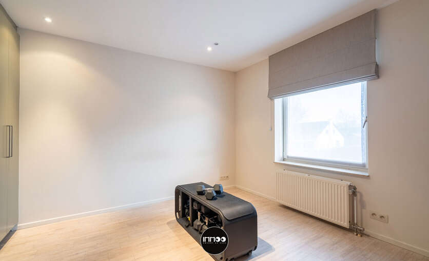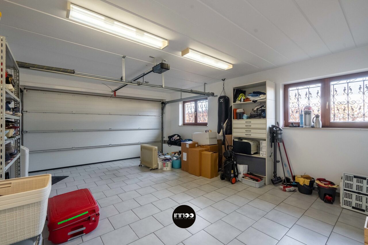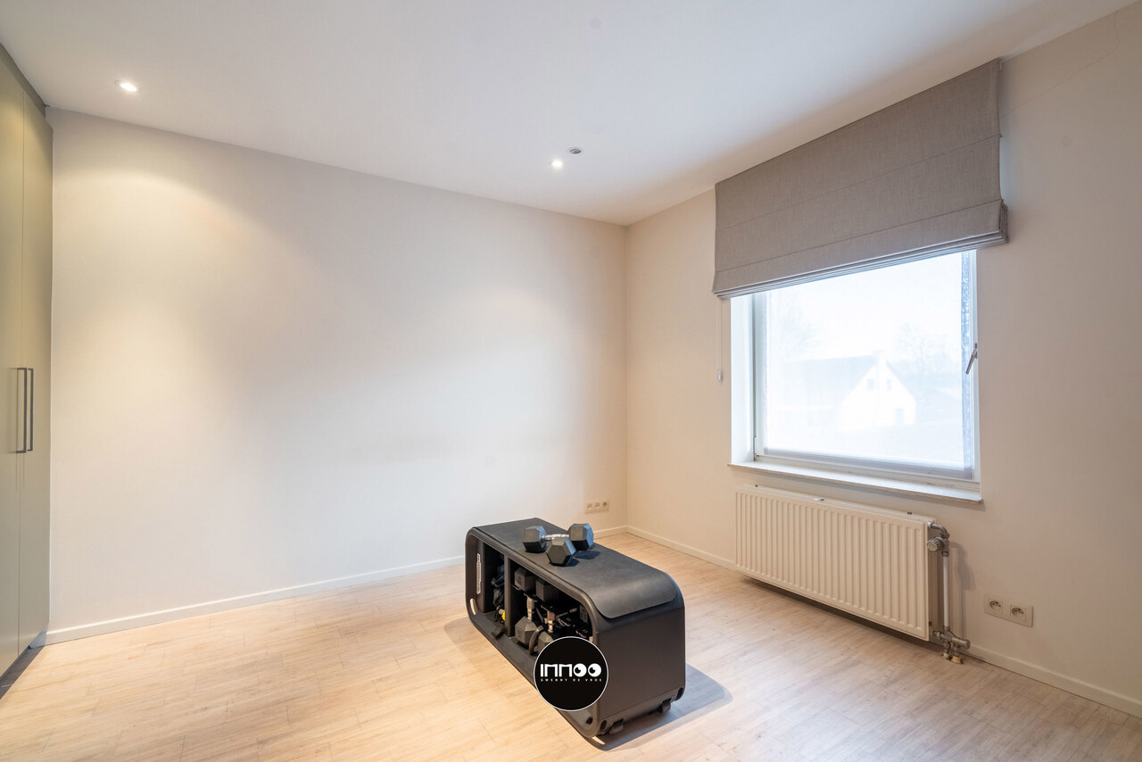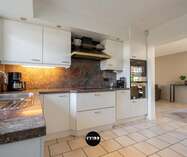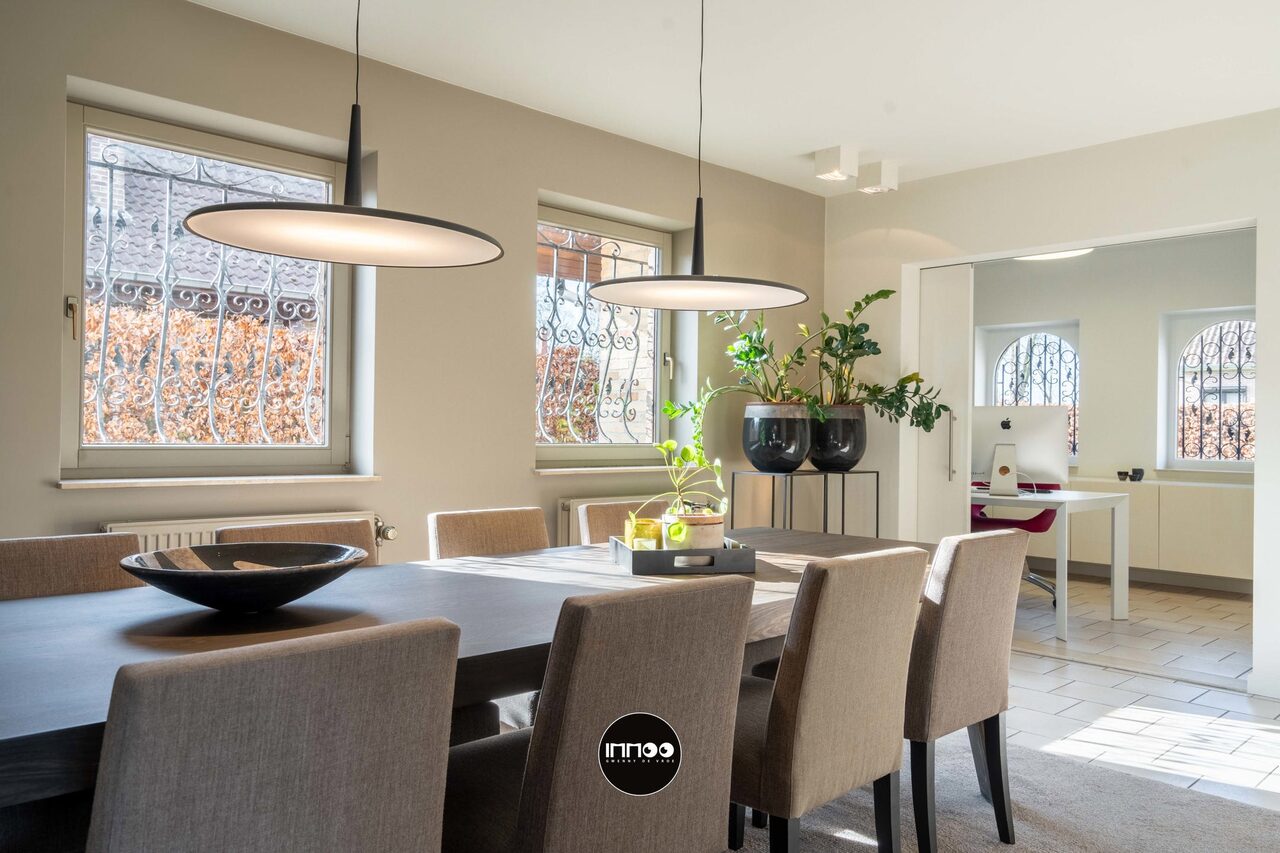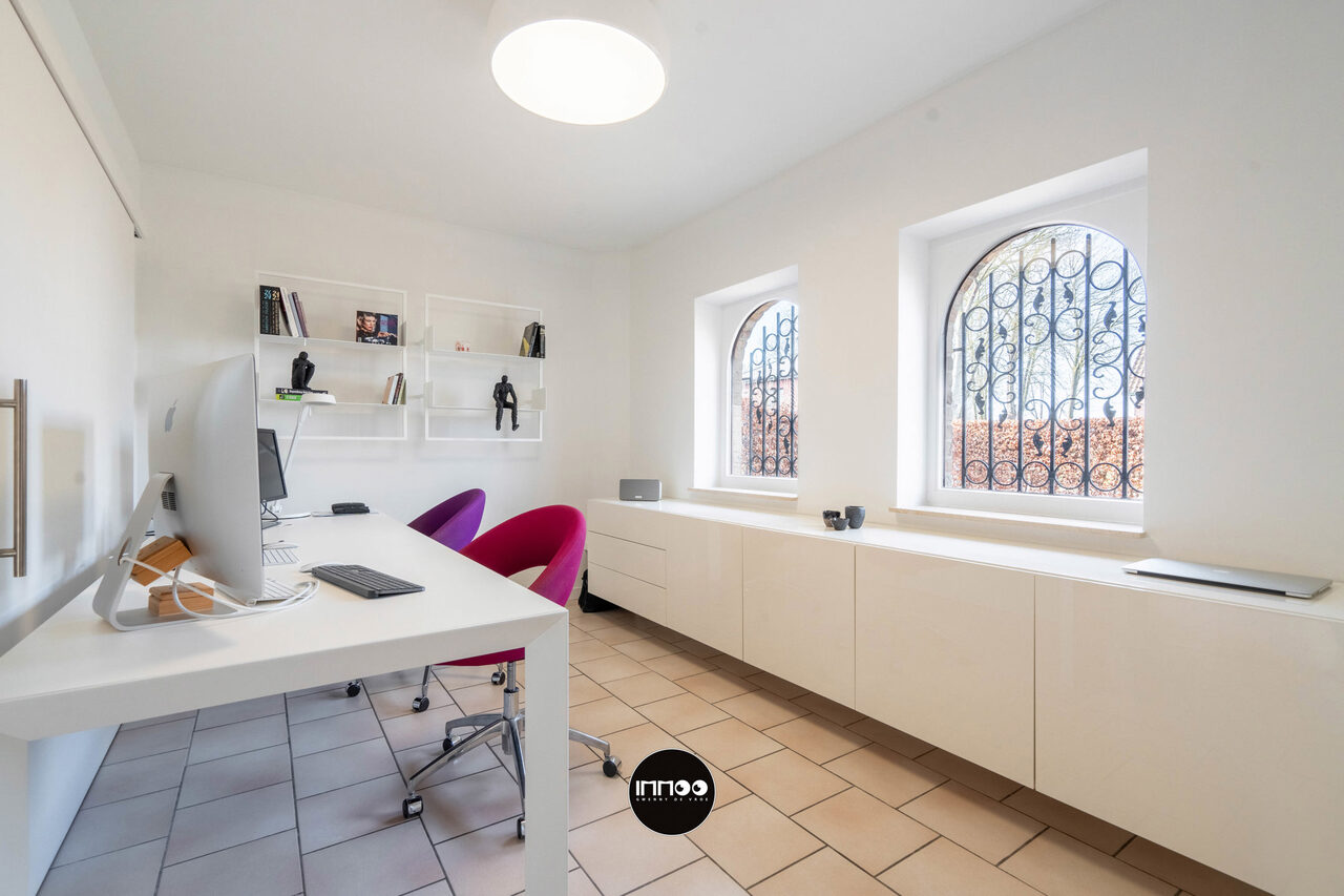 De leefruimte is een oase van gezelligheid, met een sfeervolle haard, een elegante eetplaats en een halfopen keuken die volledig is uitgerust met hoogwaardige toestellen, zoals een Amerikaanse koelkast, een inductievuur en een granieten werkblad. Het aangrenzende terras nodigt je uit om te genieten van zonnige dagen, met als blikvanger een sierlijke pergola en een levendige vijver. Hier kan je heerlijk ontspannen of vrienden en familie ontvangen voor een aperitief.