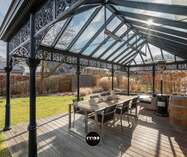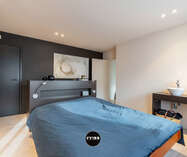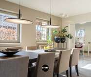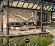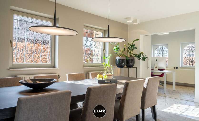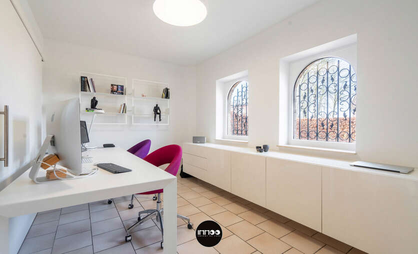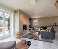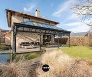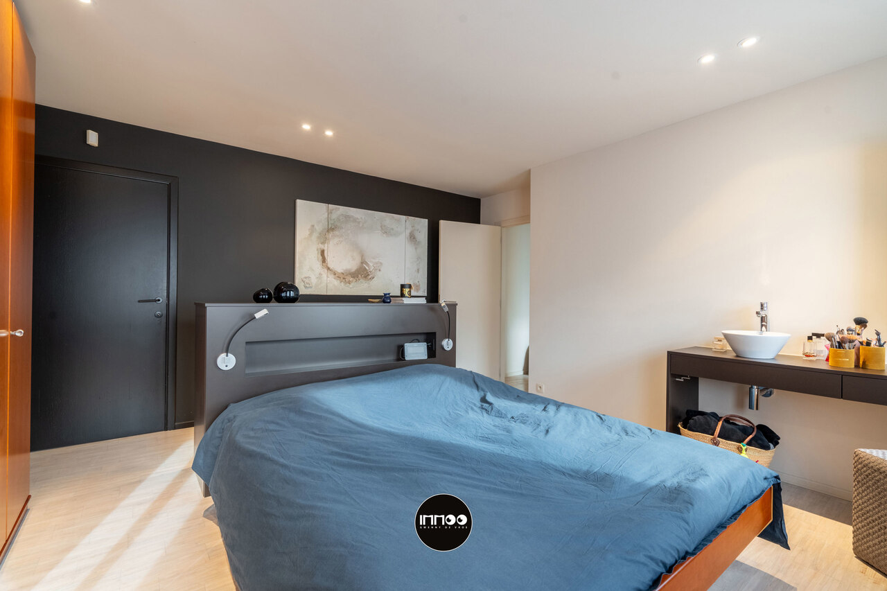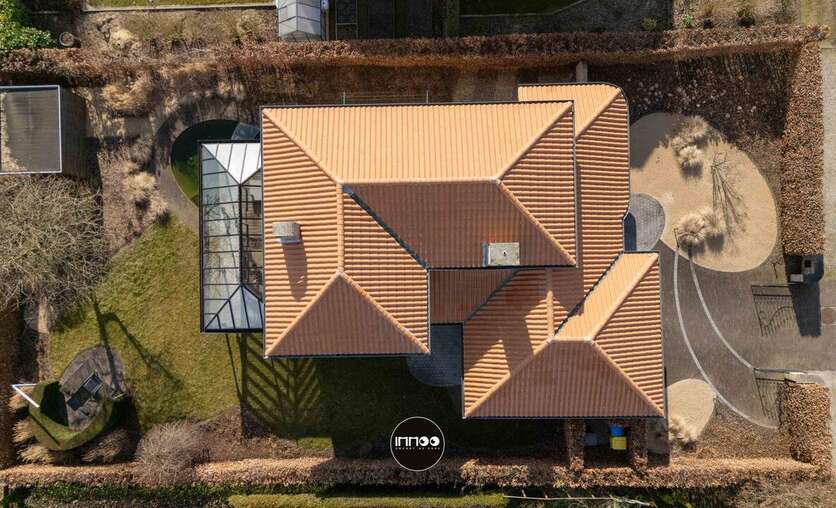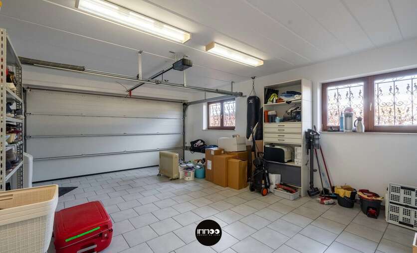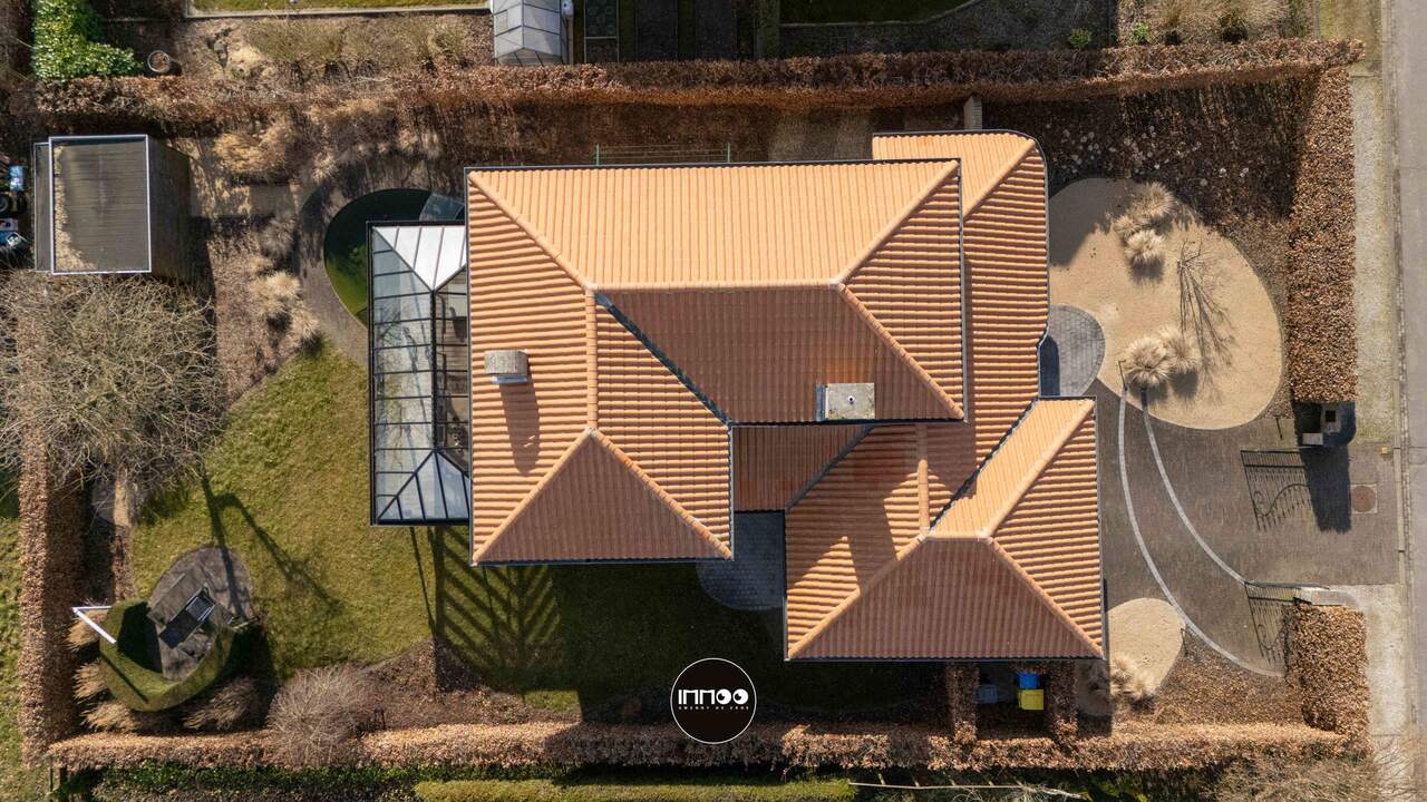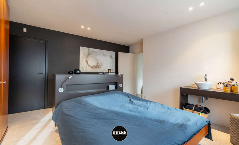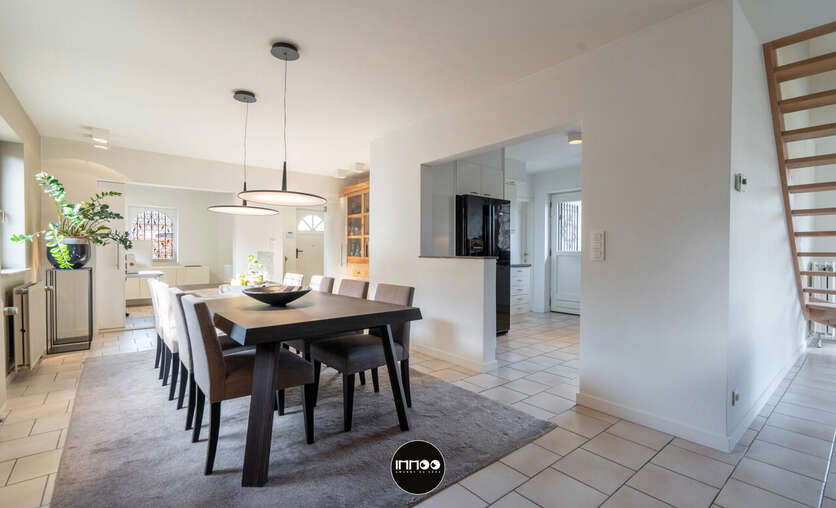 De leefruimte is een oase van gezelligheid, met een sfeervolle haard, een elegante eetplaats en een halfopen keuken die volledig is uitgerust met hoogwaardige toestellen, zoals een Amerikaanse koelkast, een inductievuur en een granieten werkblad. Het aangrenzende terras nodigt je uit om te genieten van zonnige dagen, met als blikvanger een sierlijke pergola en een levendige vijver. Hier kan je heerlijk ontspannen of vrienden en familie ontvangen voor een aperitief.