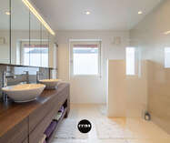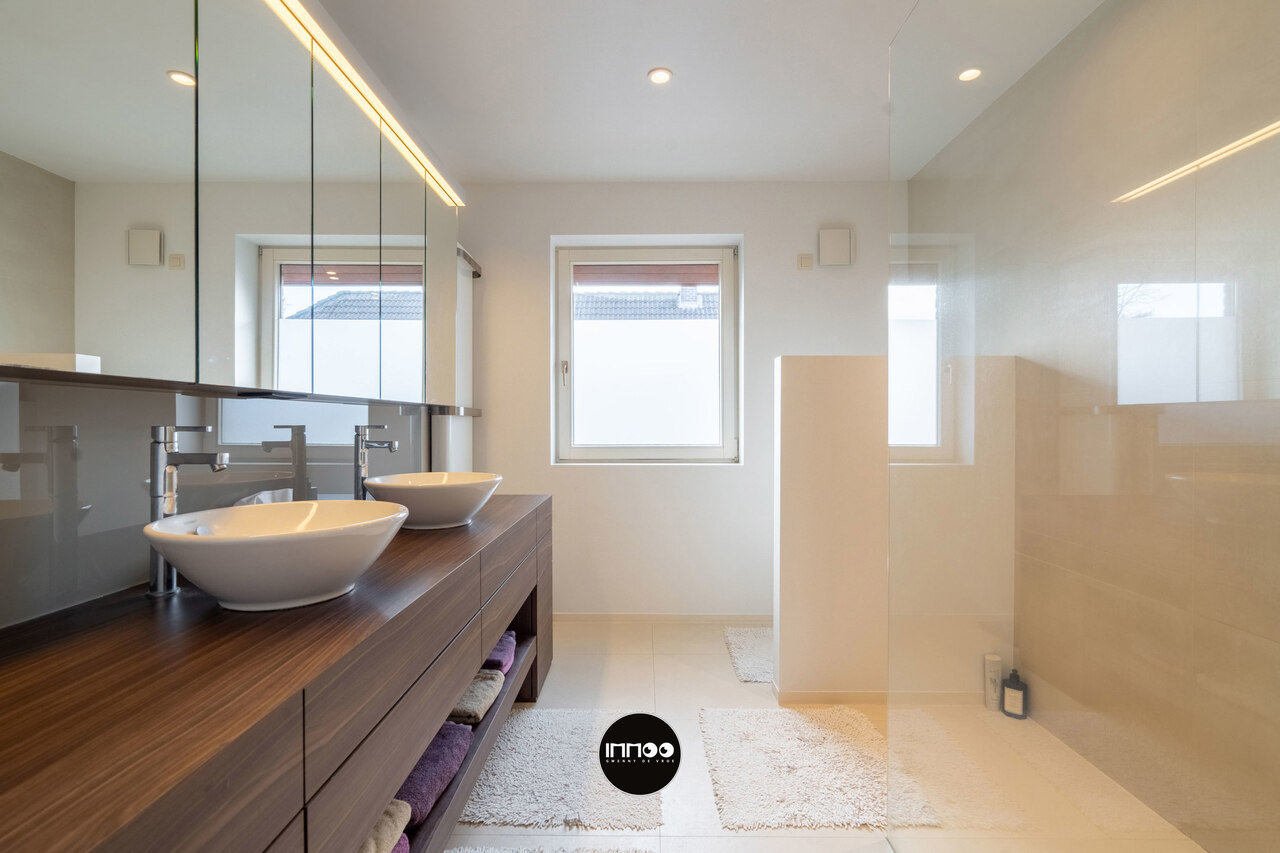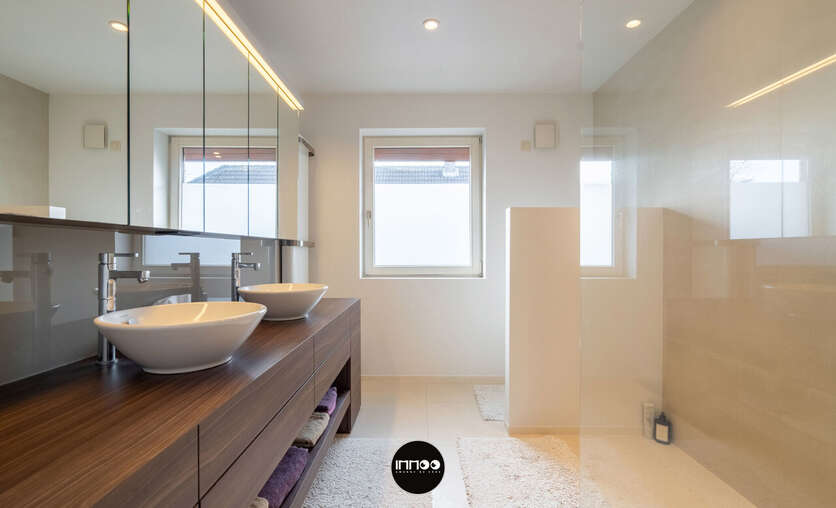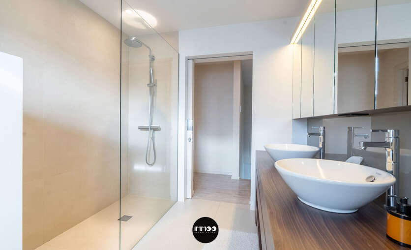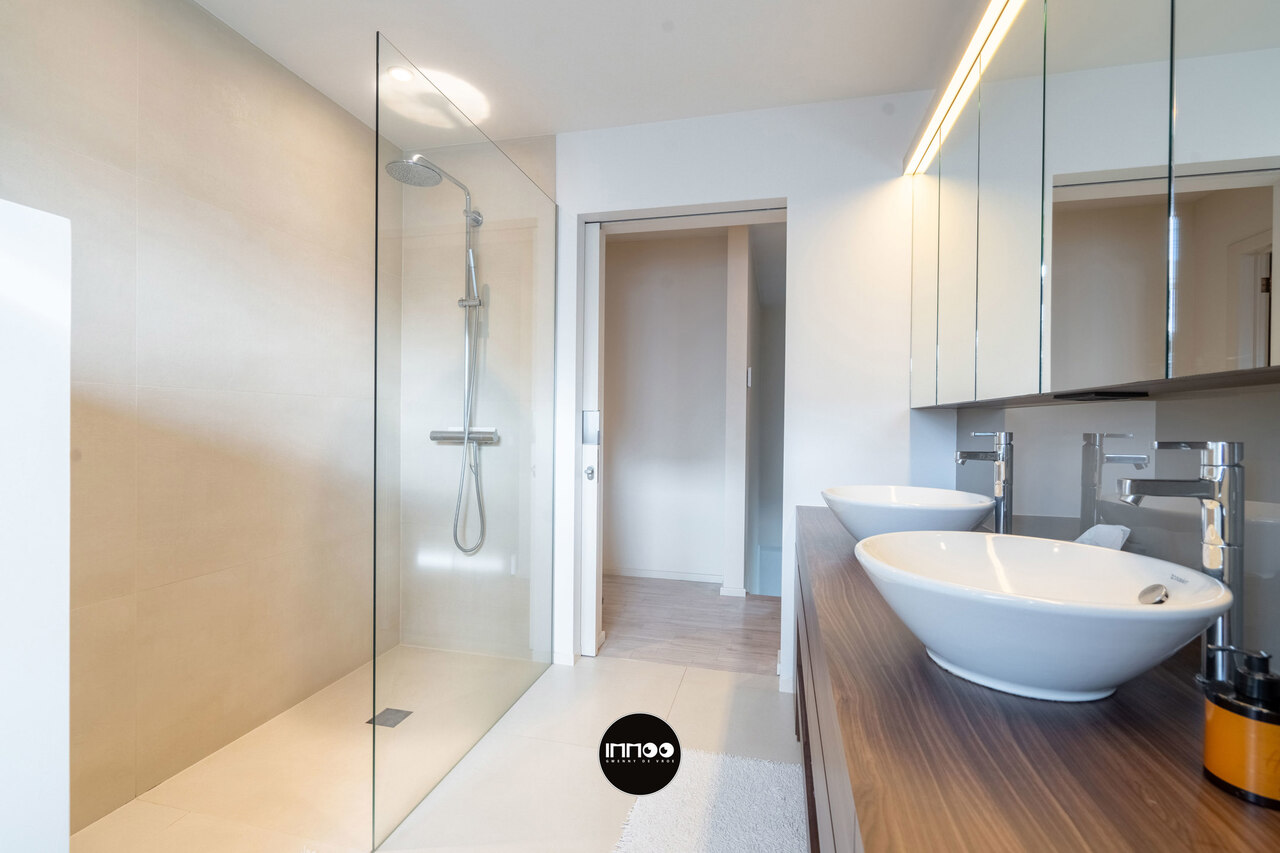 Op de eerste verdieping bevinden zich drie ruime slaapkamers, elk voorzien van handige inbouwkasten. De badkamer, ingericht met een dubbel lavabomeubel, een toilet en een royale inloopdouche, biedt alle comfort die je nodig hebt.