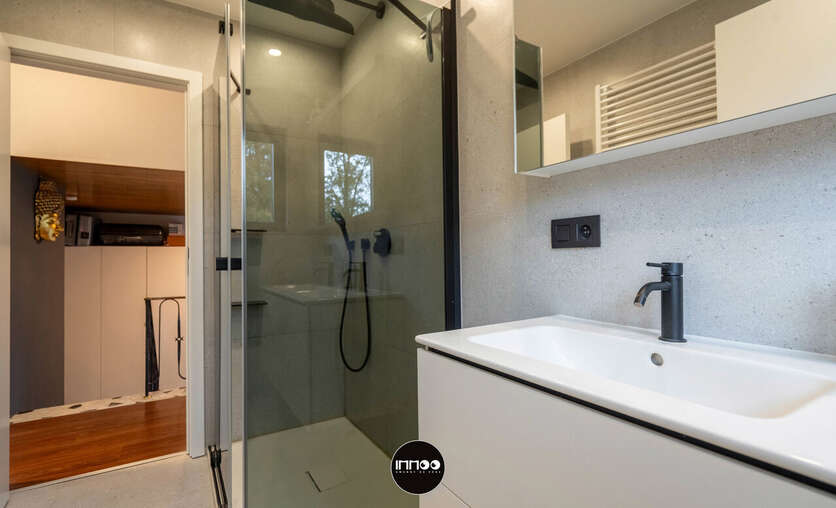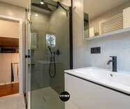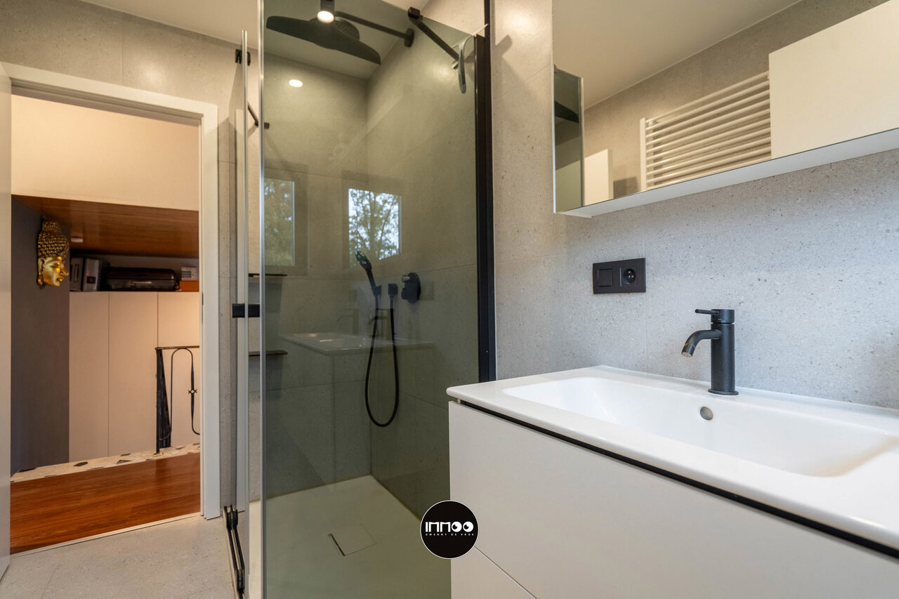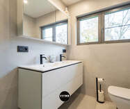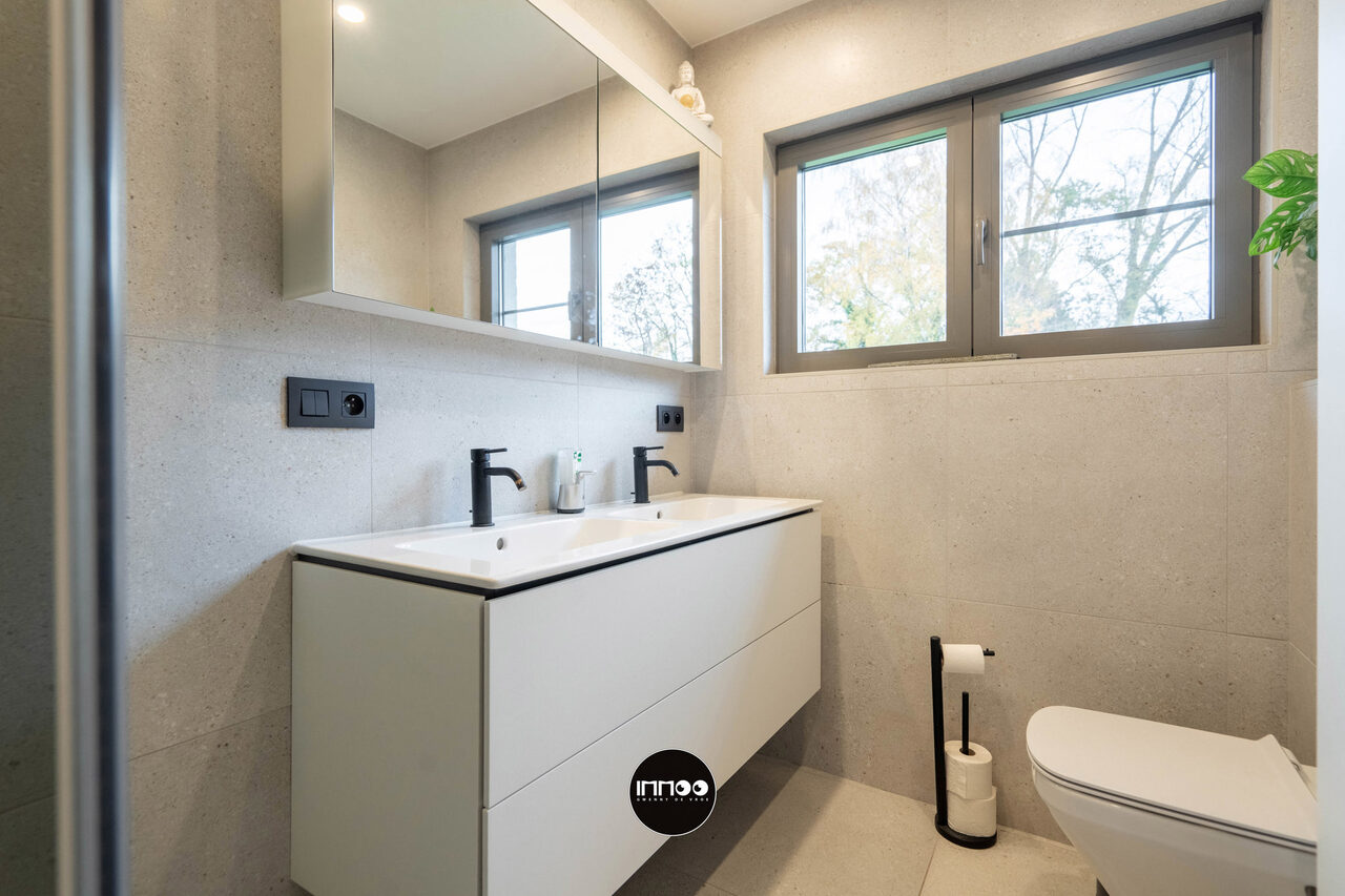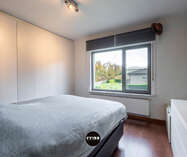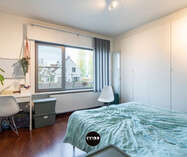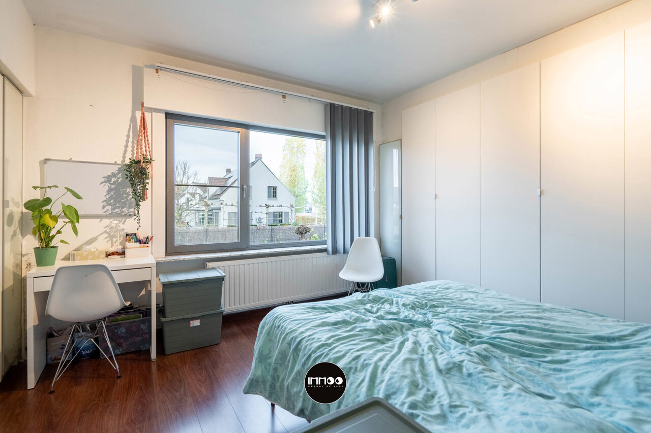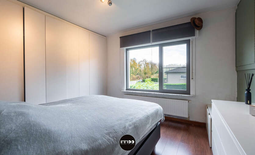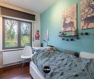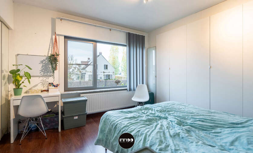 Op het verhoog loopt de laminaat van de nachthal door in de verschillende kamer. Van Links naar rechts heb je een eerste kamer aan de straatzijde met groot raam en inbouwkasten, een badkamer met douche, dubbel lavabo en toilet, een tweede kleiner kamer met raam en een derde kamer met inbouwkasten en groot raam. Vandaar open je het zolderluik dat toegang geeft tot de niet afgewerkte zolder.