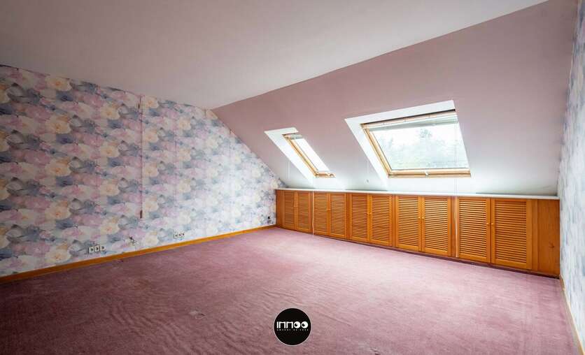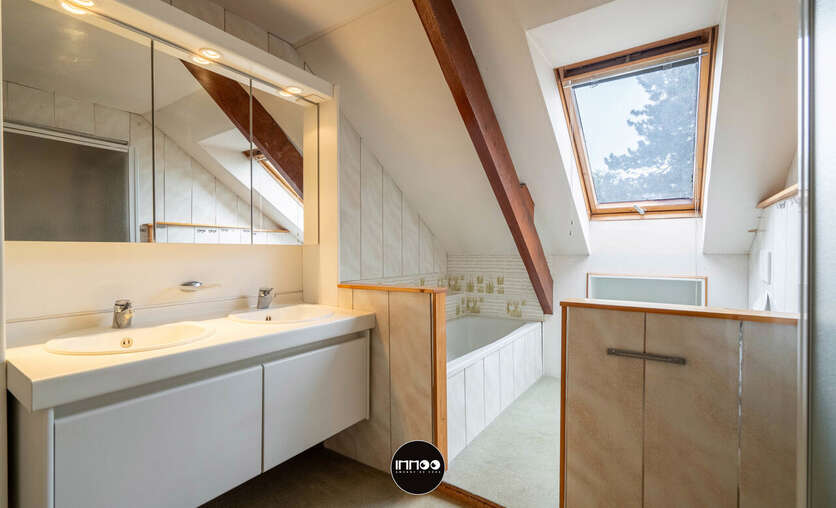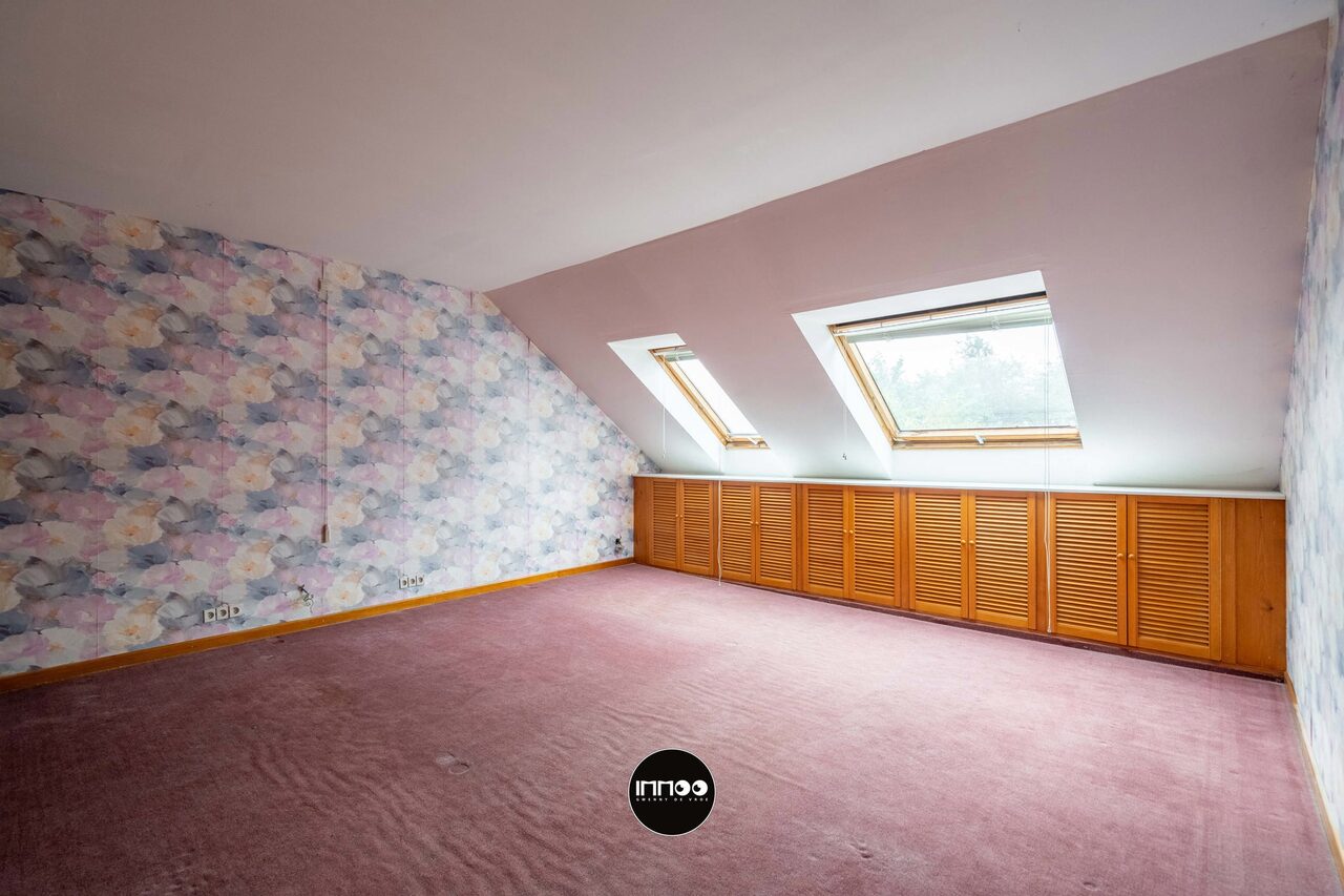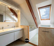 Op de eerste verdieping geeft de nachthal met ingebouwde kasten uit op een eerste ruime slaapkamer, eveneens met ingebouwde kastruimte. Vervolgens bereik je de badkamer met dubbel lavabo, toilet, douche en bad. Als laatste heb je nog een tweede slaapkamer met ingebouwde kasten en een derde niet afgewerkte kamer die eventueel kan dienen als derde slaapkamer.