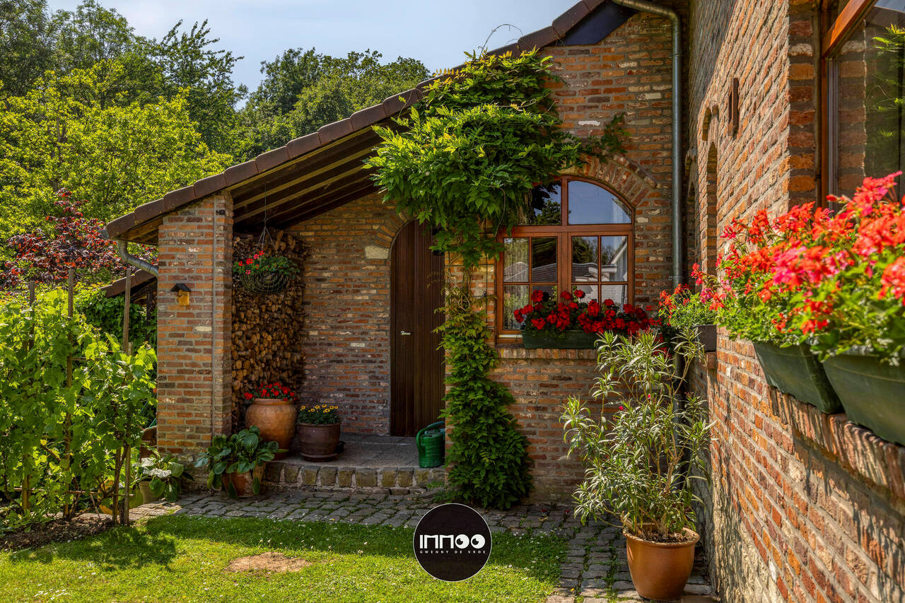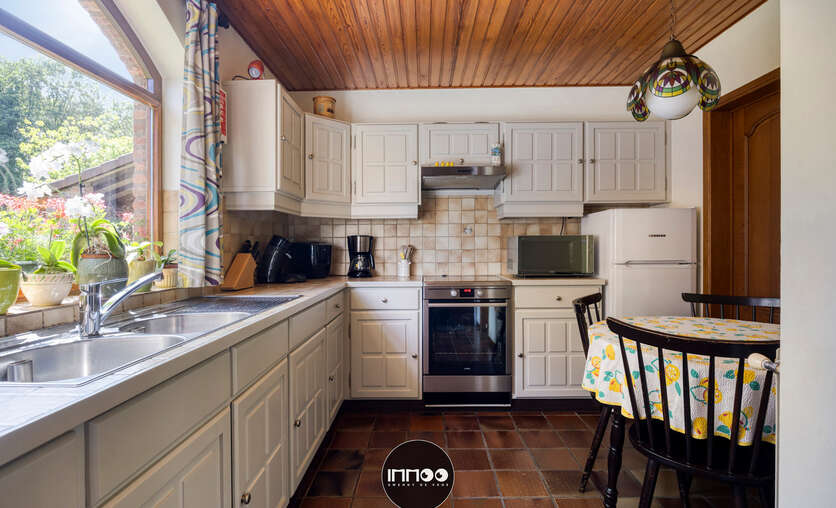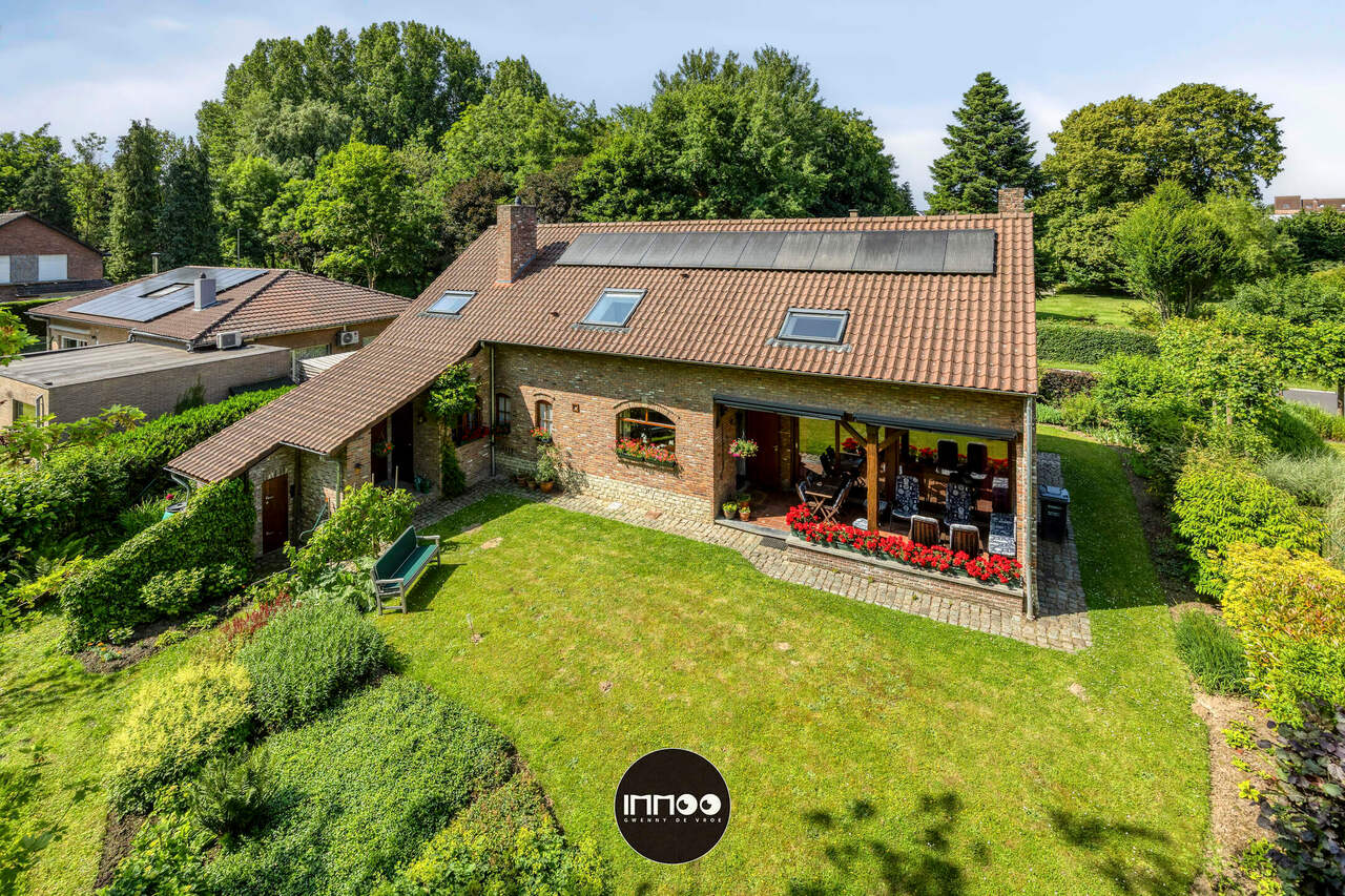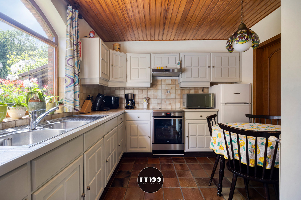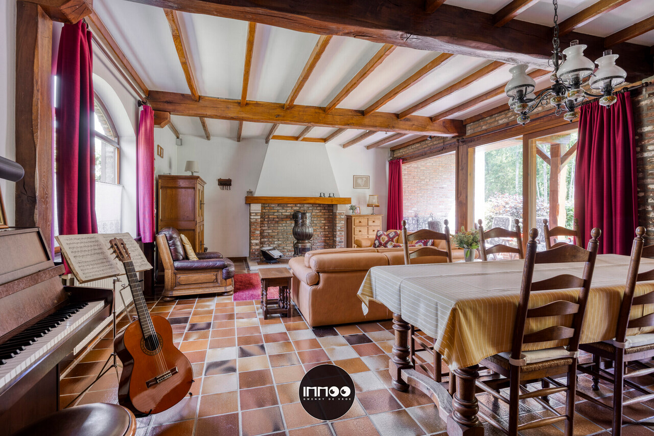 Je wordt verwelkomd in een ruime inkomhal met stijlvolle trap. De open leefruimte met eetruimte en salon ademt charme, waar witte tinten, houten balken en blote bakstenen harmonieus samenkomen. De stoof zorgt voor warmte en gezelligheid. Grote raampartijen laten een overvloed aan natuurlijk licht binnen en bieden een schitterend uitzicht op de groene tuin. De volledig ingerichte keuken in klassiek wit hout nodigt uit om heerlijke gerechten te bereiden met prachtig zicht op de mooie tuin.