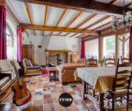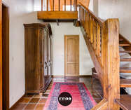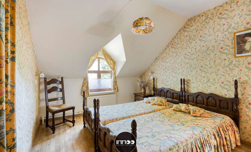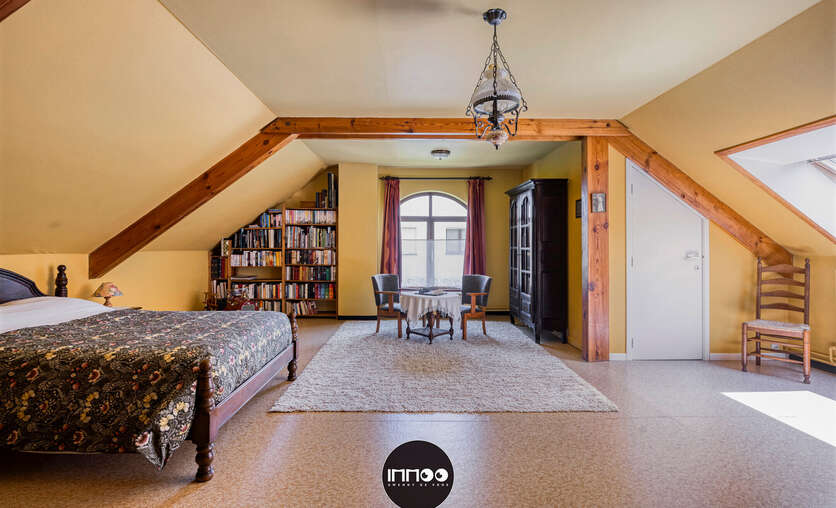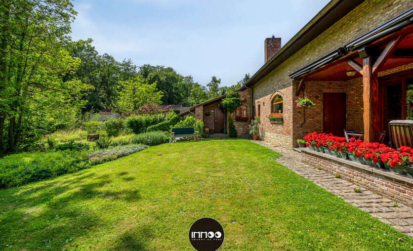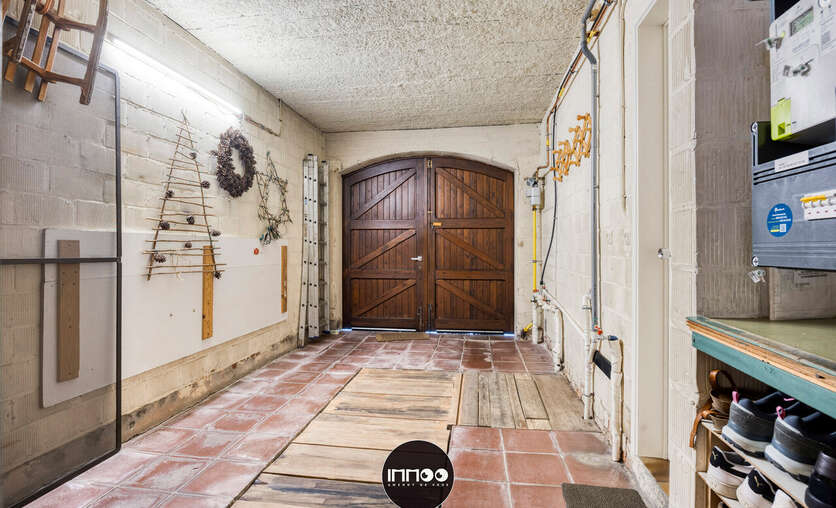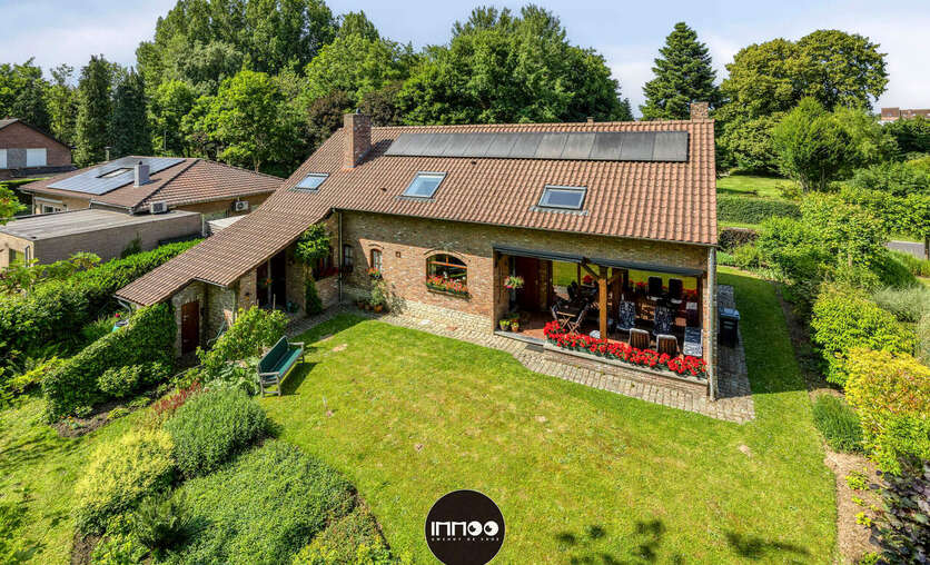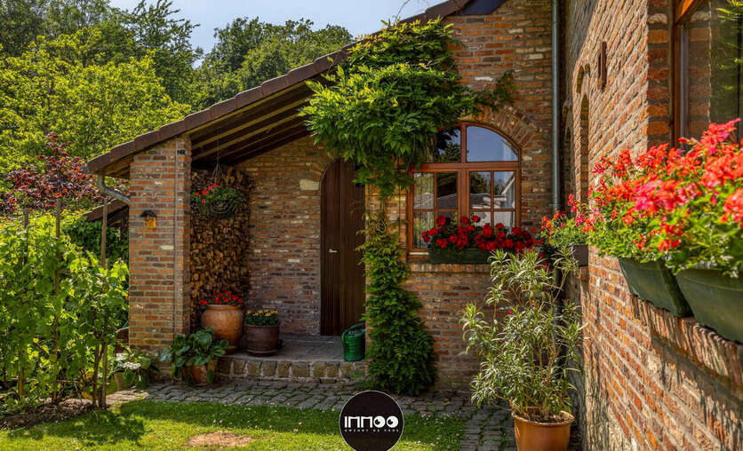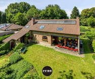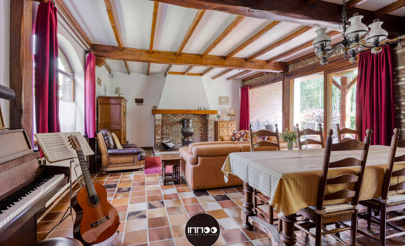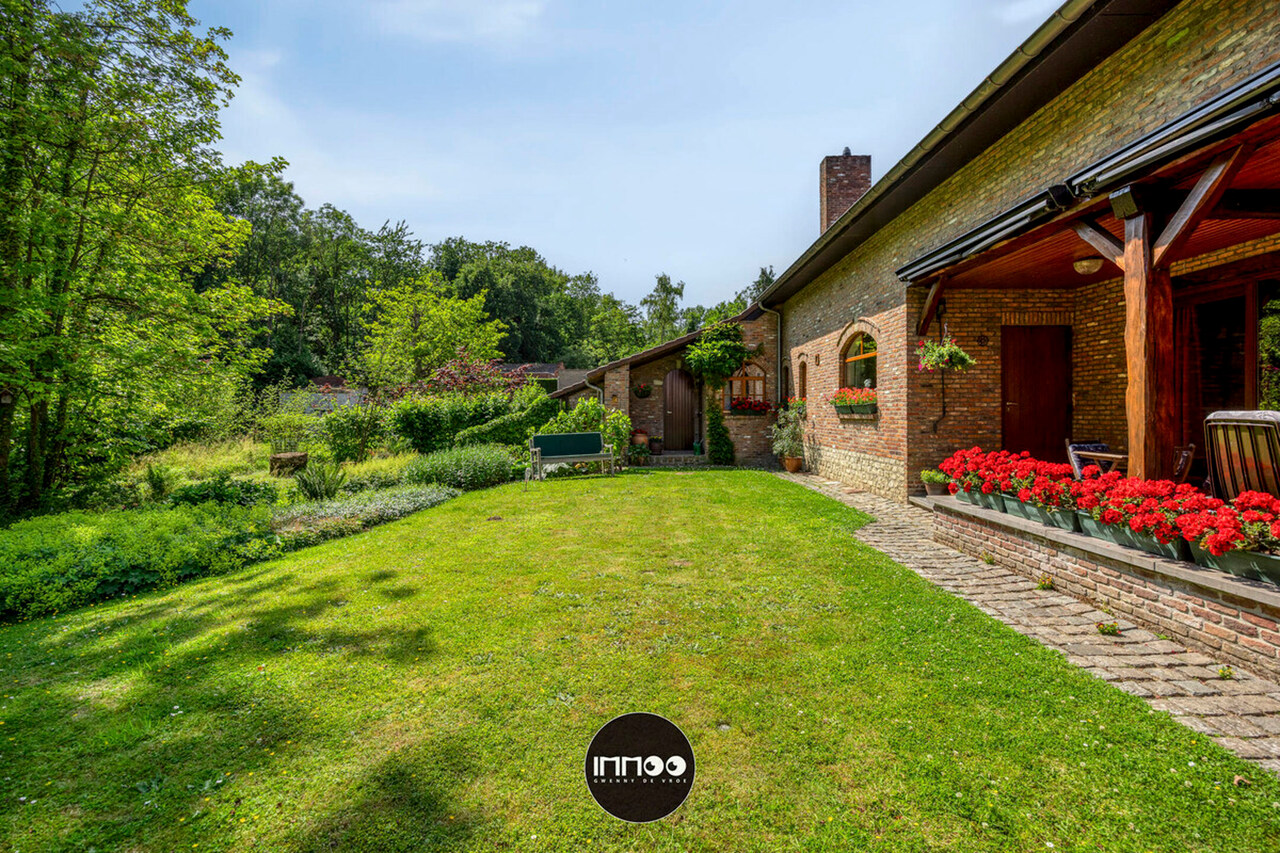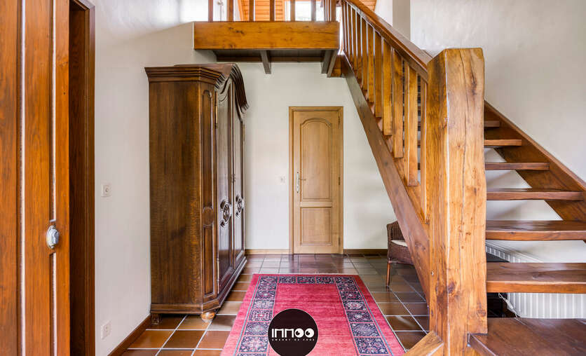 Je wordt verwelkomd in een ruime inkomhal met stijlvolle trap. De open leefruimte met eetruimte en salon ademt charme, waar witte tinten, houten balken en blote bakstenen harmonieus samenkomen. De stoof zorgt voor warmte en gezelligheid. Grote raampartijen laten een overvloed aan natuurlijk licht binnen en bieden een schitterend uitzicht op de groene tuin. De volledig ingerichte keuken in klassiek wit hout nodigt uit om heerlijke gerechten te bereiden met prachtig zicht op de mooie tuin.