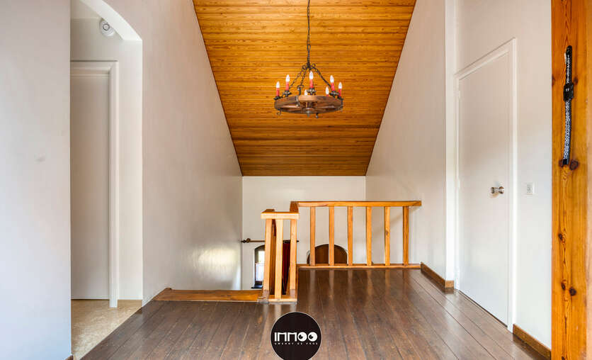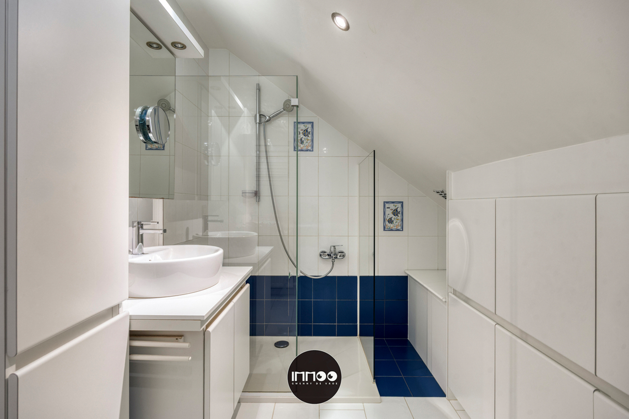 Op de bovenverdieping leidt de nachthal naar drie slaapkamers, waaronder een royale master bedroom, een gezellige tweepersoonskamer en een kamer met bureau. Een extra troef is de aparte bureauruimte, perfect als extra slaapkamer in te richten. De stijlvolle badkamer met inloopdouche en lavabomeubel maakt het plaatje compleet.