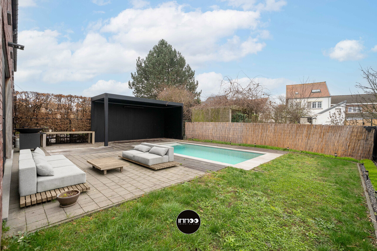 De zuidgerichte, onderhoudsvriendelijke tuin is ingericht met een terras, pergola en zwembad verwarmd met warmtepomp, wat garant staat voor optimaal genieten in alle rust en privacy.