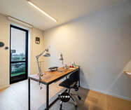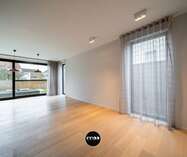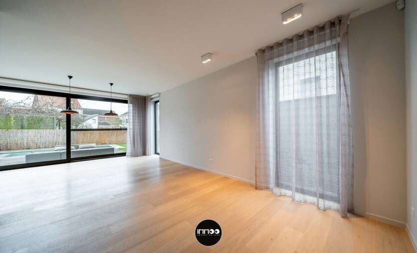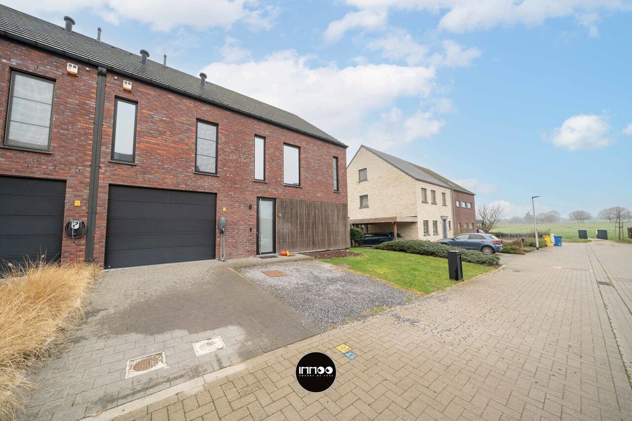 Via de oprit met autostaanplaats en laadpunt voor een elektrische wagen bereik je de woning. De inkomhal met vestiairekast geeft links toegang tot het gastentoilet. Rechtdoor de glazen deur opent zich een lichtrijke open leefruimte met een volledig ingerichte moderne open keuken, eethoek en salon. Het grote schuifraam zorgt voor een sterke connectie met de zuidgerichte tuin. Aansluitend bevindt zich een apart bureau met kenmerkende deur, ideaal voor thuiswerk. Verder is er een praktische wasplaats, discreet weggewerkt achter een valse wand en met rechtstreekse toegang tot de tuin. Vanuit deze zone is ook de garage met plaats voor één wagen bereikbaar, uitgerust met de nodige technische voorzieningen zoals wateraansluiting, waterontharder, elektriciteitskast en gasinstallatie.