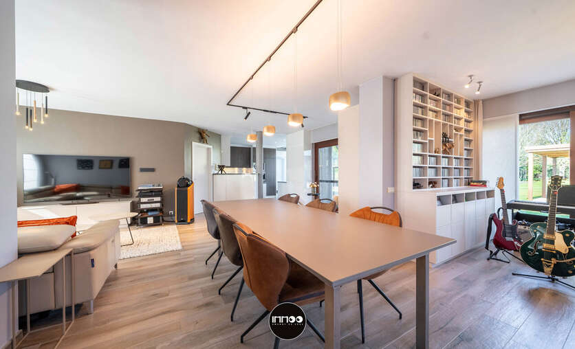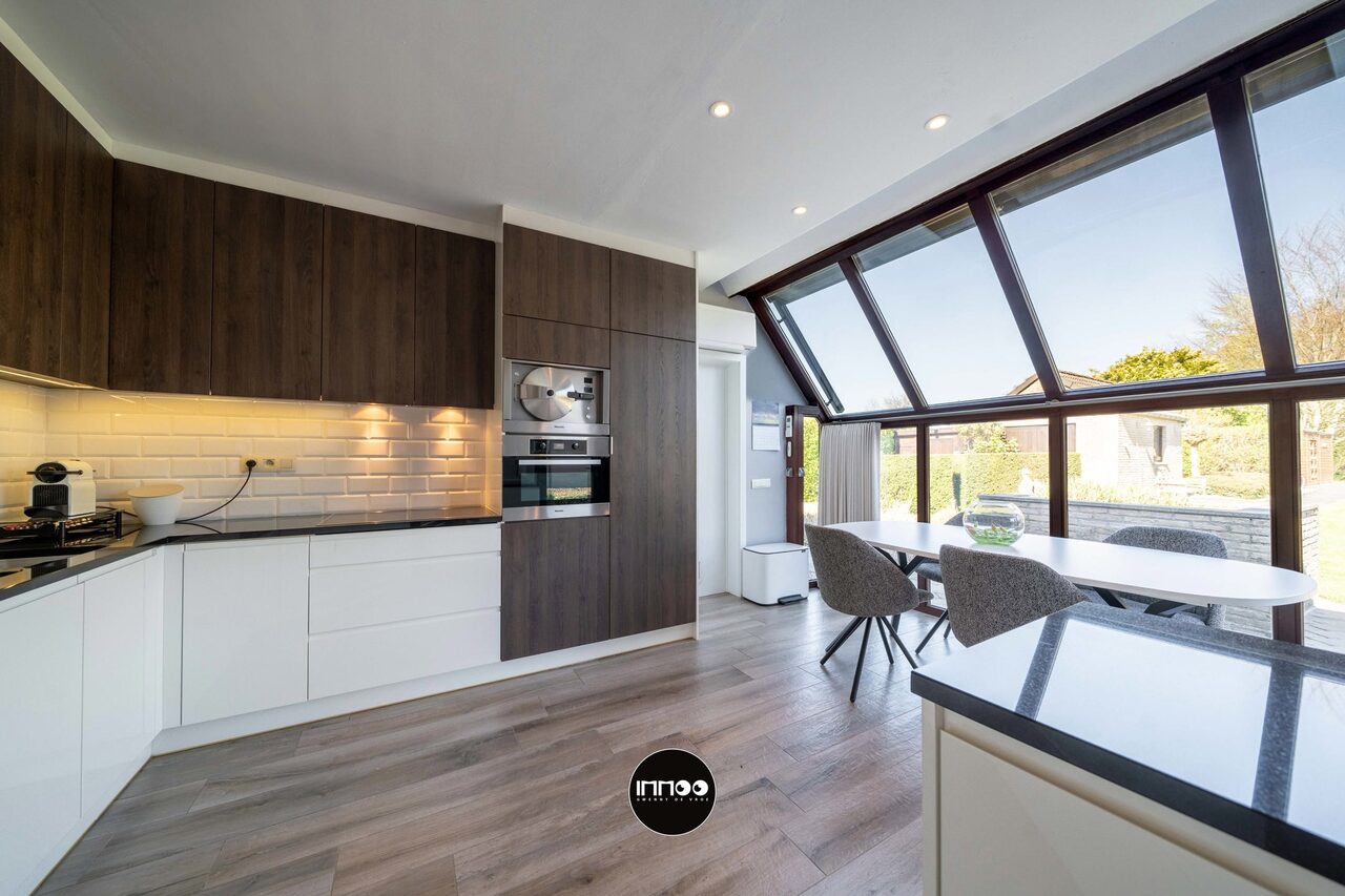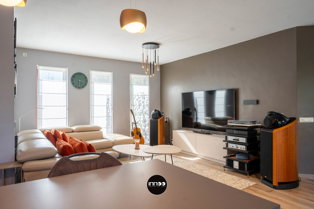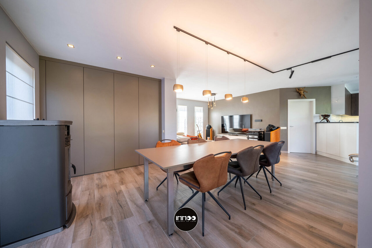 Deze instapklare woning verwelkomt u via een verzorgde inkomhal met vestiaire, trappenhuis en apart gastentoilet. Van hieruit betreedt u de open leefruimte waar gezelligheid en functionaliteit hand in hand gaan. De lichtrijke woonkamer omvat een sfeervol salon, een ruime eethoek en een praktische inbouwkast met geïntegreerd bureau. Daarnaast is er een aparte muziekhoek voorzien, ideaal voor ontspanning of hobby’s. Aansluitend bevindt zich de volledig uitgeruste keuken in zwarte natuursteen, voorzien van hoogwaardige Miele-toestellen zoals een combi-microgolf en een hogedruk stoomoven. De keuken beschikt tevens over een gezellige ontbijttafel en geniet van een overvloed aan natuurlijk licht.