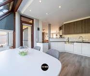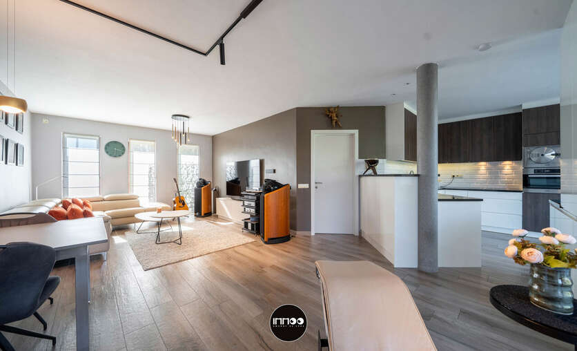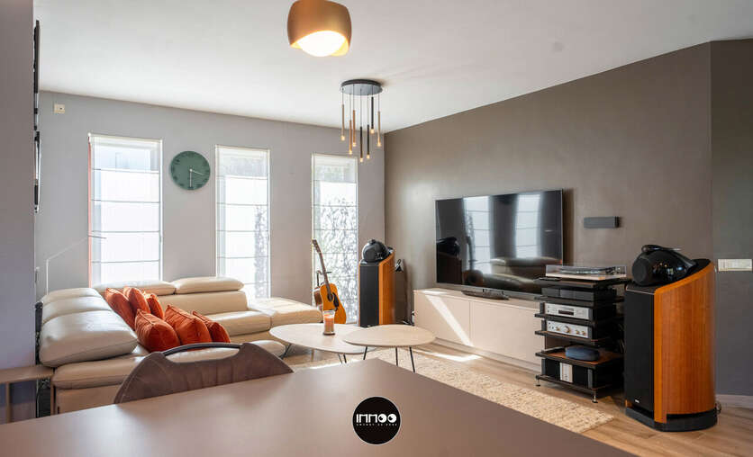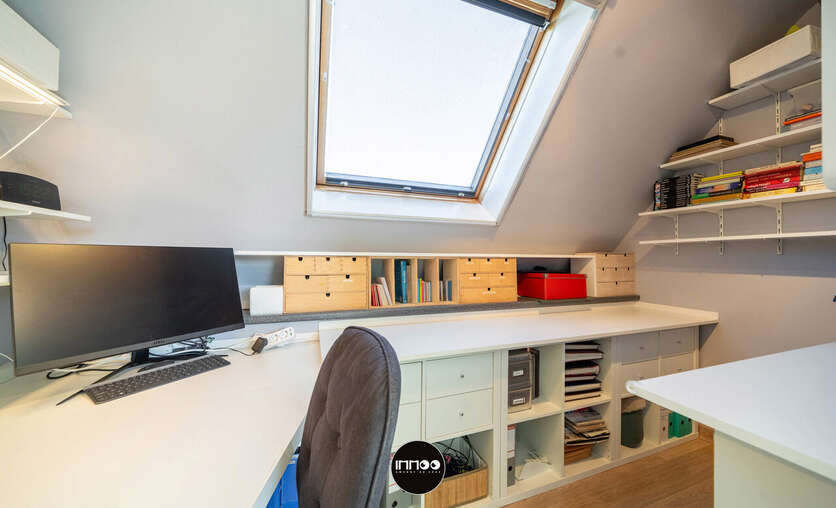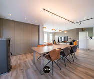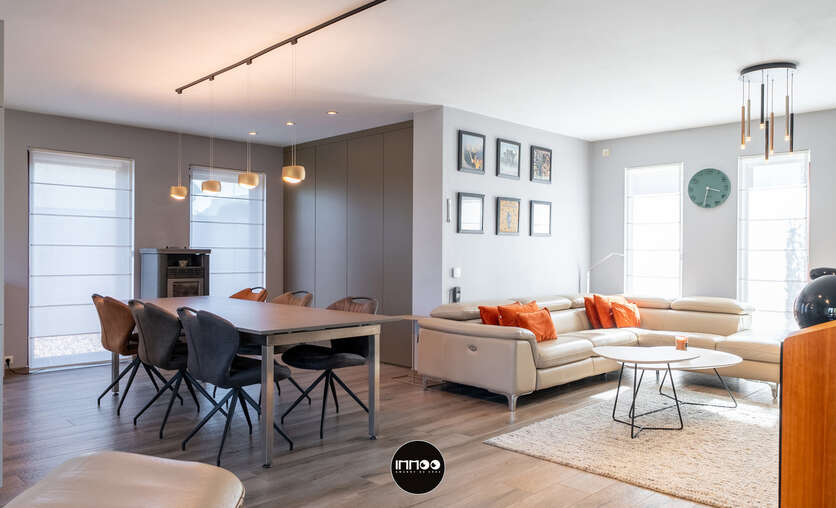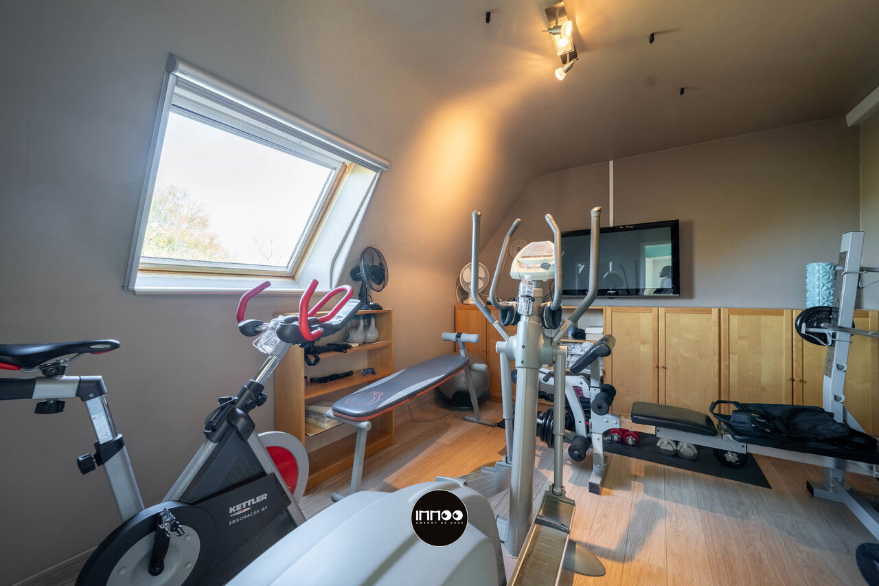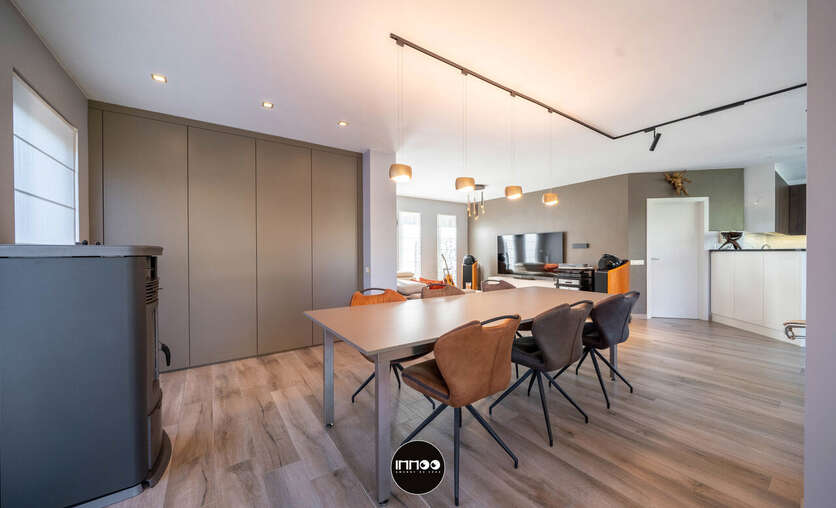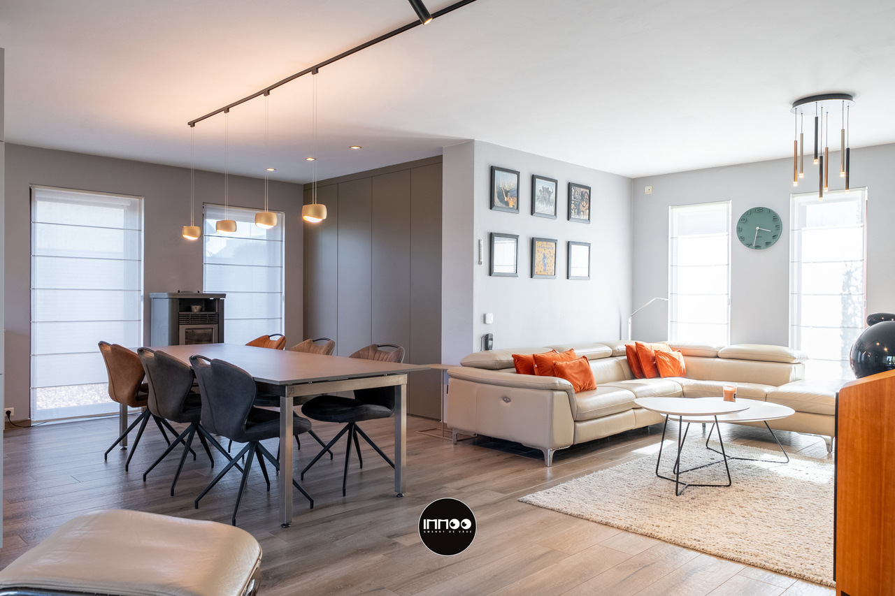 Deze instapklare woning verwelkomt u via een verzorgde inkomhal met vestiaire, trappenhuis en apart gastentoilet. Van hieruit betreedt u de open leefruimte waar gezelligheid en functionaliteit hand in hand gaan. De lichtrijke woonkamer omvat een sfeervol salon, een ruime eethoek en een praktische inbouwkast met geïntegreerd bureau. Daarnaast is er een aparte muziekhoek voorzien, ideaal voor ontspanning of hobby’s. Aansluitend bevindt zich de volledig uitgeruste keuken in zwarte natuursteen, voorzien van hoogwaardige Miele-toestellen zoals een combi-microgolf en een hogedruk stoomoven. De keuken beschikt tevens over een gezellige ontbijttafel en geniet van een overvloed aan natuurlijk licht.