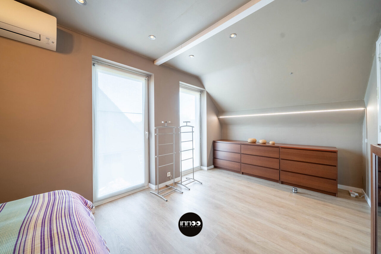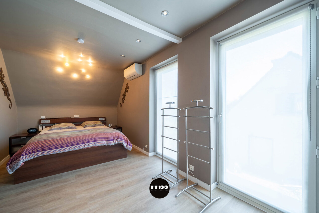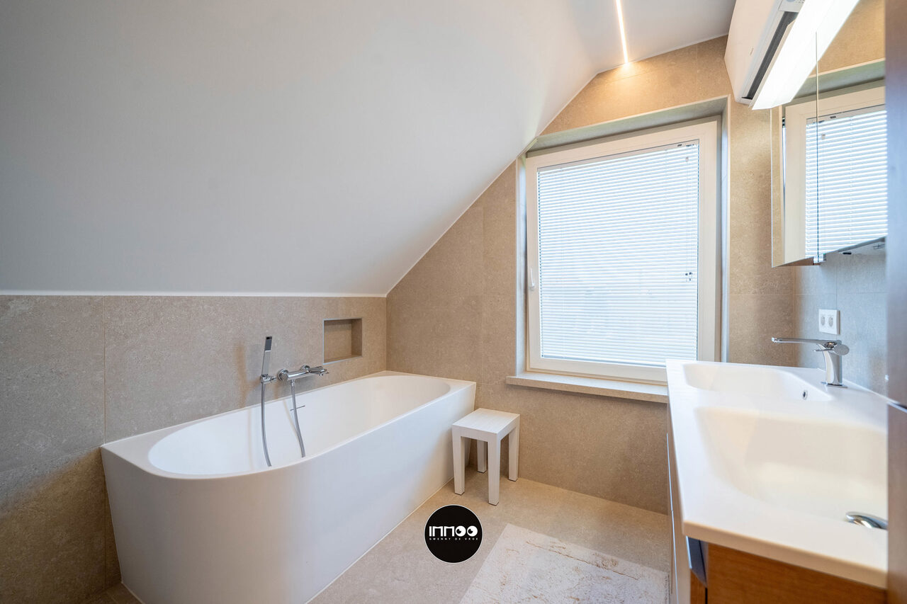 Op de eerste verdieping geeft de nachthal toegang tot de master bedroom met ruime dressing en twee volwaardige slaapkamers. Elke kamer is uitgerust met een airco/heating systeem aangestuurd door een energiezuinige warmtepomp. Verder is er een aparte bureauruimte, een tweede toilet en een kwalitatief afgewerkte badkamer (2024) met douche, ligbad en dubbele lavabo.