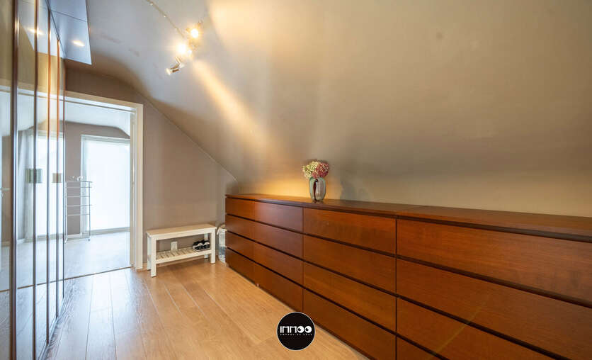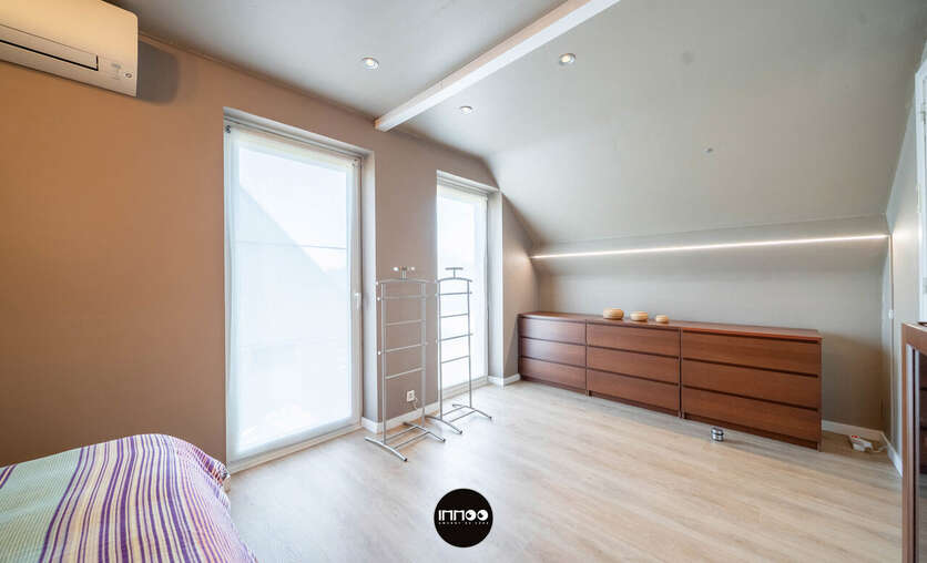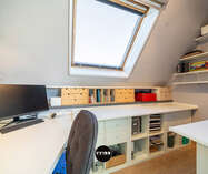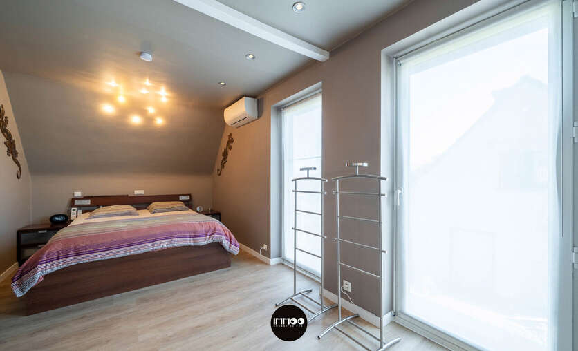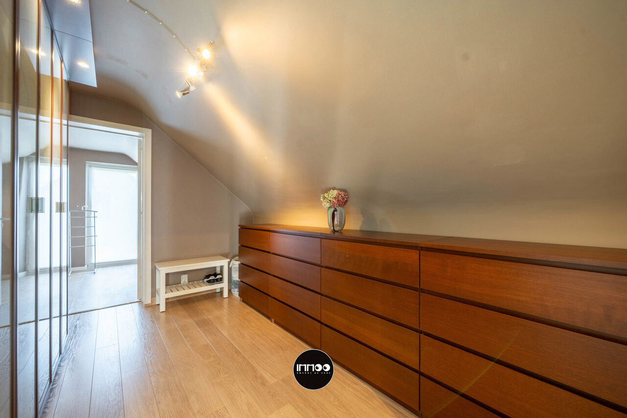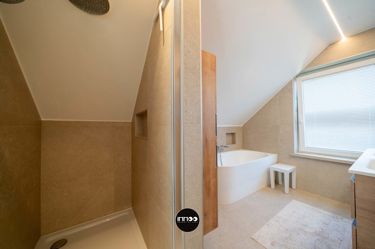 Op de eerste verdieping geeft de nachthal toegang tot de master bedroom met ruime dressing en twee volwaardige slaapkamers. Elke kamer is uitgerust met een airco/heating systeem aangestuurd door een energiezuinige warmtepomp. Verder is er een aparte bureauruimte, een tweede toilet en een kwalitatief afgewerkte badkamer (2024) met douche, ligbad en dubbele lavabo.