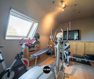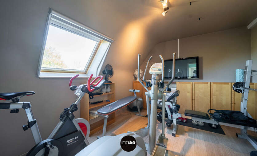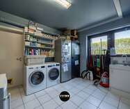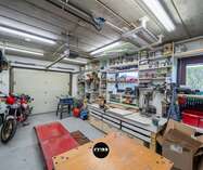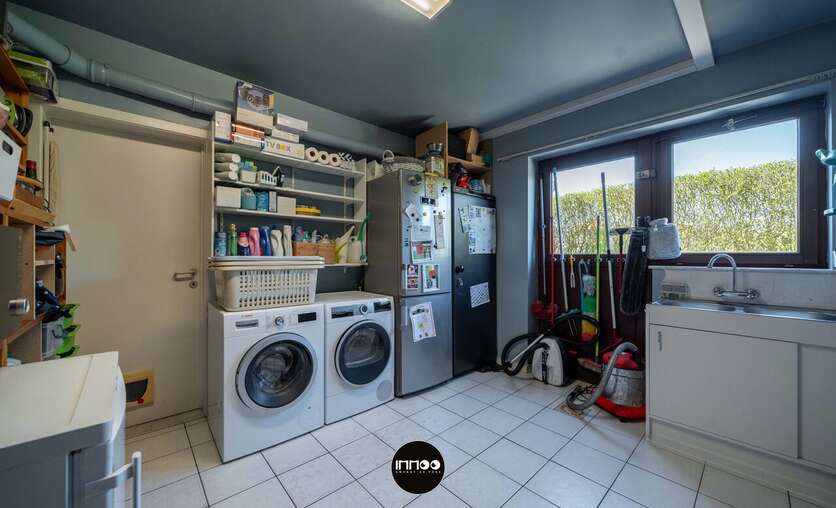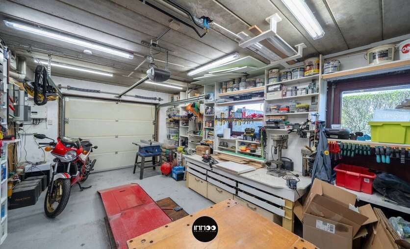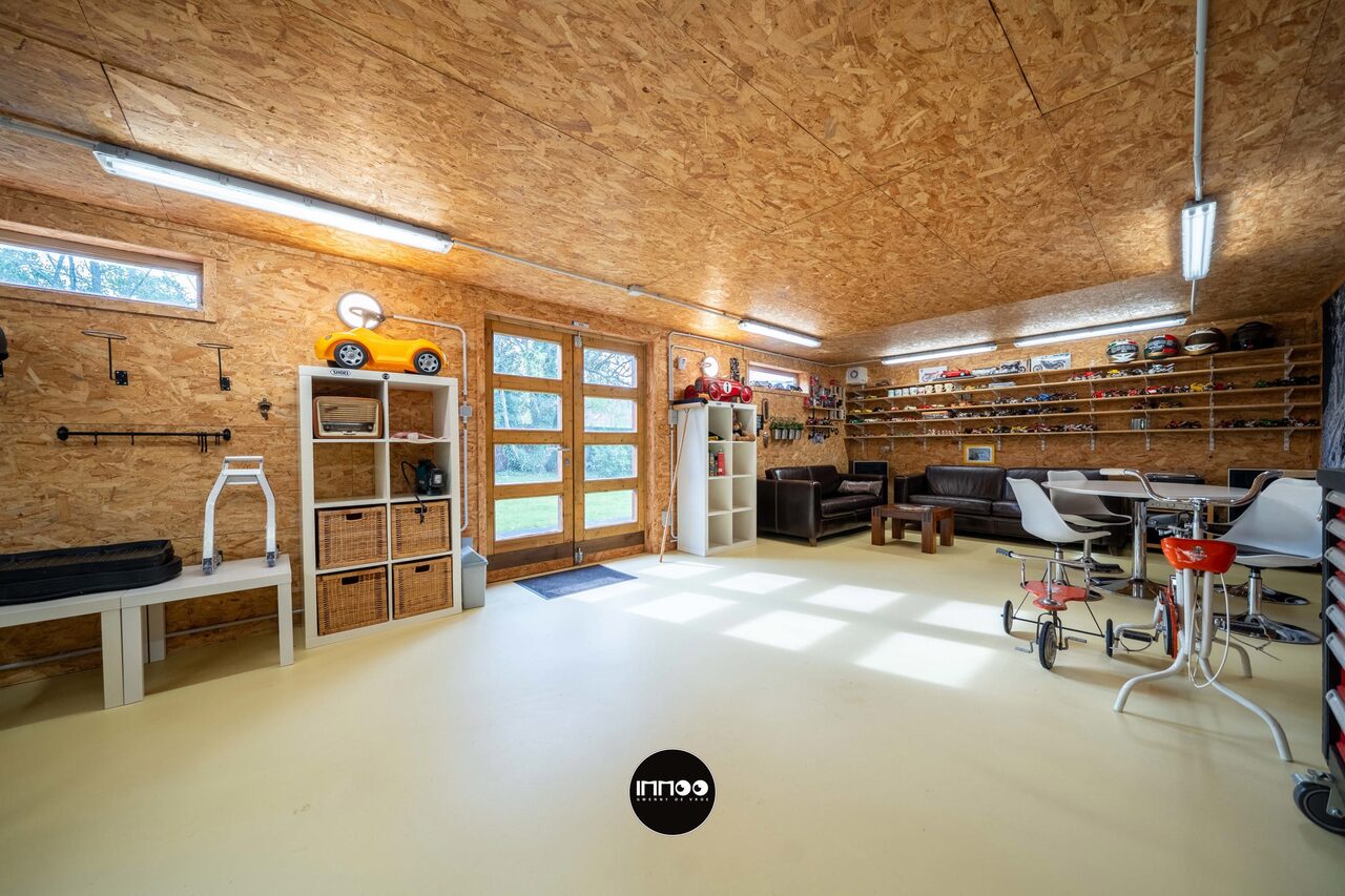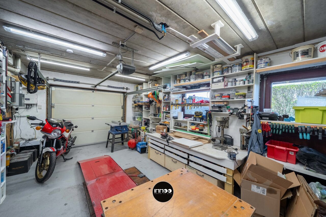 Verder leidt de keuken naar de praktische wasruimte met lavabo en extra bergruimte, die op haar beurt toegang biedt tot de garage met werkput en ingerichte werkplaats.