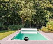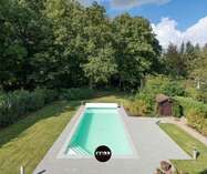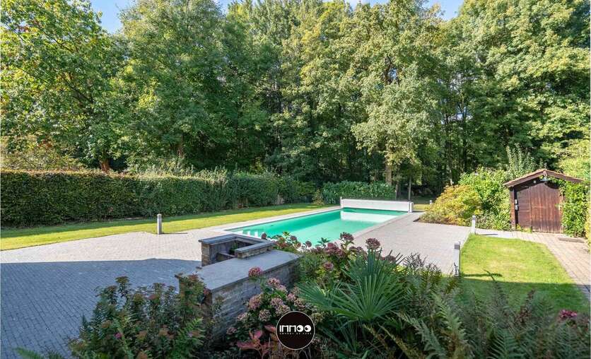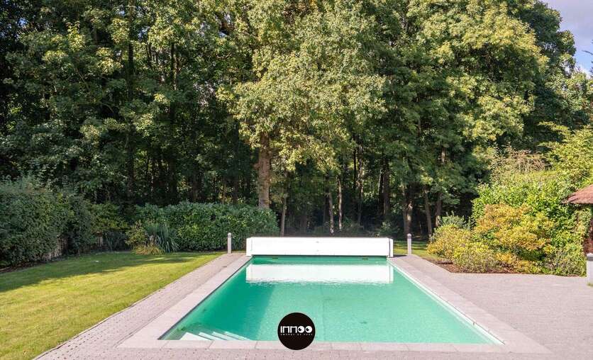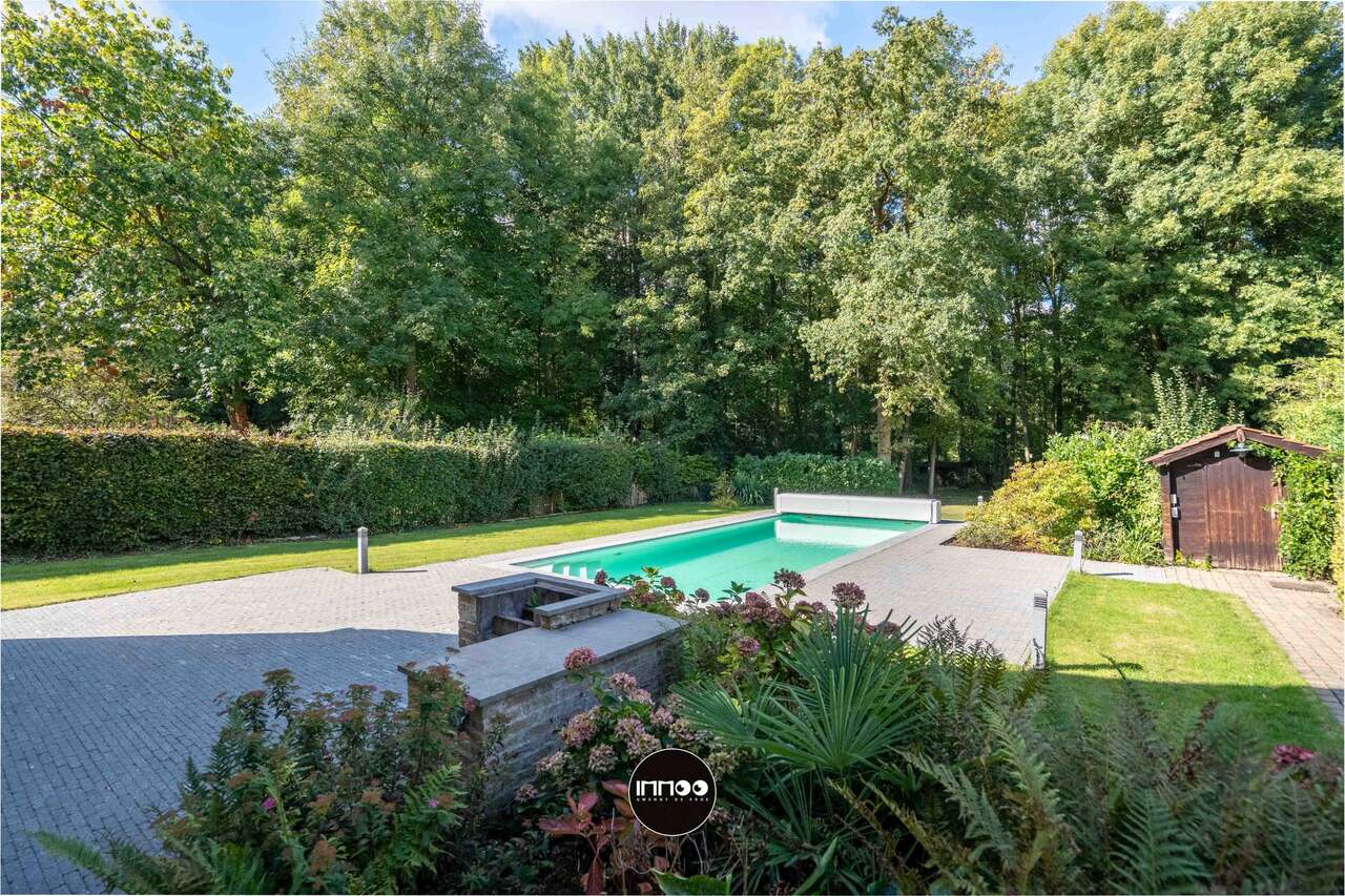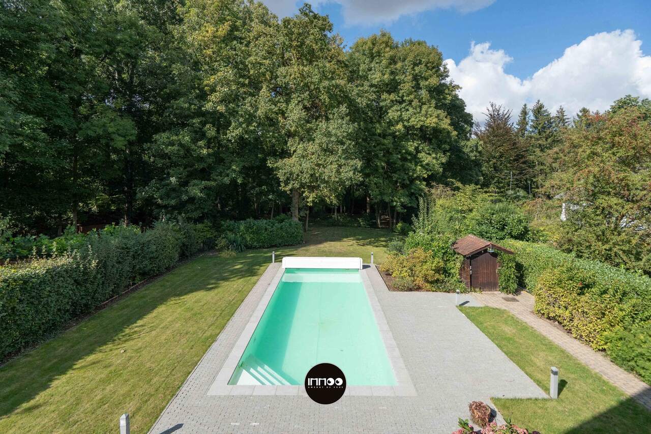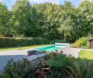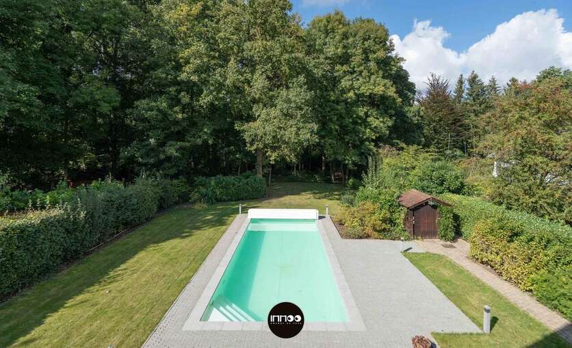 De tuin doet je meteen wegdromen van vakantie. Via het schuifraam in de woonkamer heb je toegang tot het zwembad. De tuin is mooi ingericht met verschillende eiken en een pad naar de achteren om het tuinhuis te bereiken.