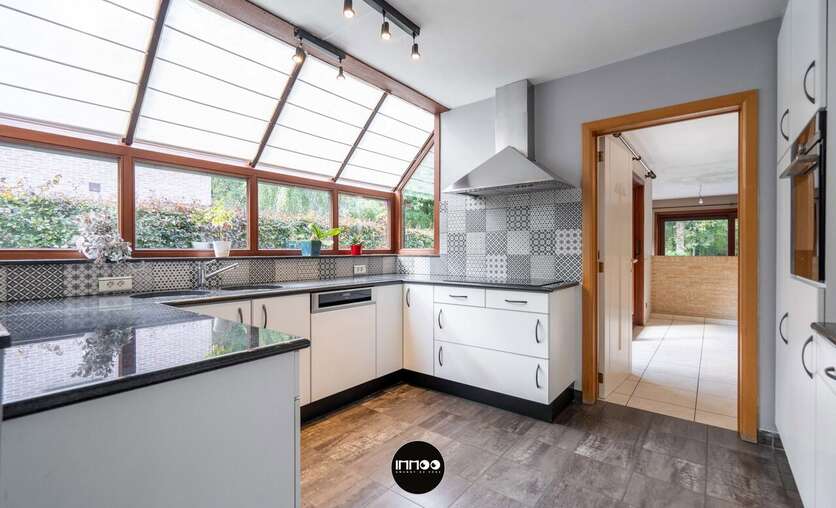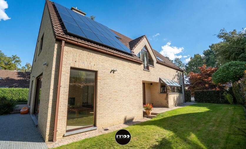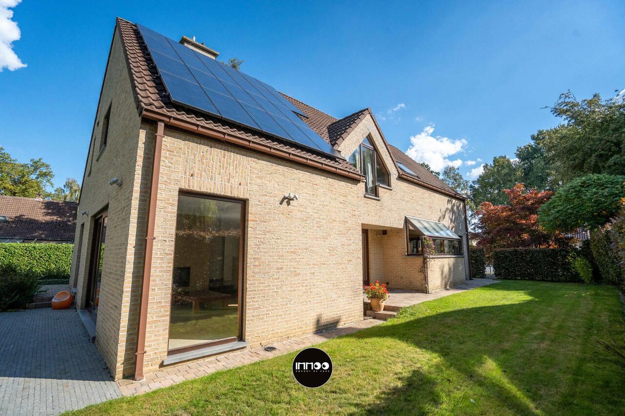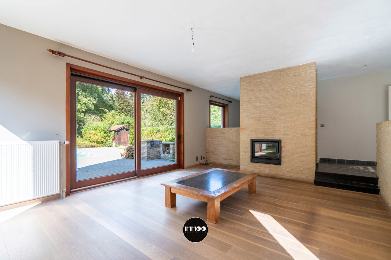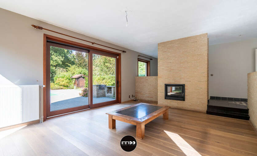 Via de ruime oprit bereikt u aan de rechterkant van de woning de inkomdeur. Via de inkomhal met trappenhuis, wasruimte, gastentoilet en vestiaire bereik je links meteen een garage met plaats voor een wagen en opbergruimte. De inkomhal geeft je rechts toegang tot de lichtrijke open woonkamer met centraal gelegen kachel. Rechts heb je een afgescheiden bureauruimte/leeshoek met zicht op de tuin en het zwembad. Verder door is er een mooie ruimte om het salon en de eethoek naar smaak en wens in te richten. Aansluitend bereik je de volledig uitgeruste keuken met granieten werkbladen en afgescheiden berging.