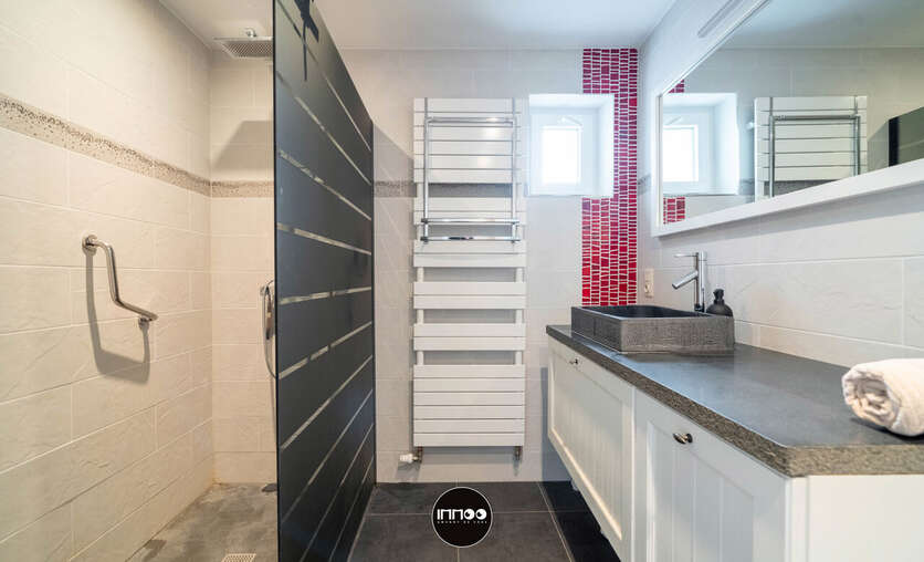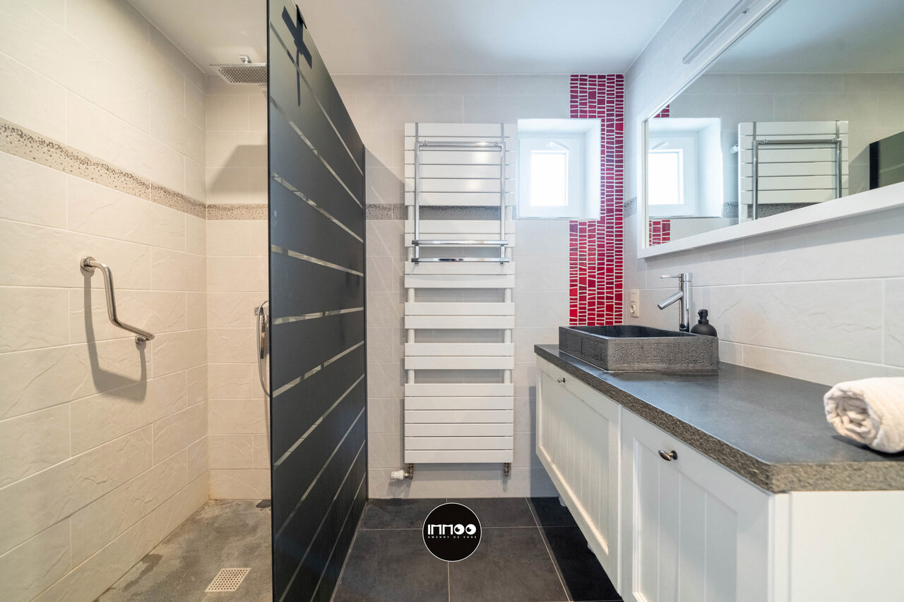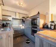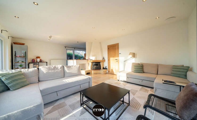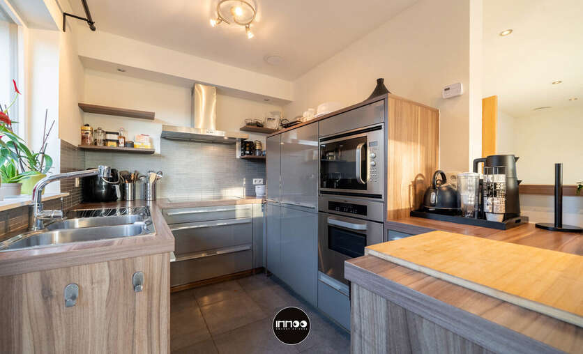 Via de zijdeur bereik je de inkomhal met aansluitingen voor een wasmachine en droogkast. Links bereik je de open living met ruime voor een salon en eethoek. De houtkachel zorgt hier voor een gezellige warmte en de grote ramen laten een overvloed aan licht binnen. Aansluitend bereik je de volledig uitgeruste keuken waar je met plezier je beste kookkunsten in bovenhaalt.