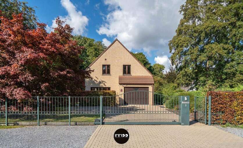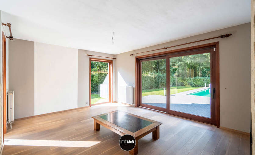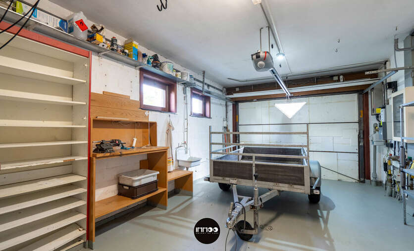 Via de ruime oprit bereikt u aan de rechterkant van de woning de inkomdeur. Via de inkomhal met trappenhuis, wasruimte, gastentoilet en vestiaire bereik je links meteen een garage met plaats voor een wagen en opbergruimte. De inkomhal geeft je rechts toegang tot de lichtrijke open woonkamer met centraal gelegen kachel. Rechts heb je een afgescheiden bureauruimte/leeshoek met zicht op de tuin en het zwembad. Verder door is er een mooie ruimte om het salon en de eethoek naar smaak en wens in te richten. Aansluitend bereik je de volledig uitgeruste keuken met granieten werkbladen en afgescheiden berging.