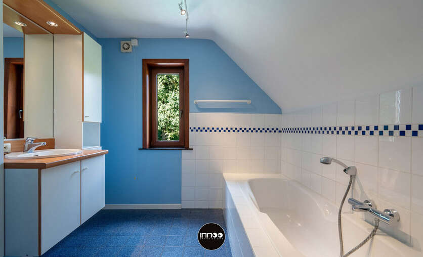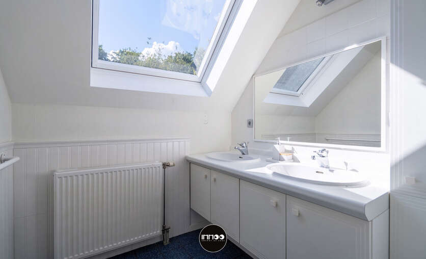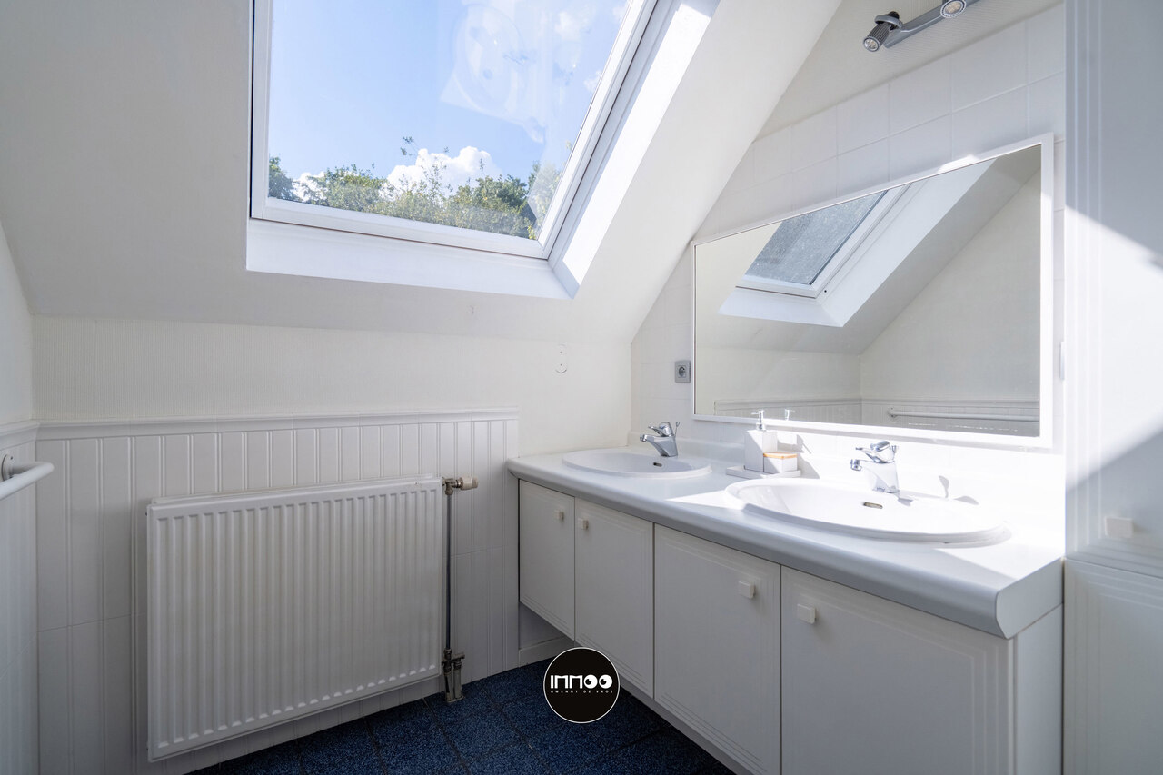 Op de eerste verdieping is er een handige inbouwkast voorzien in de nachthal. Die geeft langs de linkerkant toegang tot een berging, apart toilet, twee kamers en een douchekamer met dubbel lavabo. Langs de andere kant bevinden zich een derde en vierde kamer, een vestiaire en een badkamer met lavabomeubel en bad.