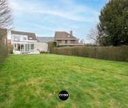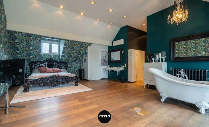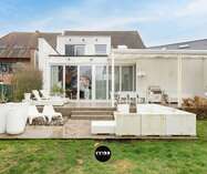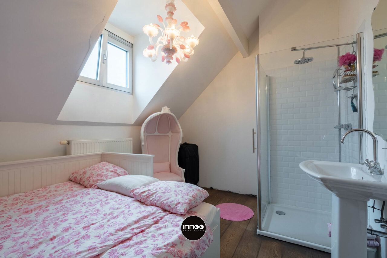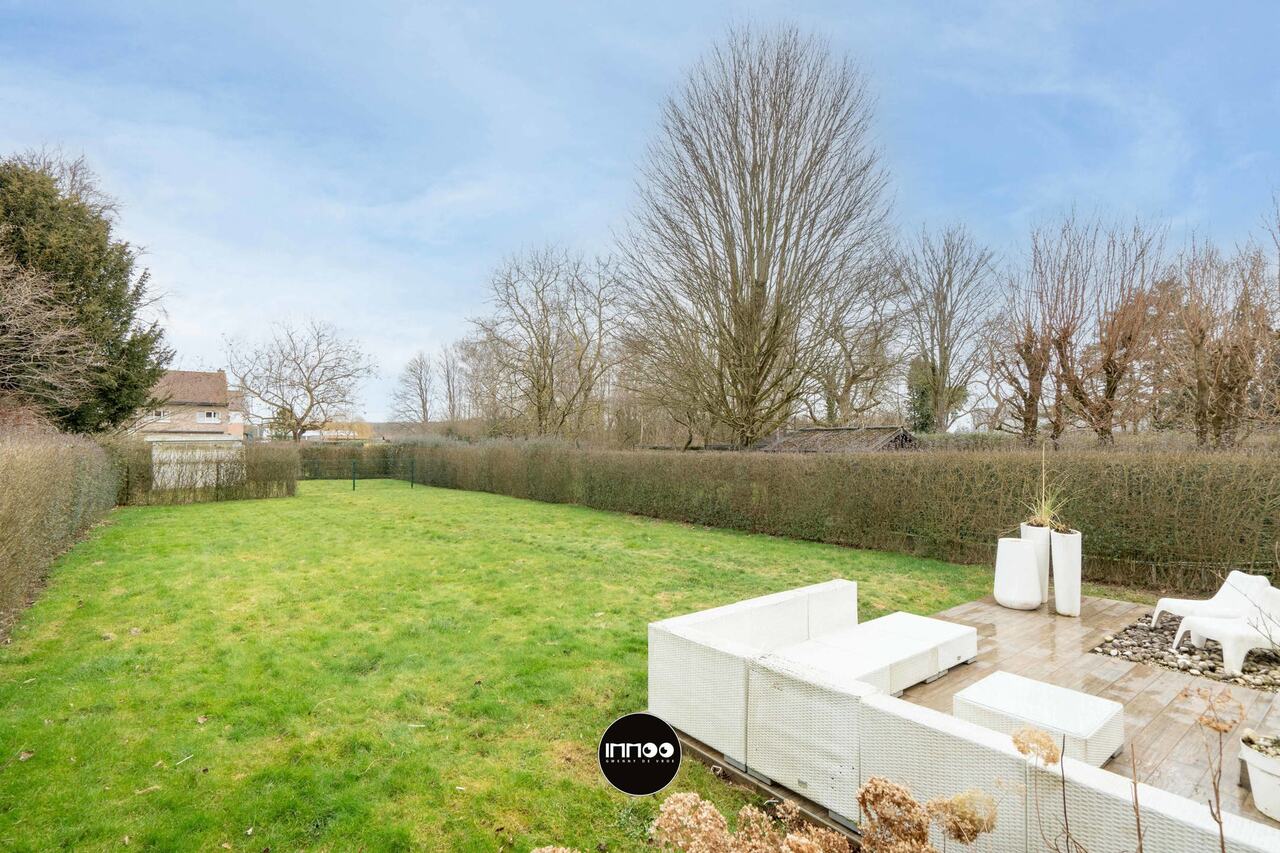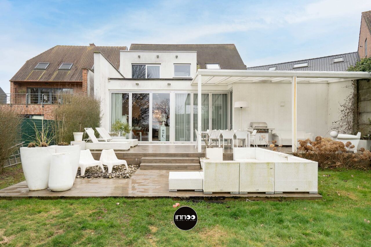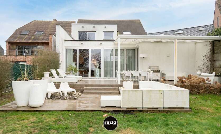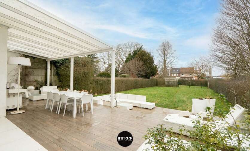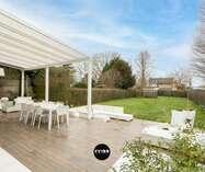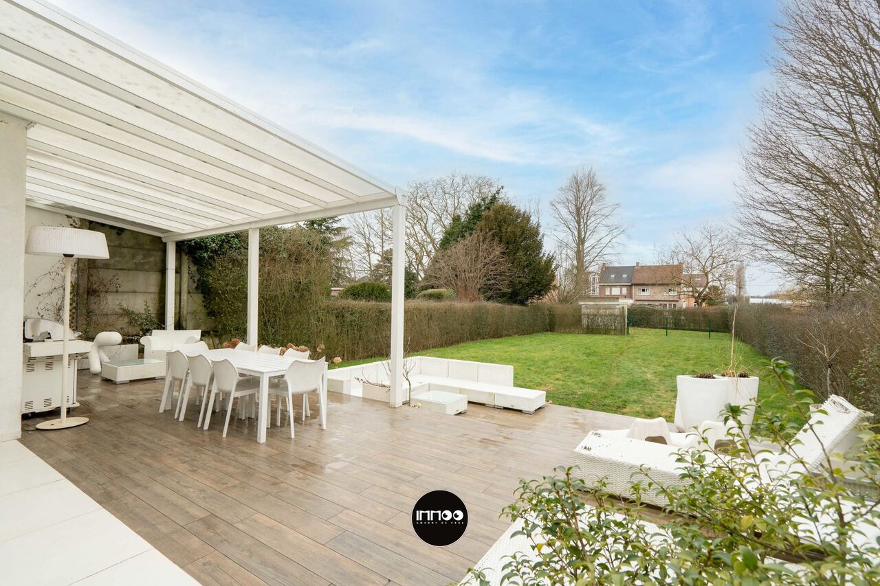 Verder op het gelijkvloers vindt u een strakke, moderne en volledig uitgeruste keuken met handig kookeiland. De eethoek loopt naadloos over in het salon, wat zorgt voor een open en gezellige leefruimte. Achteraan de woning is een ruim terras op twee niveaus, waarvan een groot deel overdekt is. Perfect om gasten te ontvangen en te genieten van een aperitief in het zonnetje. De ruime tuin, omgeven door bomen, geeft een landelijke uitstraling in het centrum van Kampenhout.