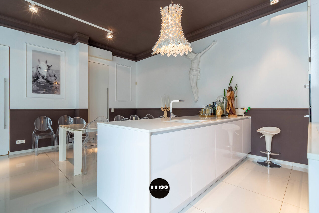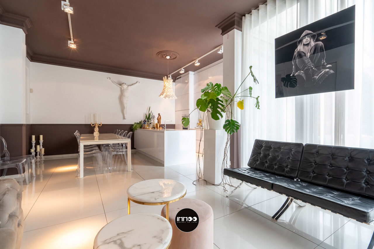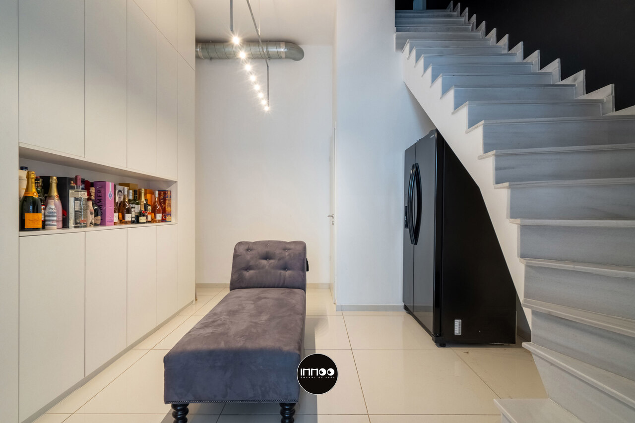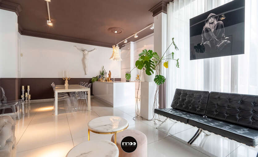 Bij binnenkomst valt direct de stijlvolle visgraat parketvloer op, die prachtig contrasteert met de strakke witte inkleding en houtbruine accenten. De hoge plafonds en het overvloedige natuurlijke licht zorgen voor een ruimtelijk gevoel.