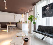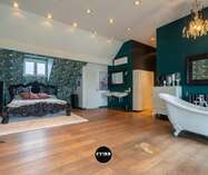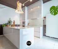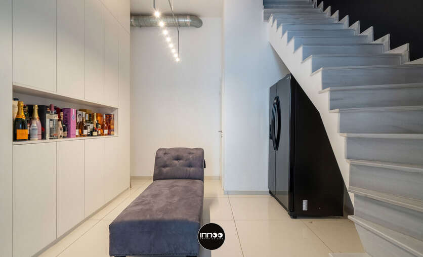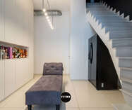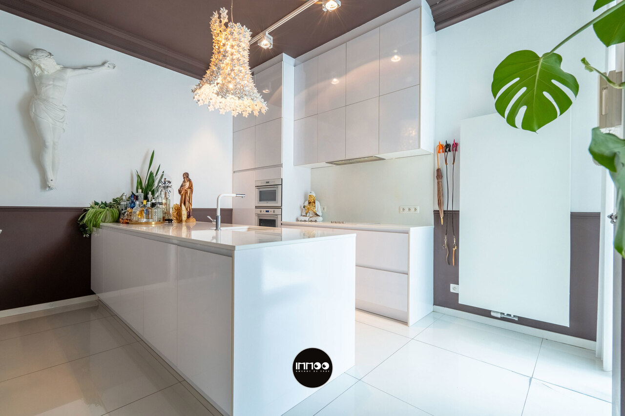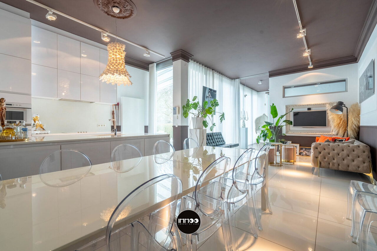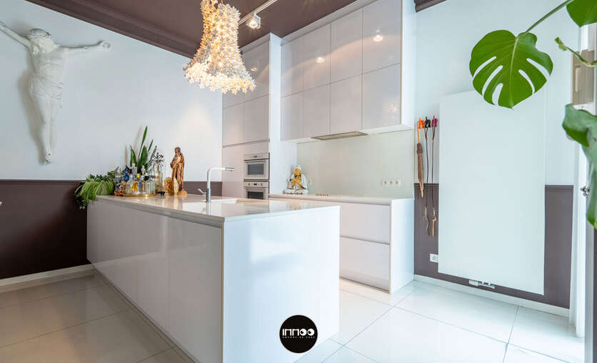 Bij binnenkomst valt direct de stijlvolle visgraat parketvloer op, die prachtig contrasteert met de strakke witte inkleding en houtbruine accenten. De hoge plafonds en het overvloedige natuurlijke licht zorgen voor een ruimtelijk gevoel.