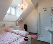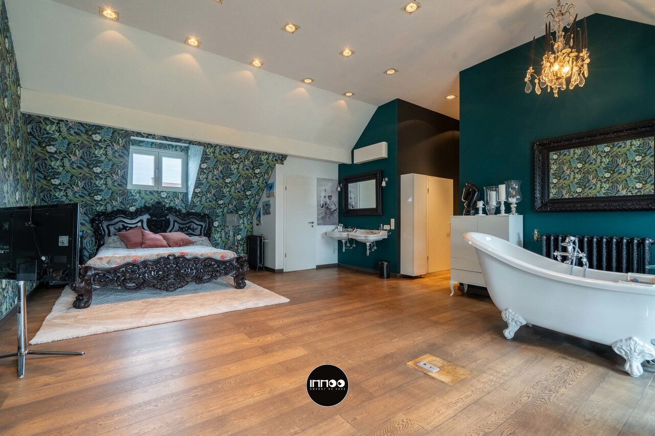 De eerste verdieping herbergt de master bedroom, een oase van rust met een ensuite badkamer voorzien van bad, douche en dubbele lavabo. Daarnaast is er een tweede slaapkamer met ensuite douche en lavabo, en een aparte toilet. De kamer waar momenteel de dressing voorzien is, kan ingericht worden als derde kamer. Een vierde kamer kan gecreëerd worden door de master bedroom op te splitsen met een gyproc wand.
