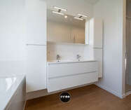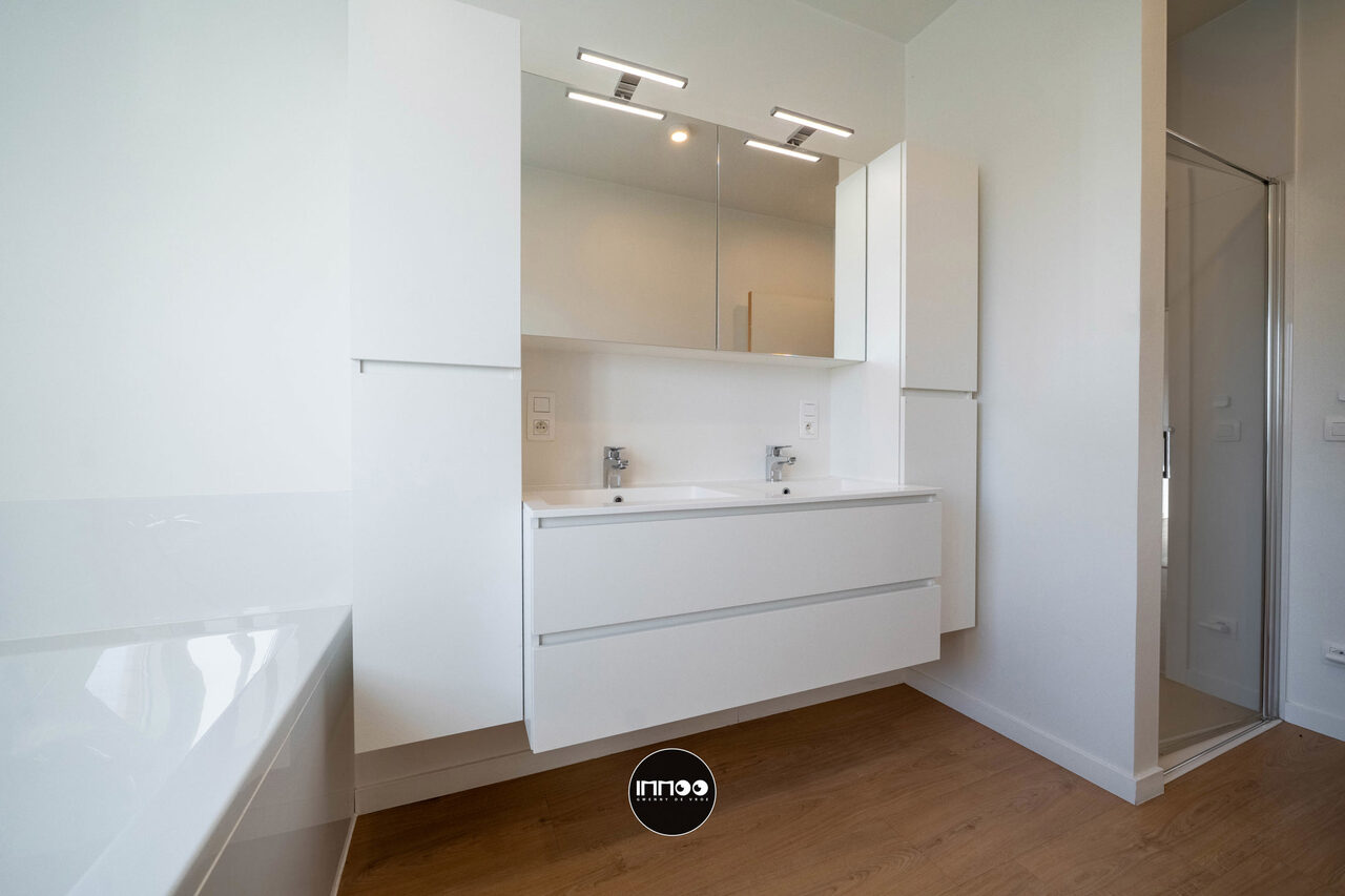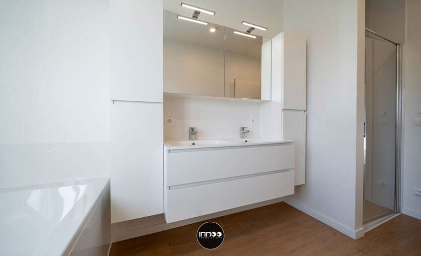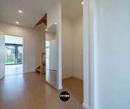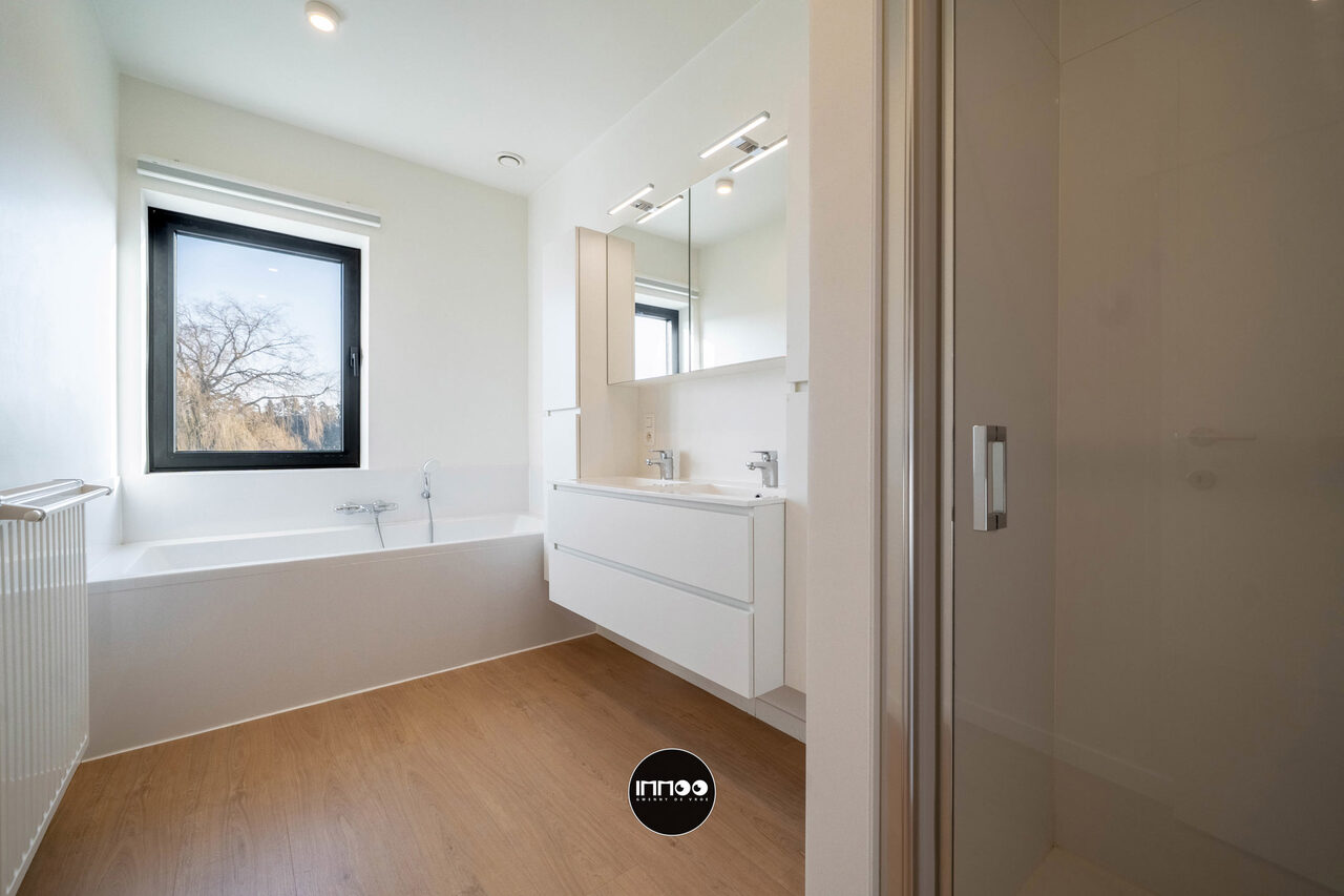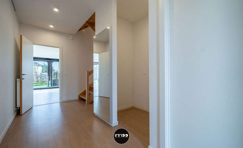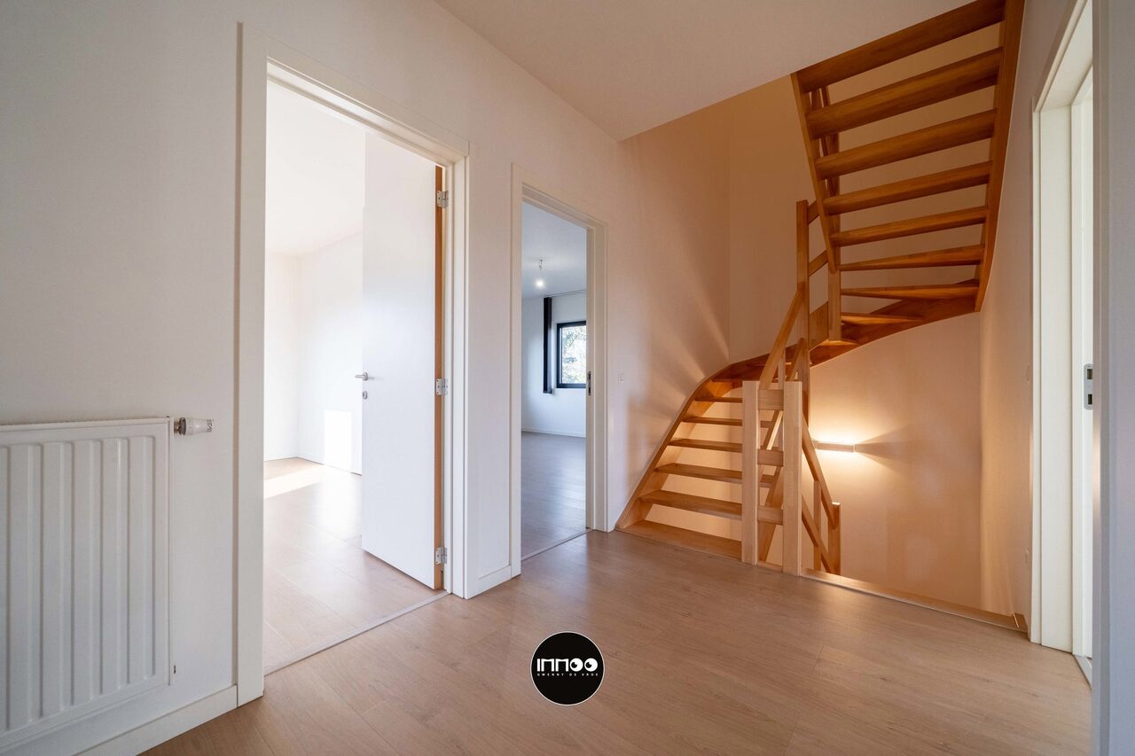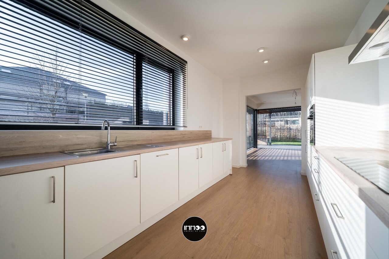 Bij het betreden van deze woning kom je in een aangename inkomhal die meteen een gevoel van ruimte en functionaliteit uitstraalt. Rechts bevindt zich een praktische wasruimte met aansluitingen en is er toegang tot de inpandige garage. De ruime garage biedt plaats voor een wagen en extra opbergruimte. Verder vind je een vestiaireruimte en een gastentoilet. Via de trappenhal kom je in de open leefruimte waar licht en ruimte centraal staan. De mooie open living baadt in het daglicht dankzij de grote raampartijen en sluit links naadloos aan op de volledig uitgeruste keuken, die eveneens geniet van een overvloed aan natuurlijk licht.